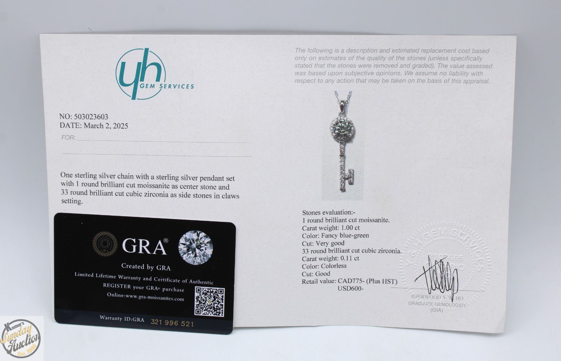 1.00 CARAT GRA CERTIFIED ROUND BRILLIANT CUT MOISSANITE KEY SHAPE NECKLACE, WITH 33 BRILLIANT CUT CUBIC ZIRCONIA - APPRAISED REPLACEMENT VALUE CAD 775