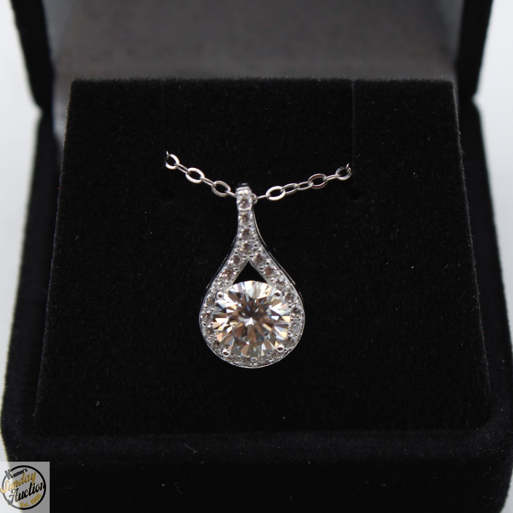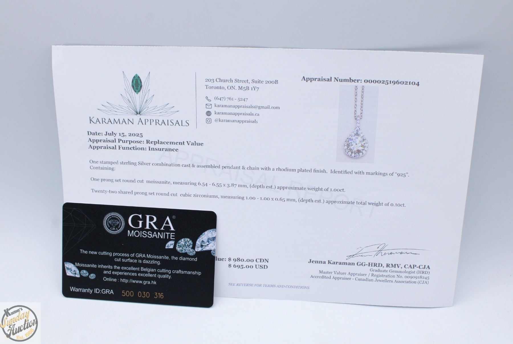 1.00 CARAT GRA CERTIFIED ROUND BRILLIANT CUT MOISSANITE, WITH 22 ROUND CUT CUBIC ZIRCONIA, IN TEAR DROP HALO SET IN 925 STERLING SILVER PENDANT - APPRAISED REPLACEMENT CALUE CAD 775