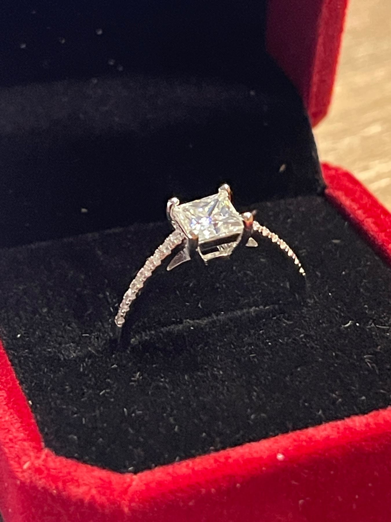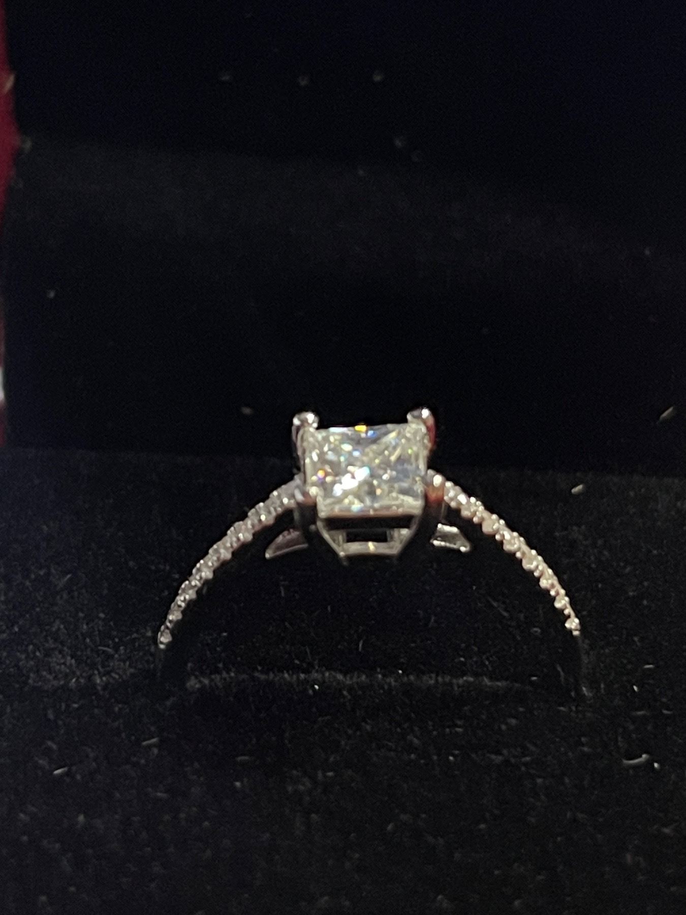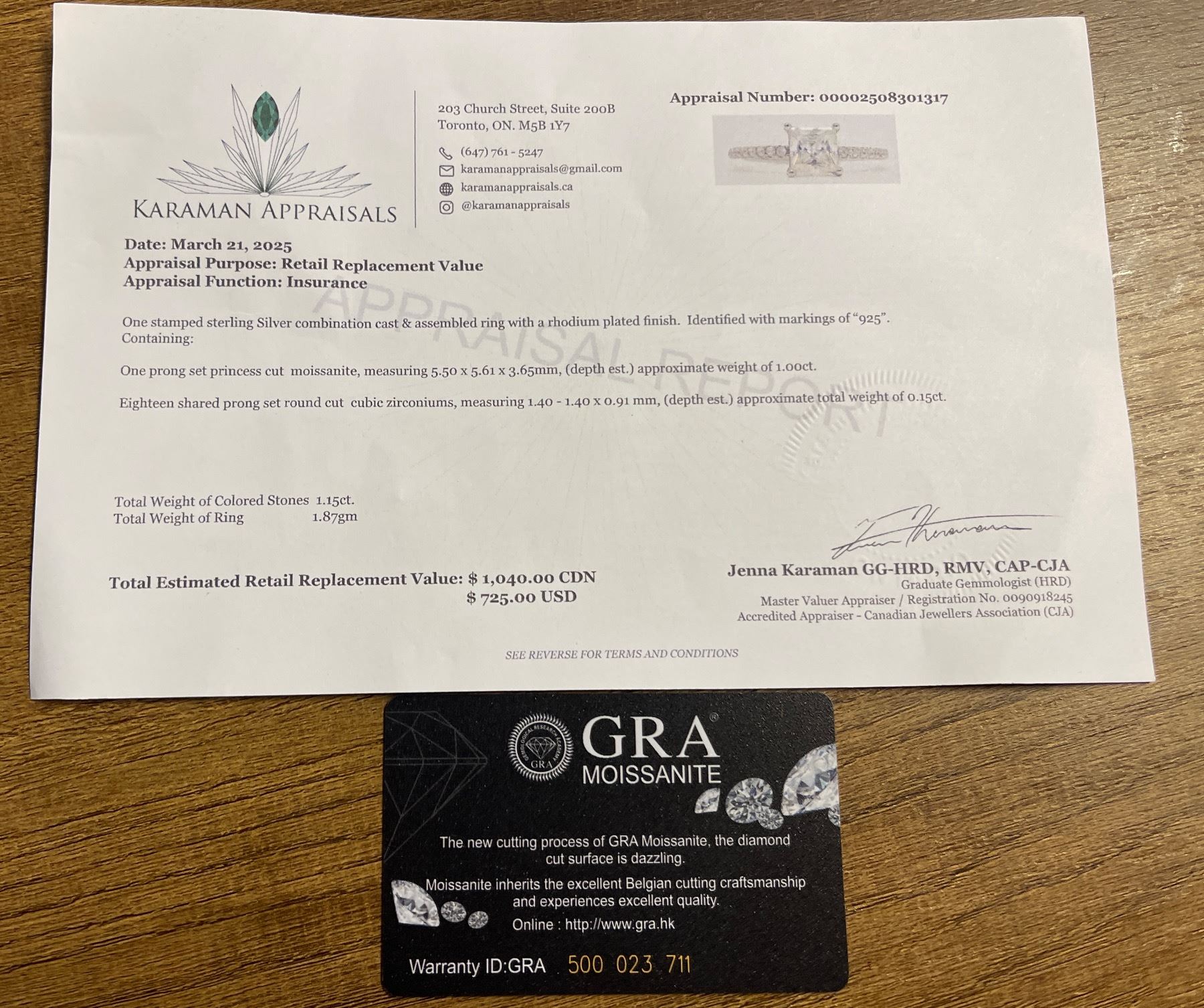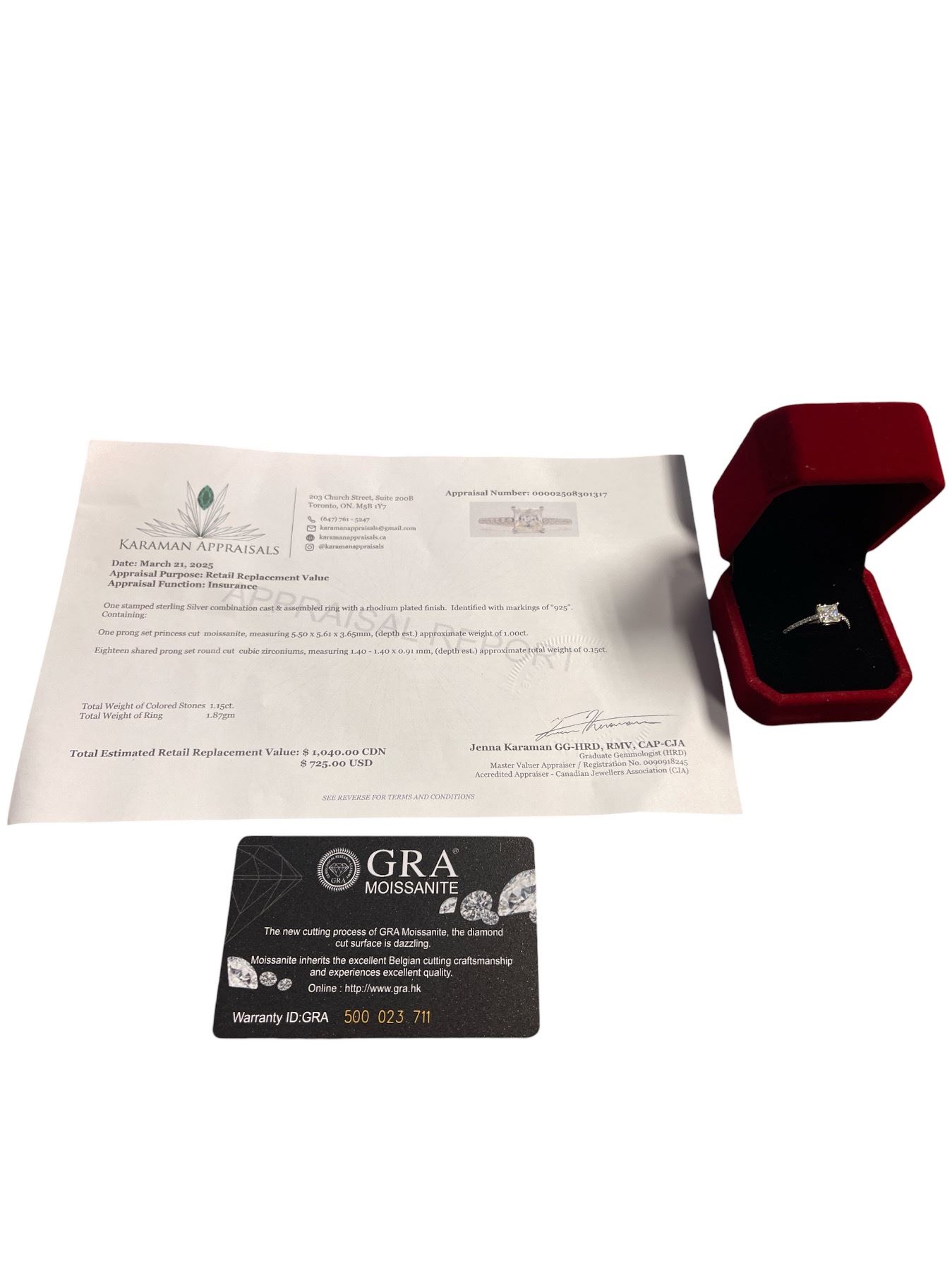 1.00 CT GRA CERTIFIED PRINCESS CUT MOISSANITE STONE VVS D COLOR WITH 18 ROUND BRILLIANT CUT CUBIC ZIRCONIA STONES SET IN SHANKS SET IN 925 SILVER RING SIZE 7.5 RETAIL VALUE $1,040.00