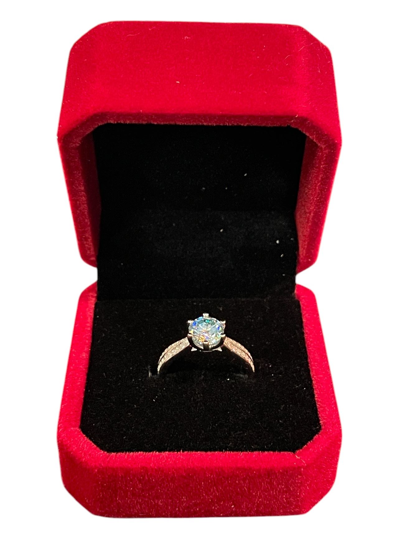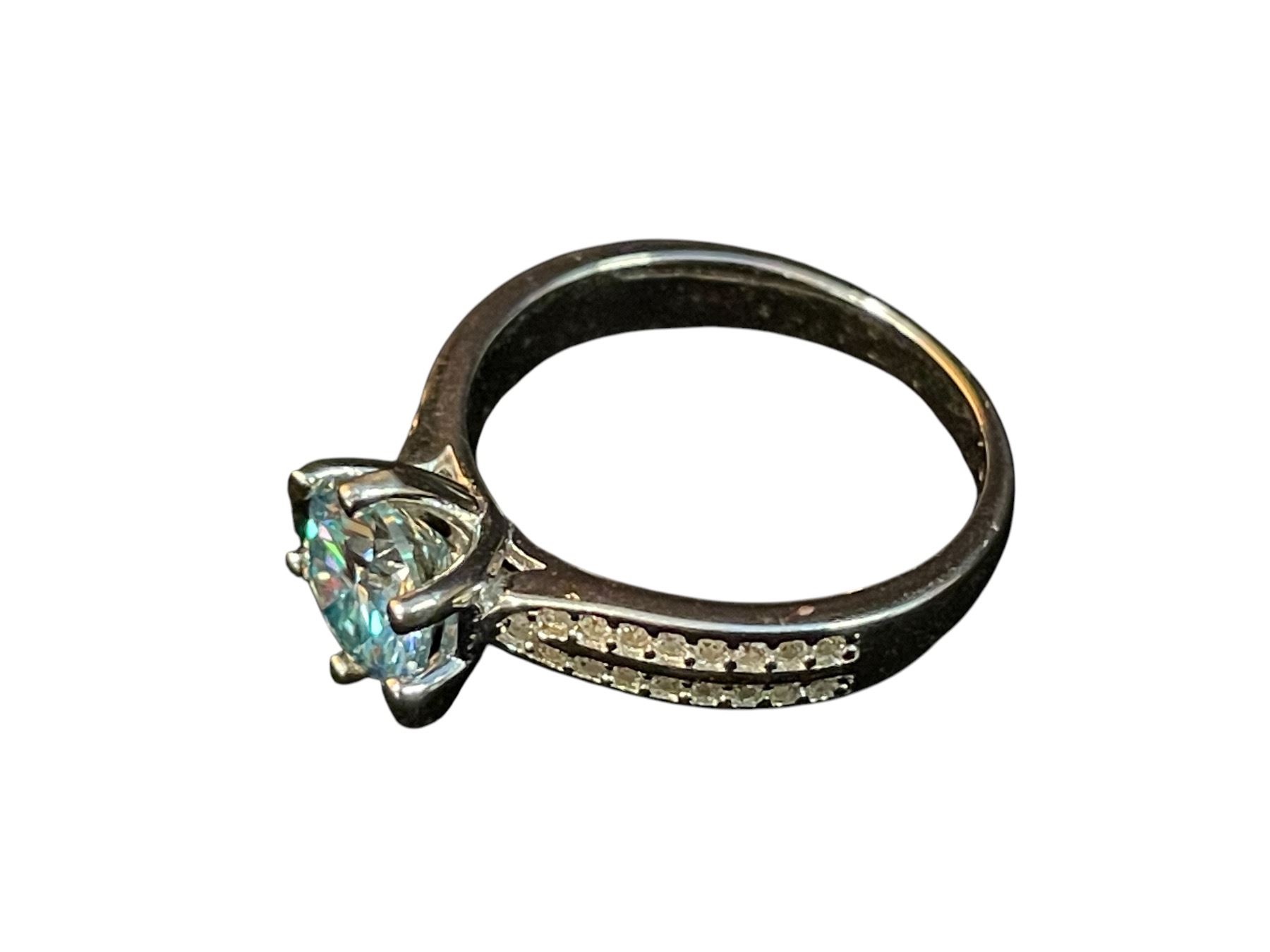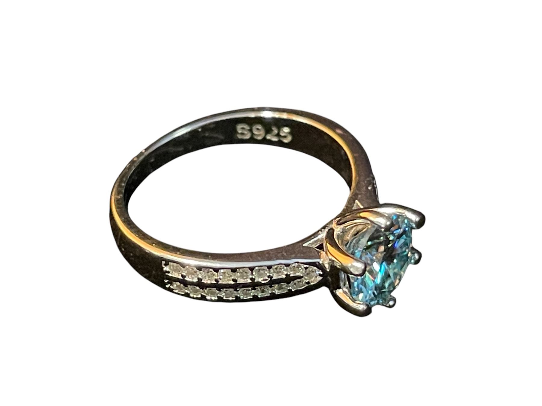 1.00 CT GRA CERTIFIED ROUND BRILLIANT CUT MOISSANITE STONE VVS BLUE COLOR WITH 34 ROUND BRILLIANT CUT CUBIC ZIRCONIA SET IN SHANKS SET IN 925 SILVER RING SIZE 5