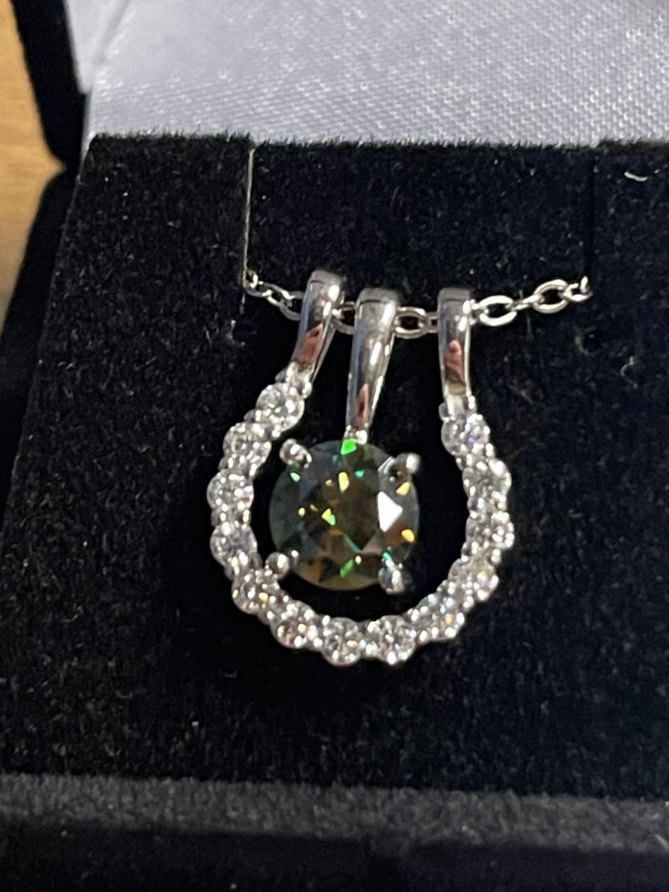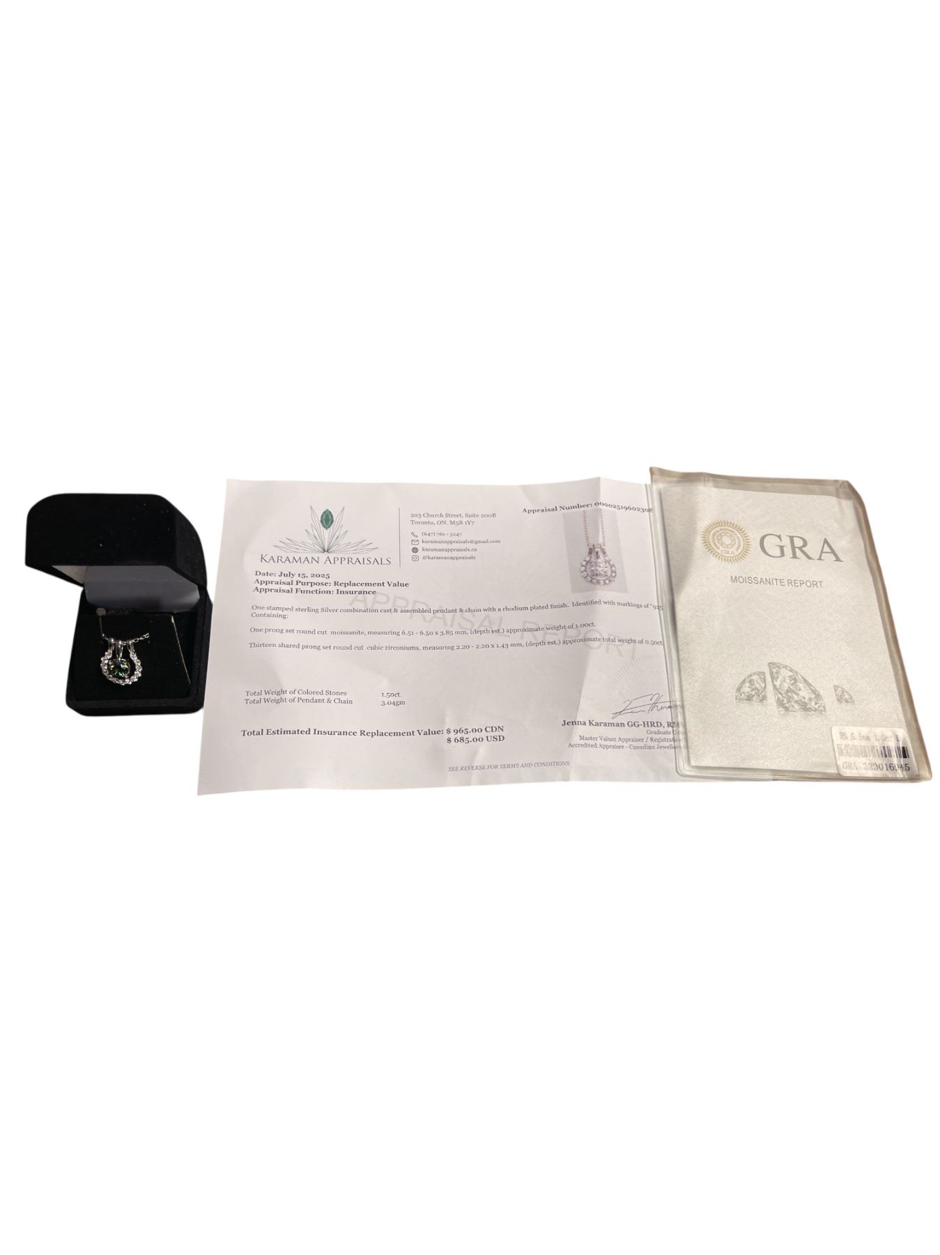 1.00 CT GRA CERTIFIED ROUND BRILLIANT CUT MOISSANITE STONE VVS D COLOR FLOATING IN CENTER WITH 13 ROUND BRILLIANT CUT CUBIC ZIRCONIA SET IN ROUND PARTIAL HALO SET IN 925 SILVER PENDANT RETAIL VALUE $965.00