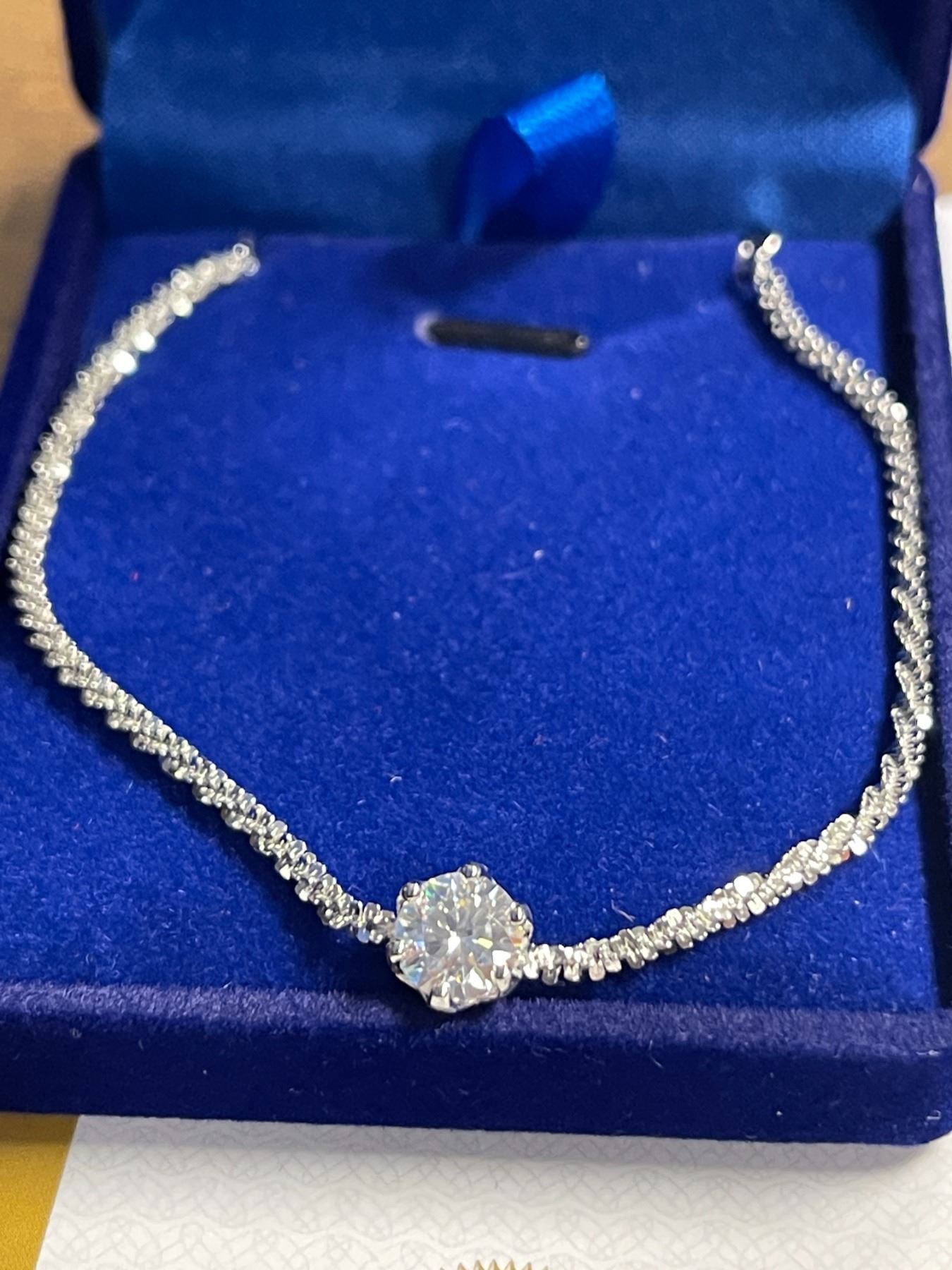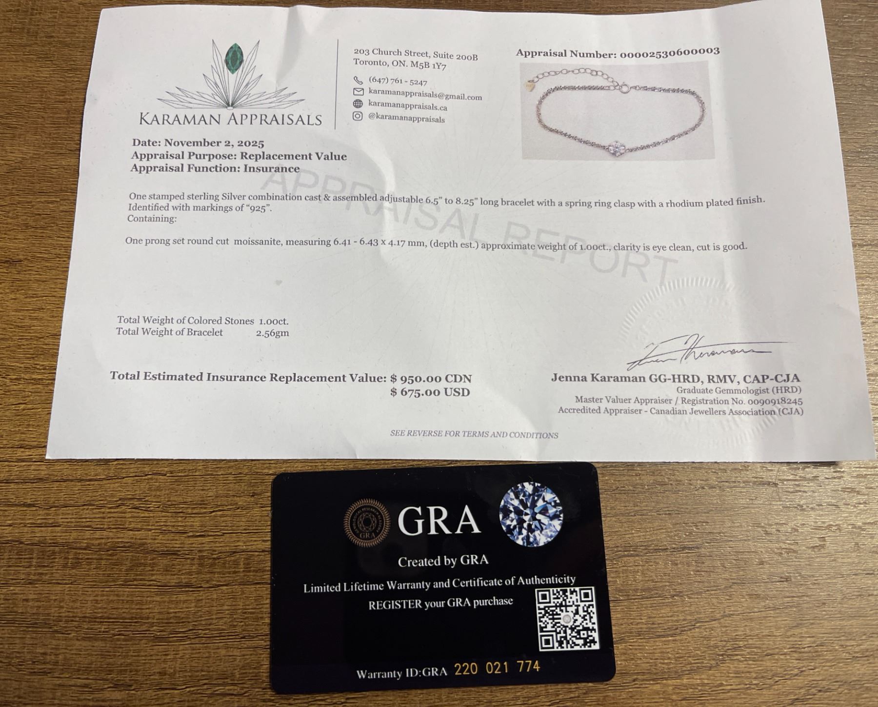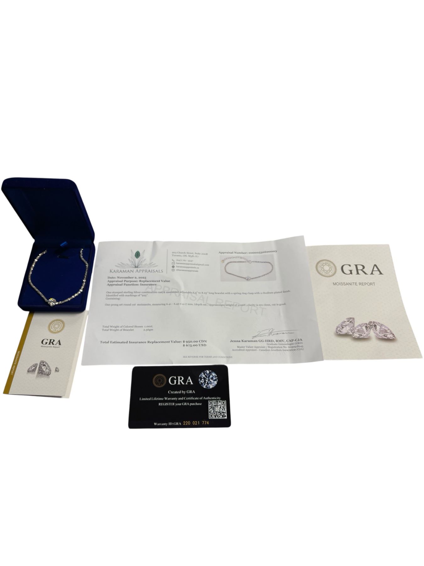 1.00 CT GRA CERTIFIED ROUND BRILLIANT CUT MOISSANITE STONE VVS D COLOR SET IN 6 CLAW FILAGREE HEAD SET IN 925 SILVER BRACELET RETAIL VALUE $950.00