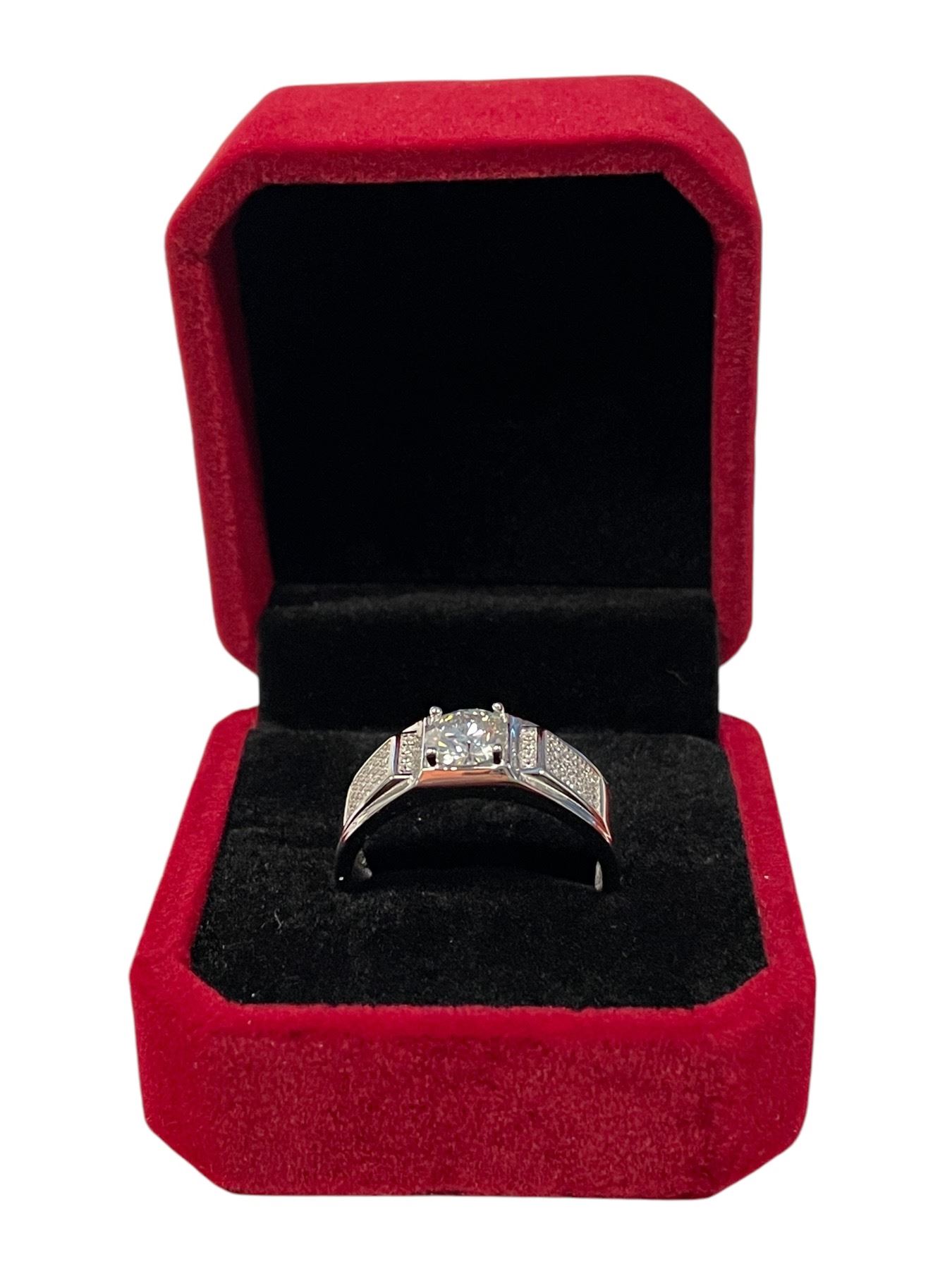 1.00 CT GRA Certified Round Brilliant Cut Moissanite Stone VVS D Color Set In Center With 56 Round Cut Cubic Zirconia Set In The Shoulders Set In 925 Silver Ring Retail Value $1,035.00