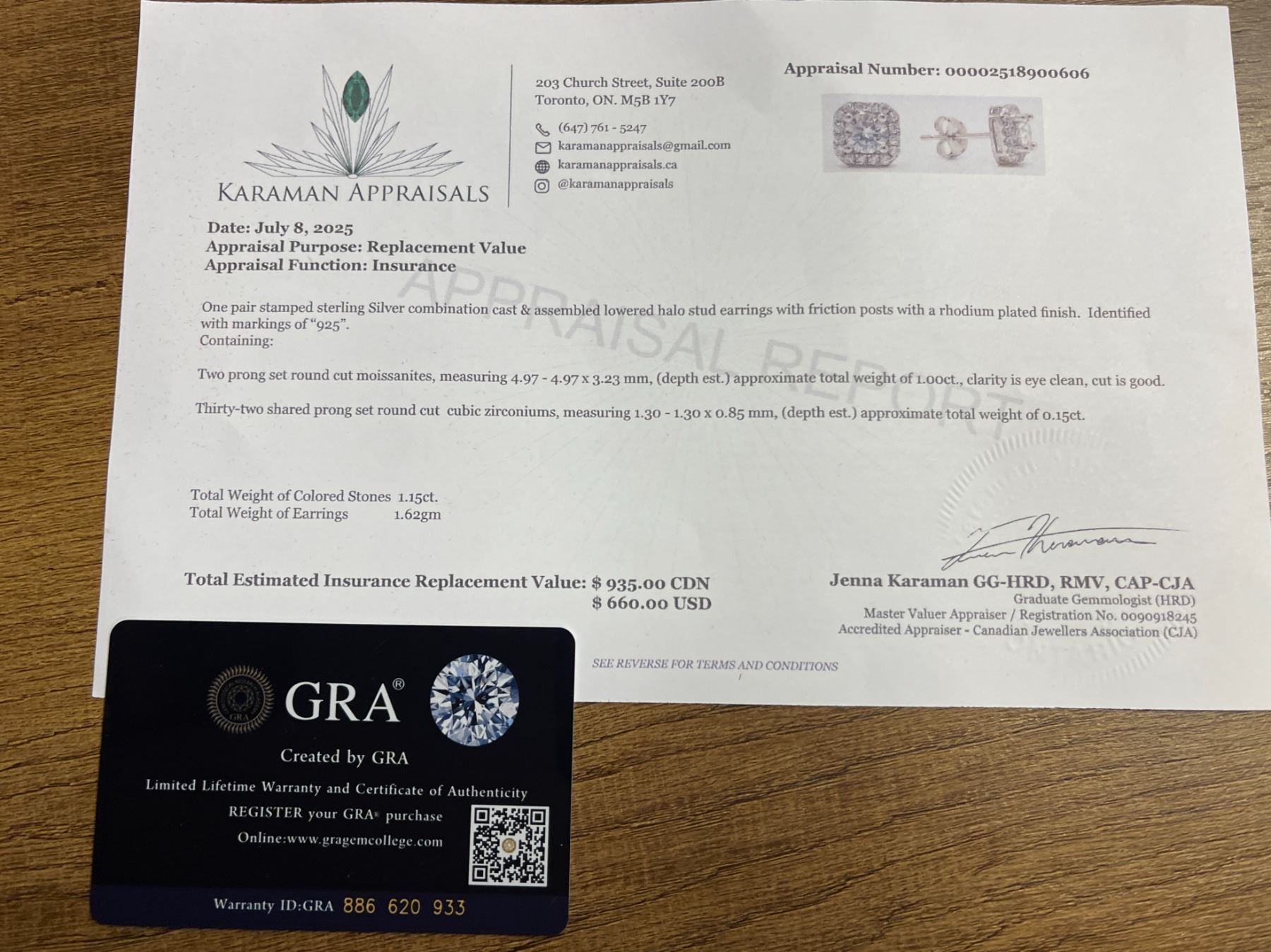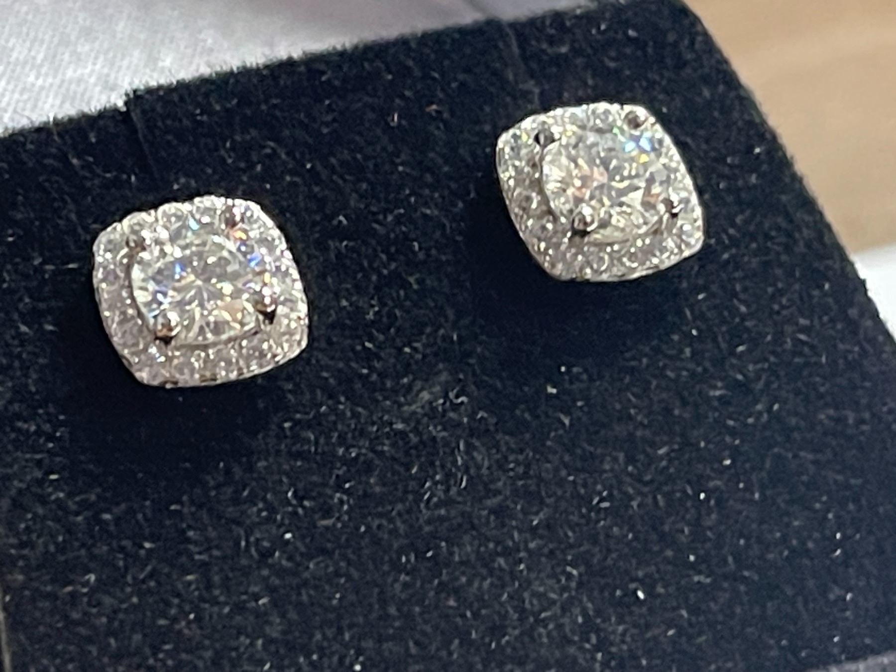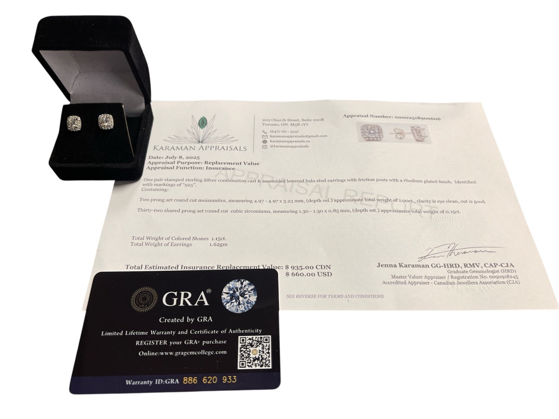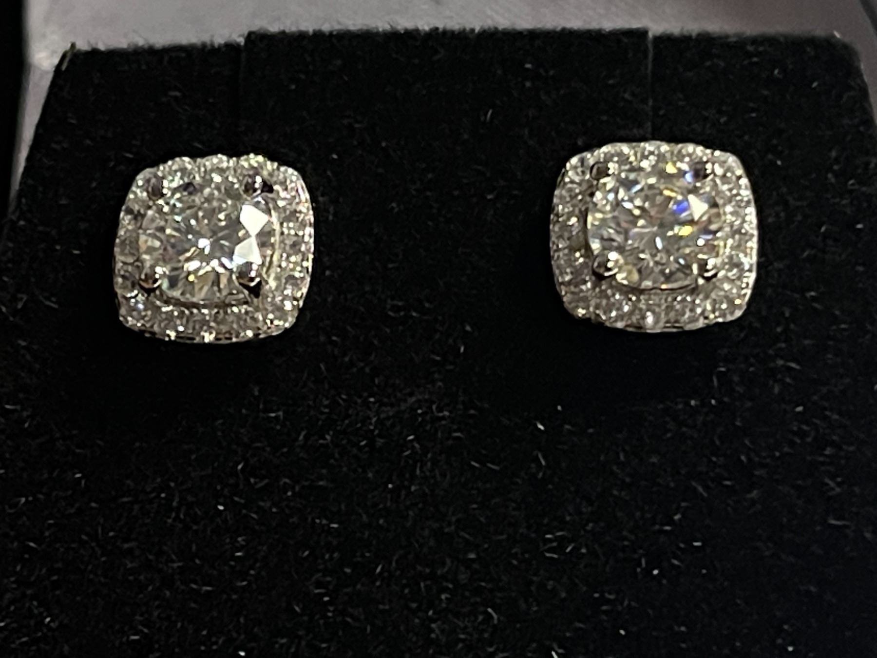 1.00 CT TW GRA CERTIFIED ROUND BRILLIANT CUT MOISSANITE STONES VVS D COLOR WITH 32 ROUND BRILLIANT CUT CUBIC ZIRCONIA SET IN SQUARE HALO SET IN 925 SILVER EARRINGS RETAIL VALUE $935.00
