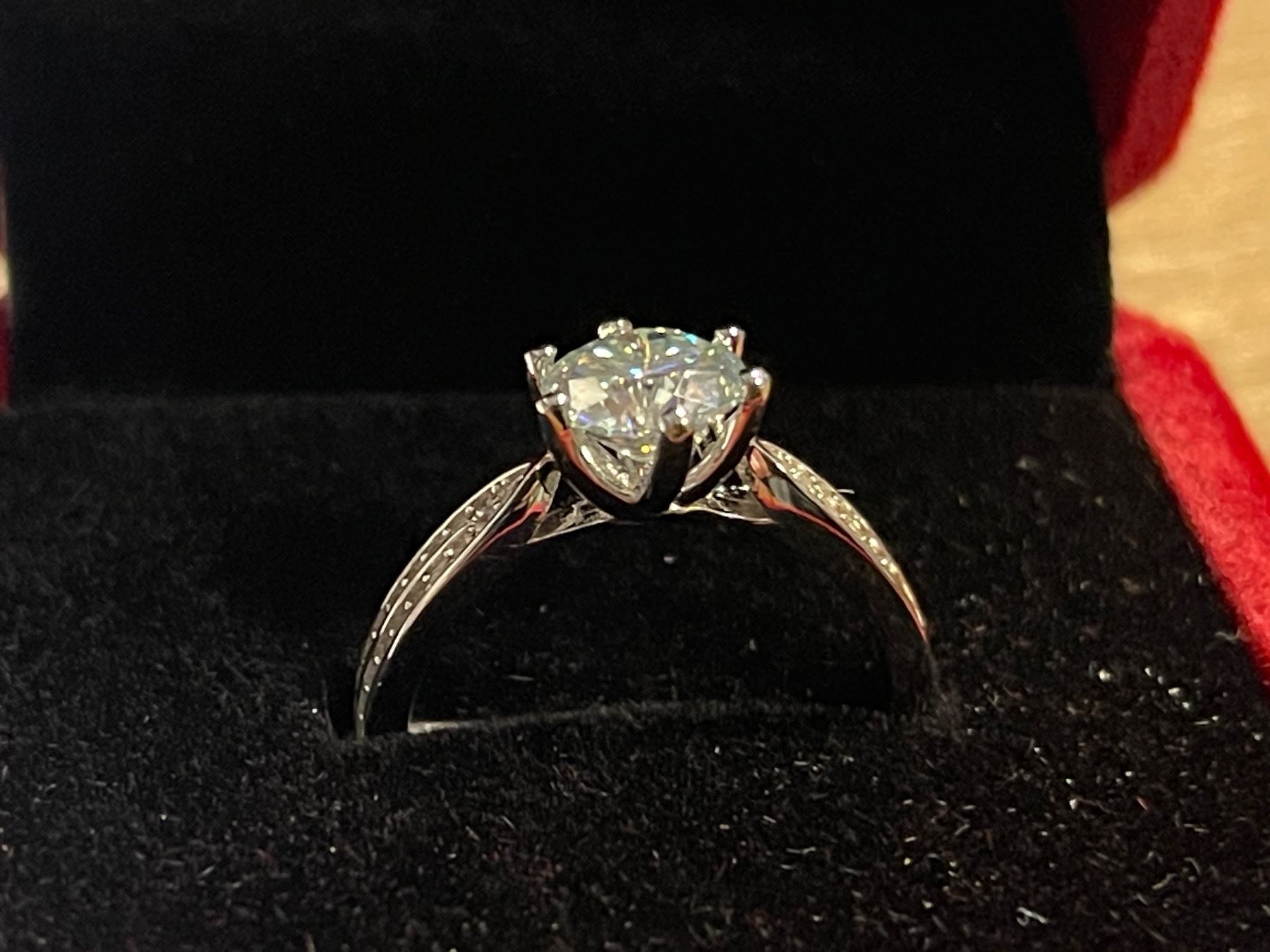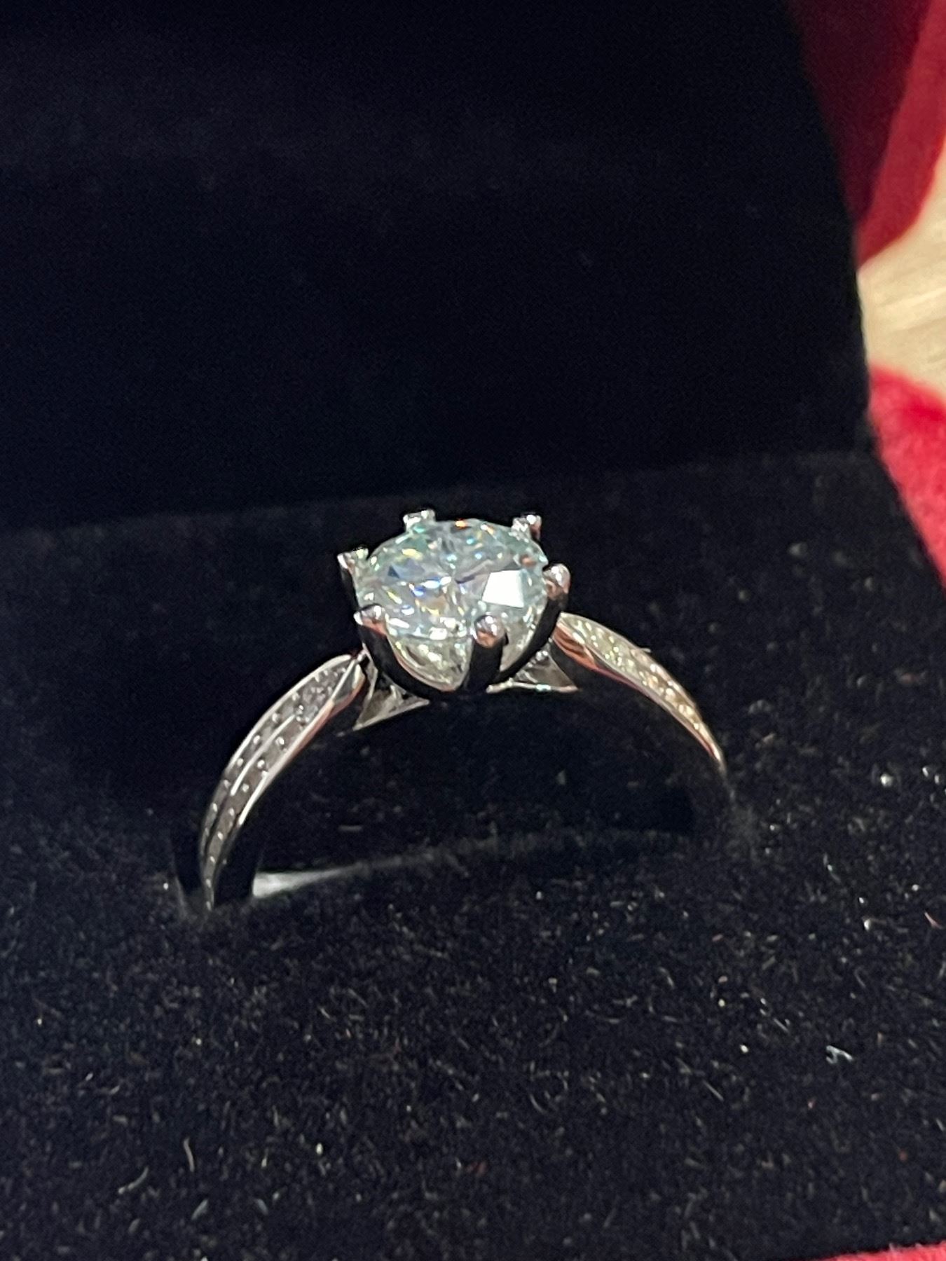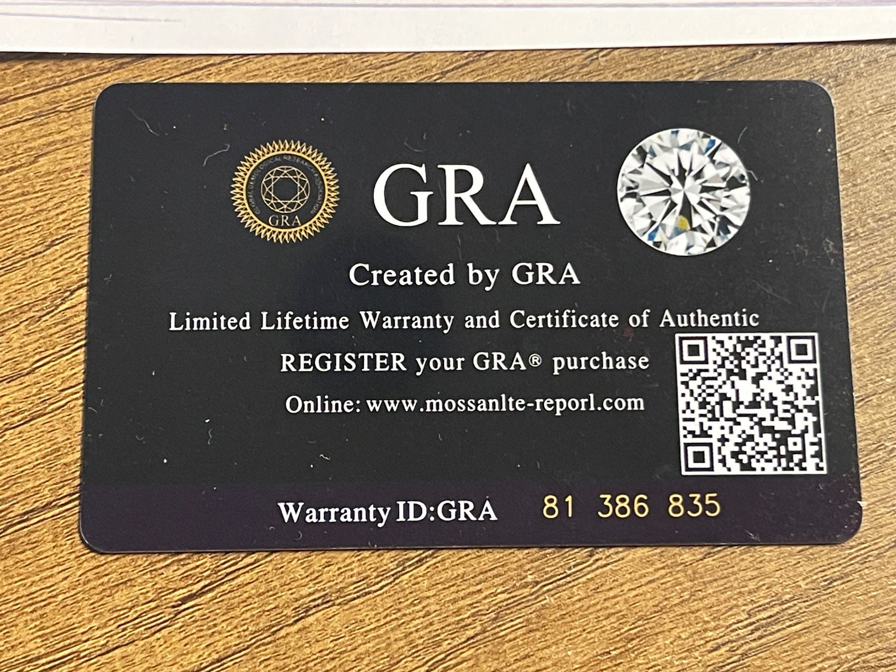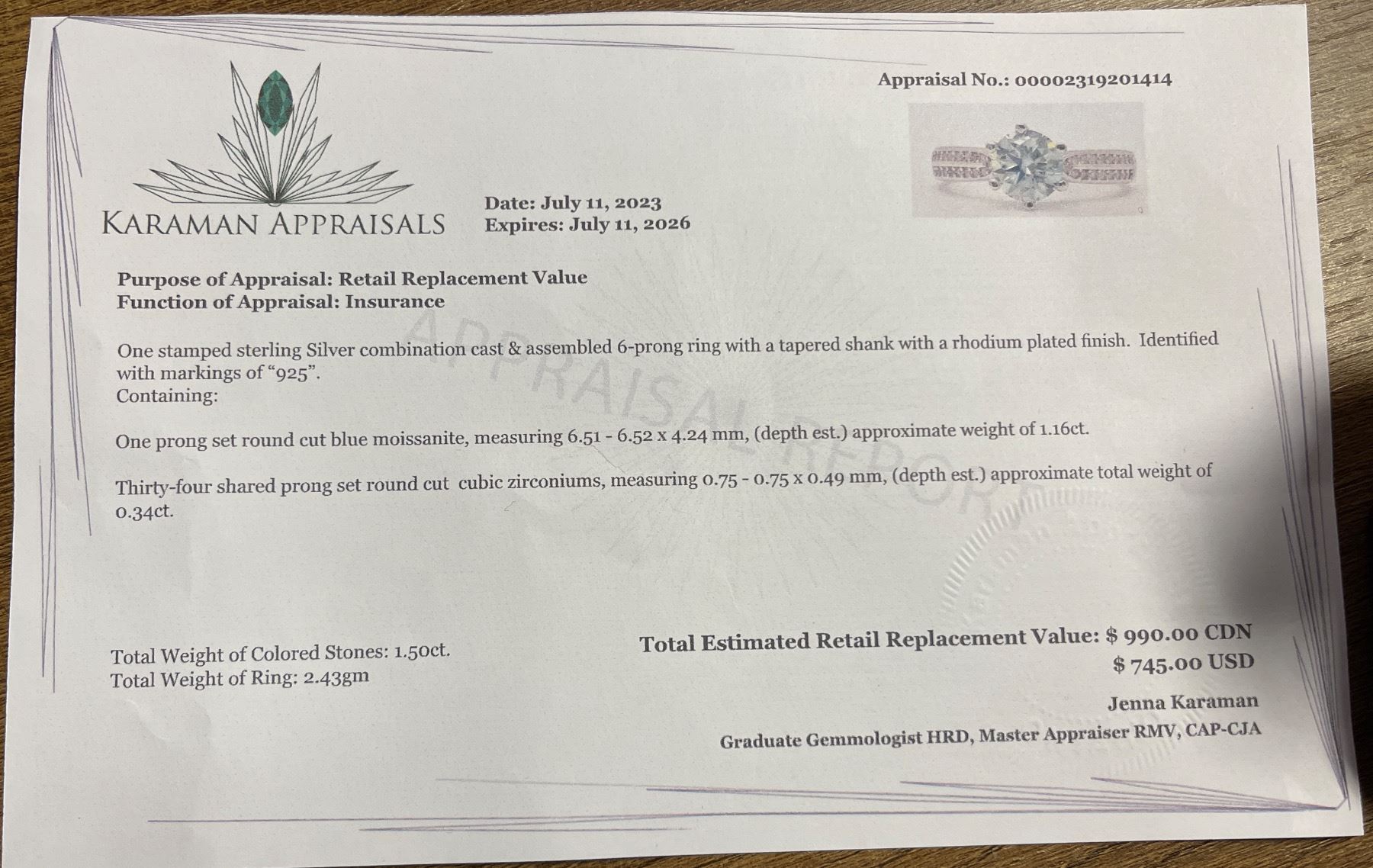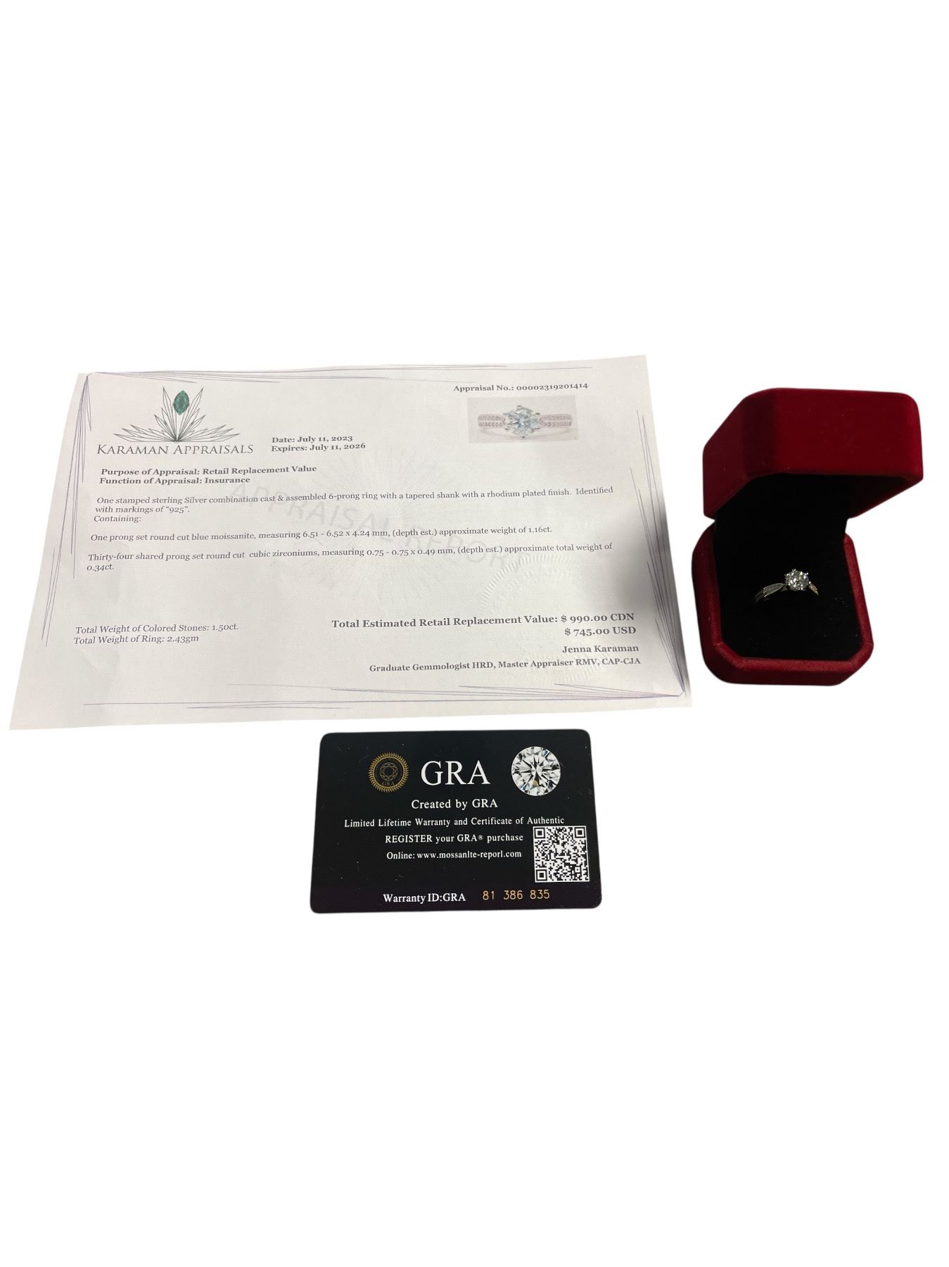 1.16 CT GRA CERTIFIED ROUND BRILLIANT CUT MOISSANITE STONE VVS BLUE COLOR WITH 34 ROUND BRILLIANT CUT CUBIC ZIRCONIA STONES SET IN SHANKS SET IN 925 SILVER RING SIZE 5 RETAIL VALUE $990.00
