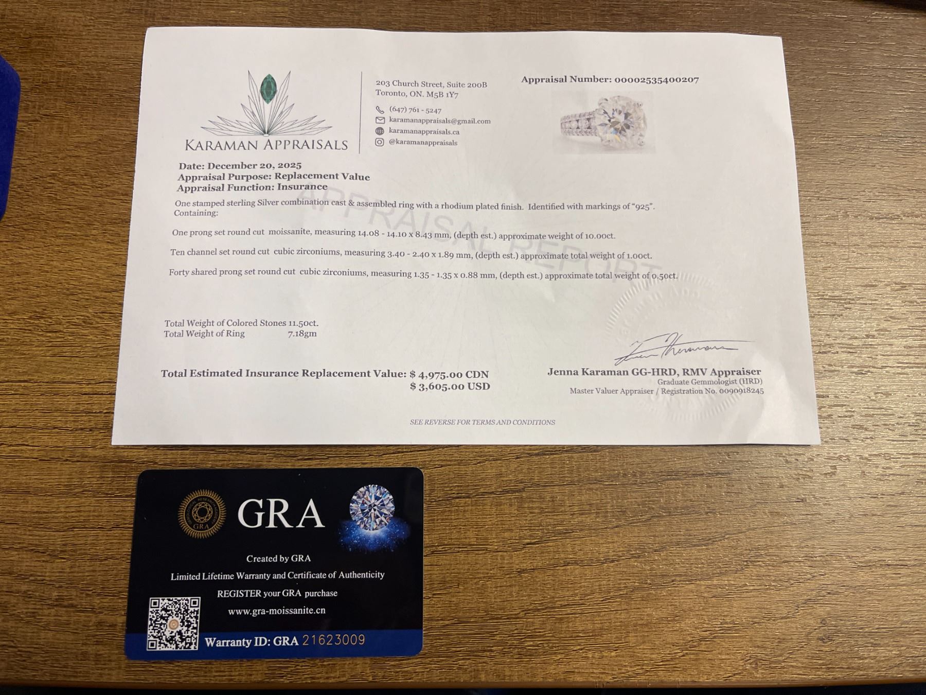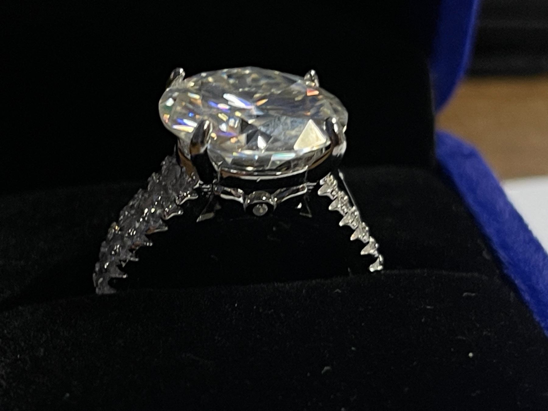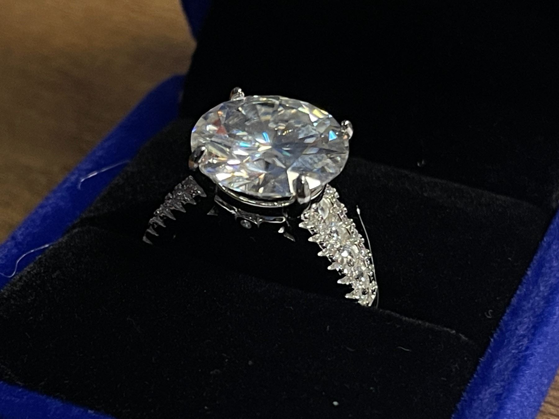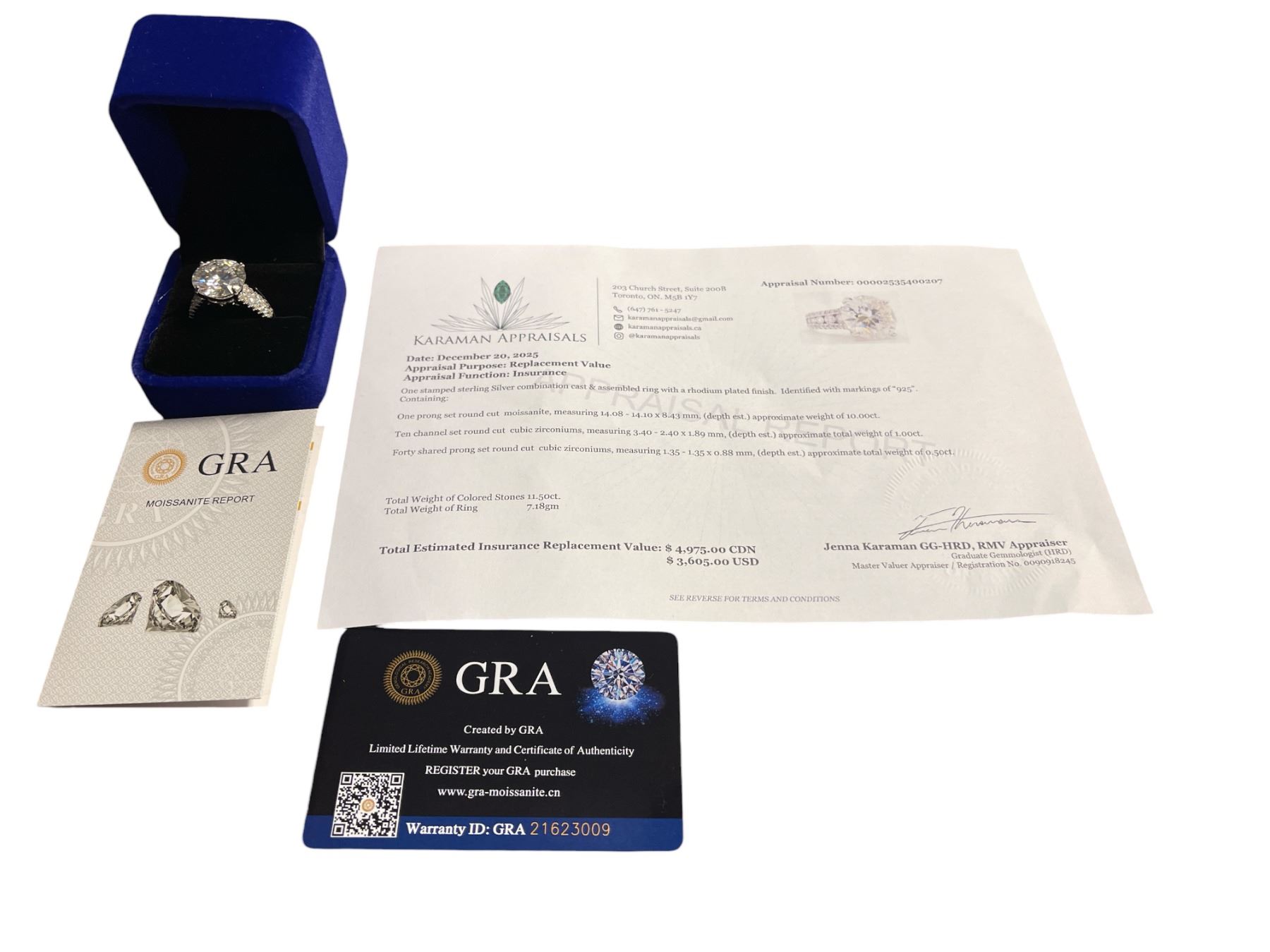 10.00 CT GRA CERTIFIED ROUND BRILLIANT CUT MOISSANITE STONE VVS D COLOR WITH 10 GRADUATING ROUND BRILLIANT CUT CUBIC ZIRCONIA STONES SET IN SHANK WITH 40 CUBIC ZIRCONIA SET IN 925 SILVER RING SIZE 8 RETAIL VALUE $4,975.00