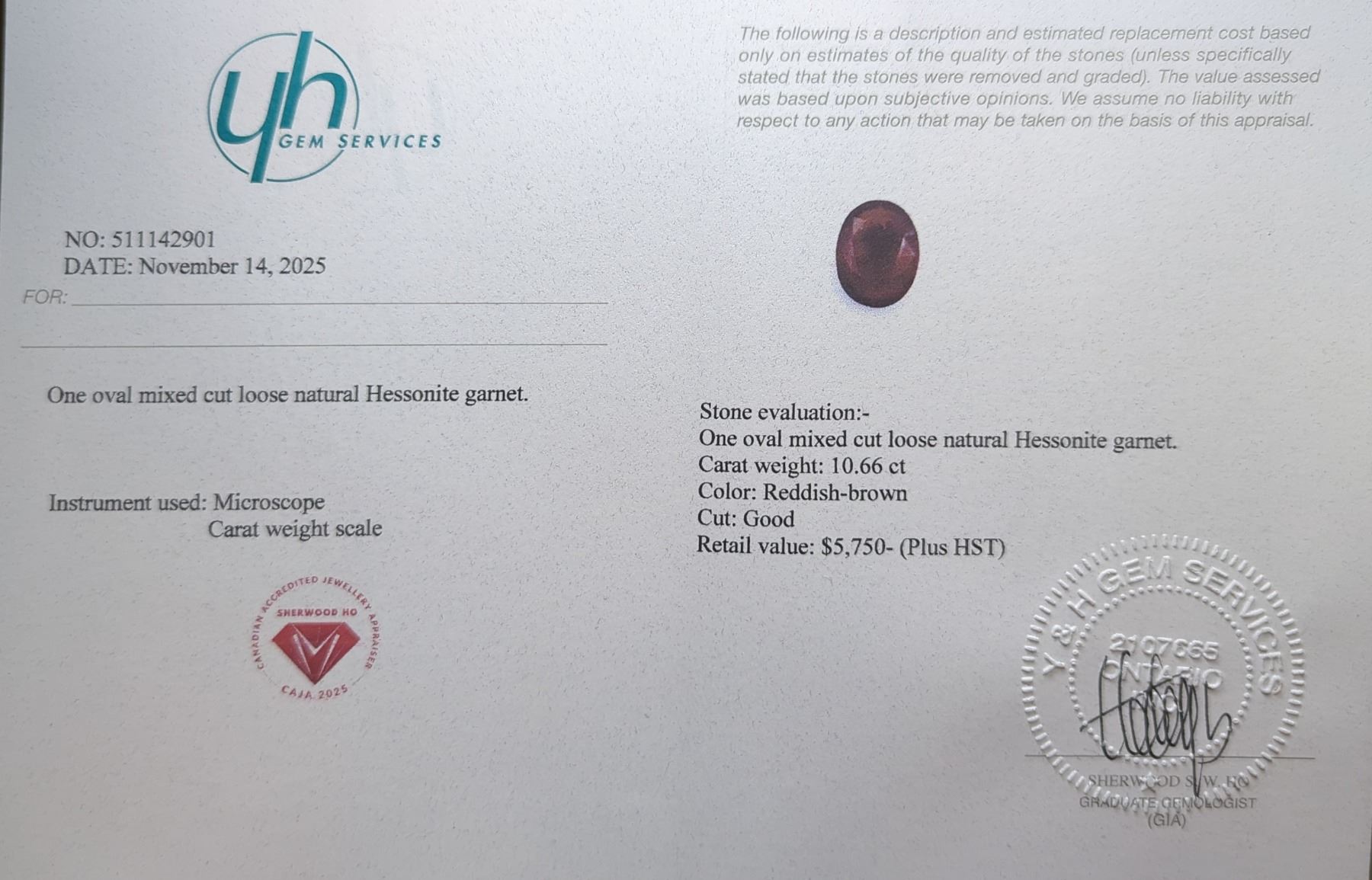 10.66 ct Certified Hessonite Garnet gemstone ($5,750 Appraisal)