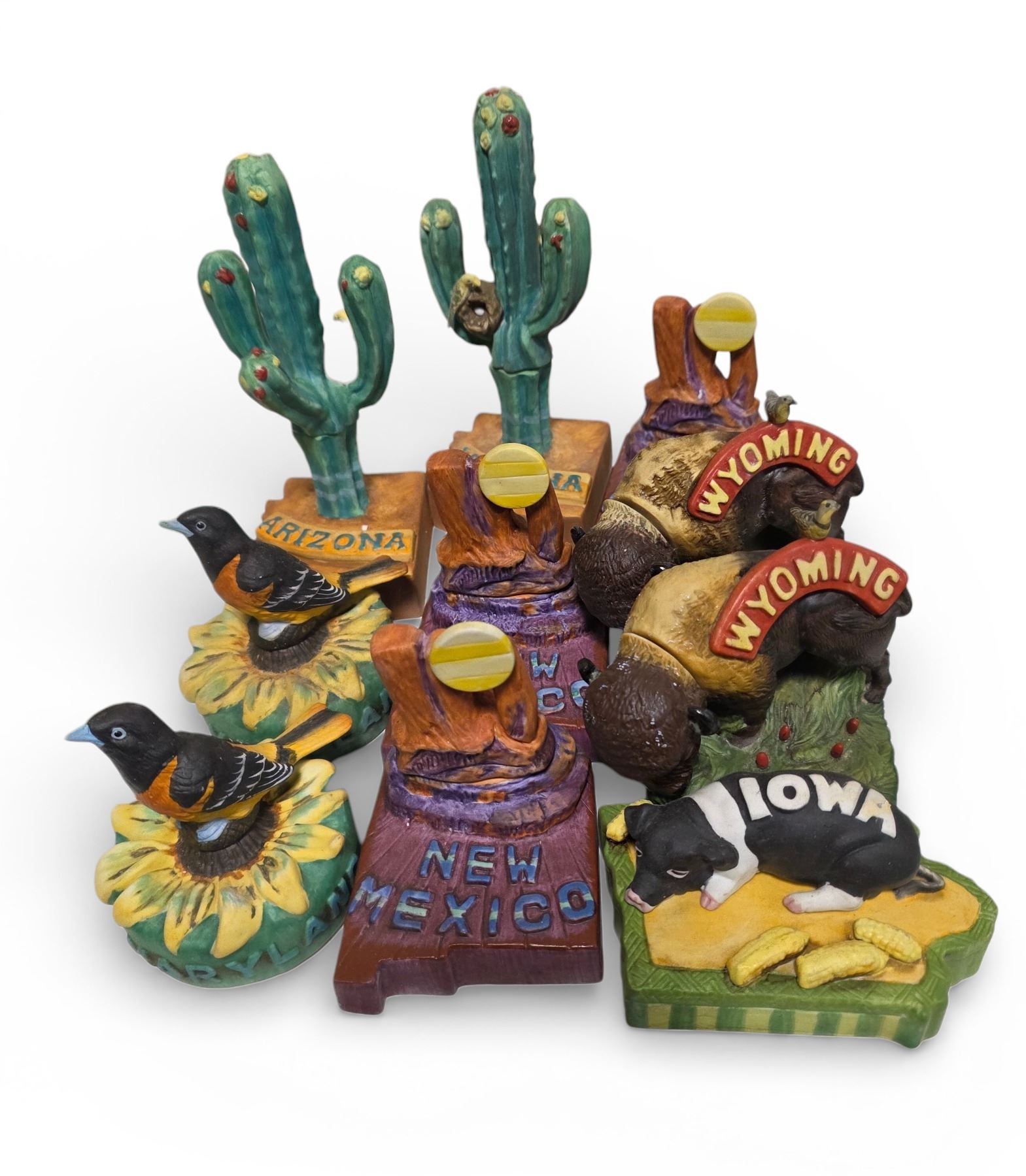 10 State Mini Series Ceramic Figurine Empty Decanters - Arizona, New Mexico, Wyoming, Iowa, Maryland