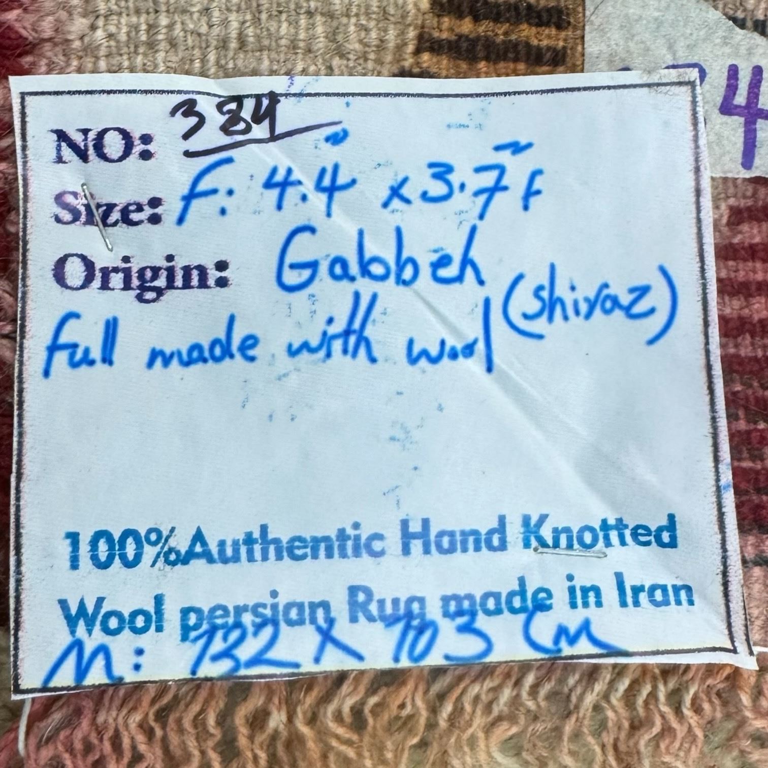 100% Hand Knotted Made in Iran 4'4"c3'7" Gabbeh Region Shiraz Wool Rug (384)
