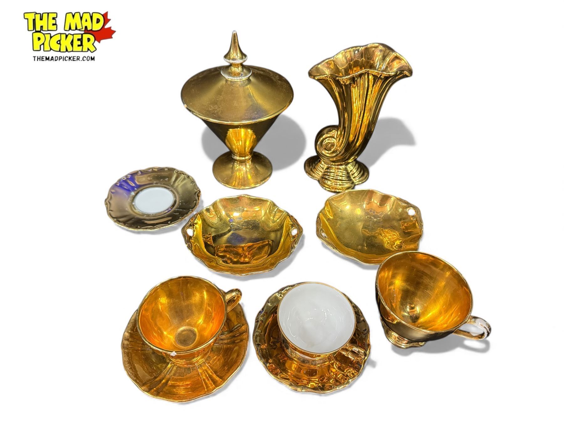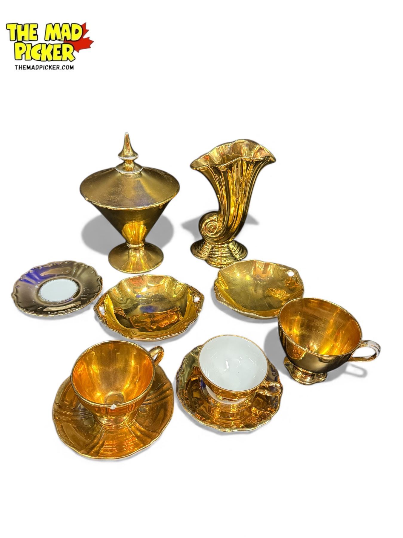 10pcs Of Vintage Lustre Ware: Vase, Teacups, SAucers, & Bowls