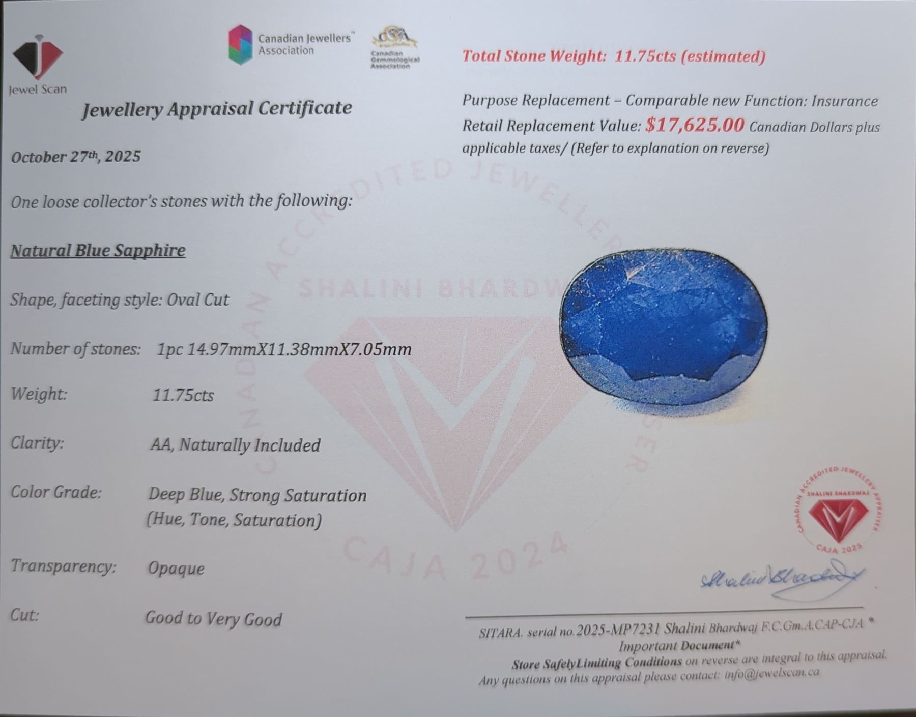 11.75 ct Certified Midnight Sapphire gemstone ($17,625 Appraisal)