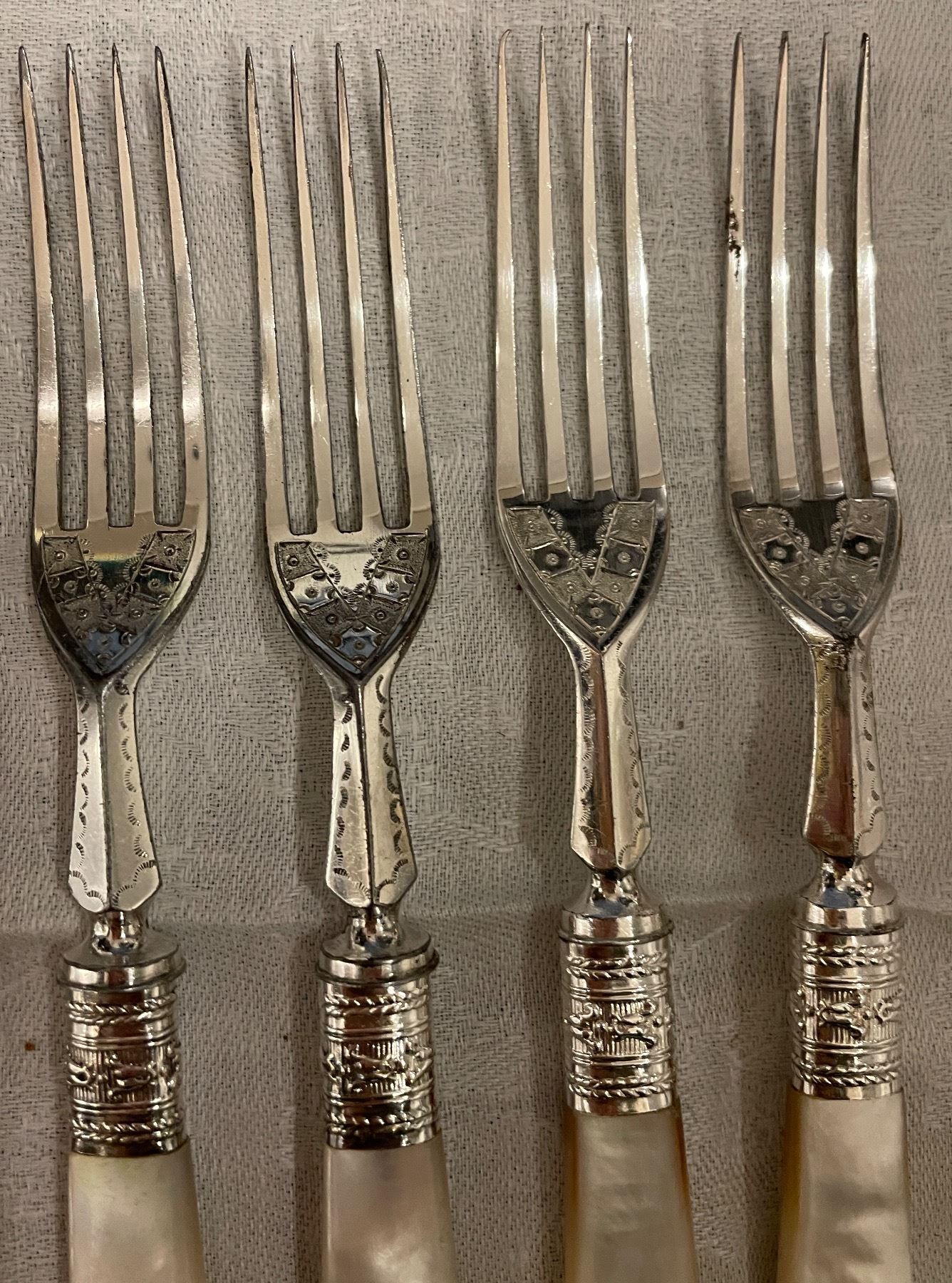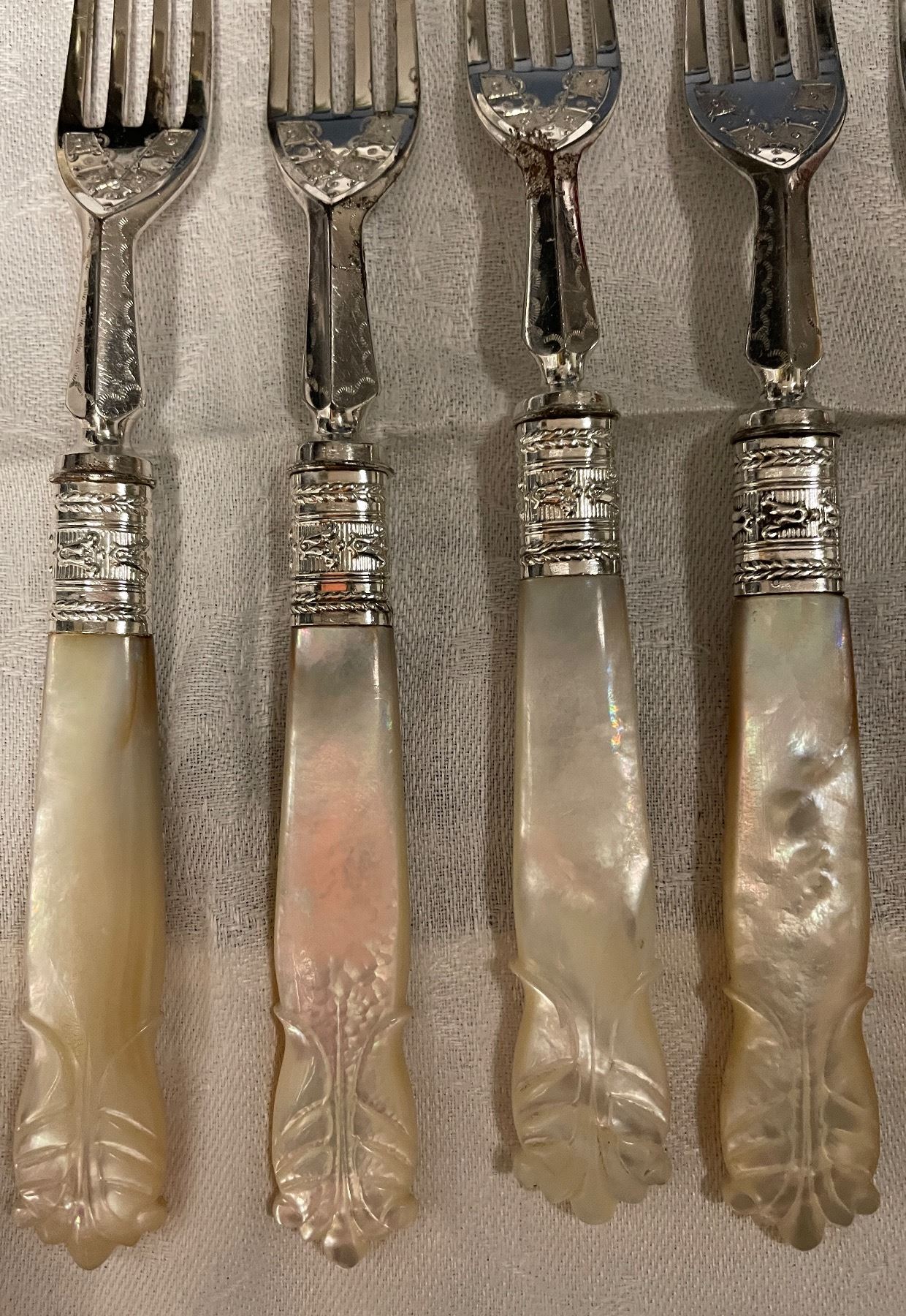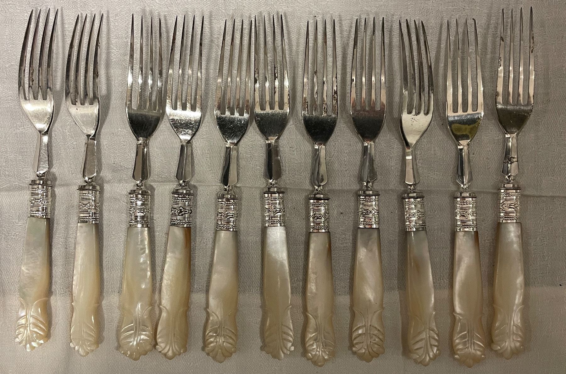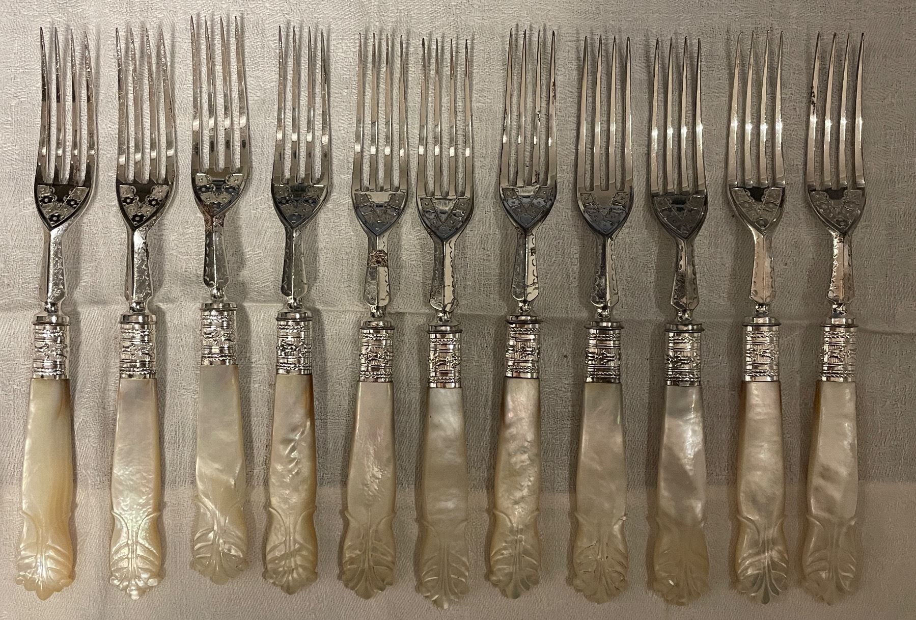 11 Antique Silver Plated Dinner Forks with Pearloid Handles