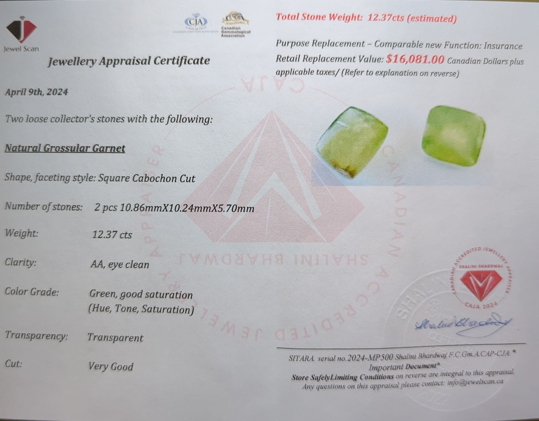 12.37 ct Certified Grossular Garnet gemstone Pair ($16,081 Appraisal)
