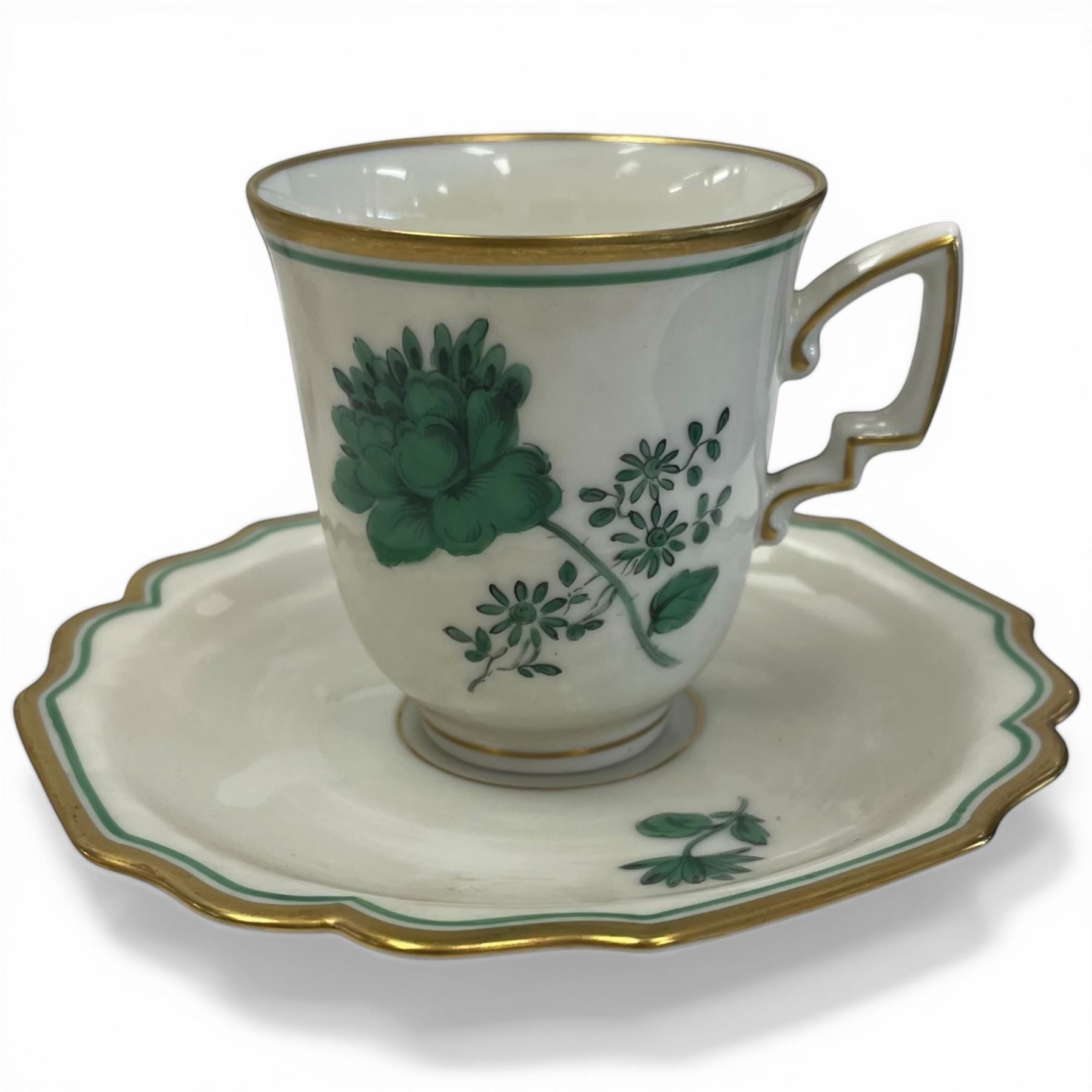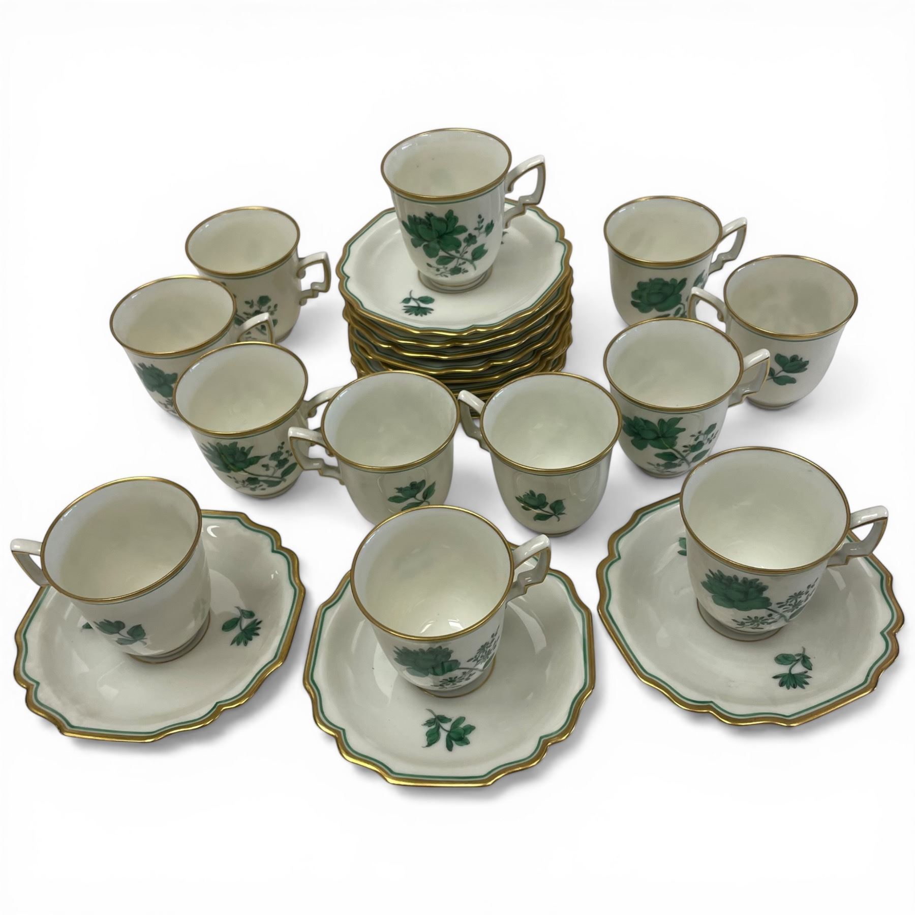 12 Antique Augarten Austria Demitasse Cups with Saucers * Deutsche Blumen green floral pattern with gold trim