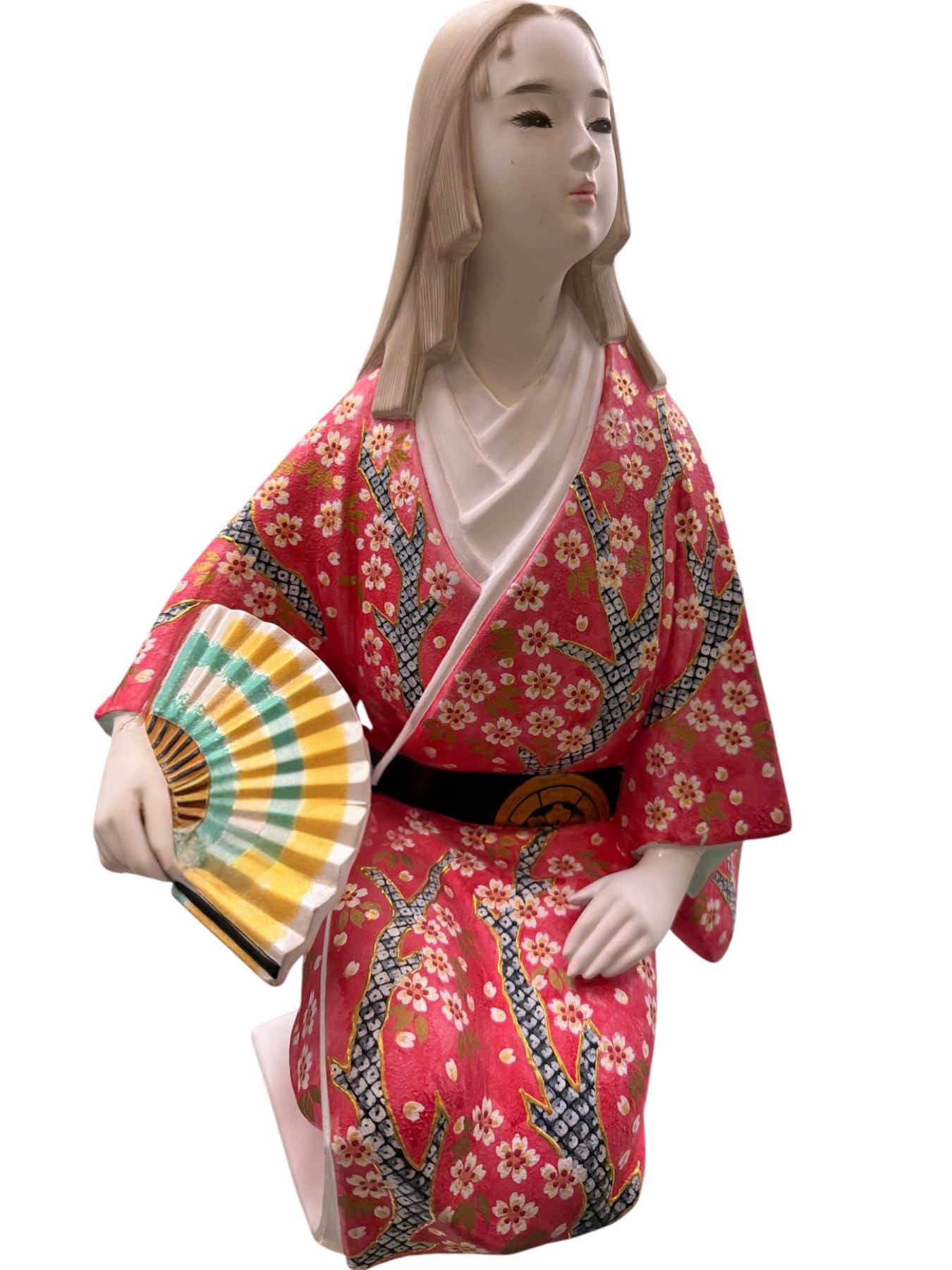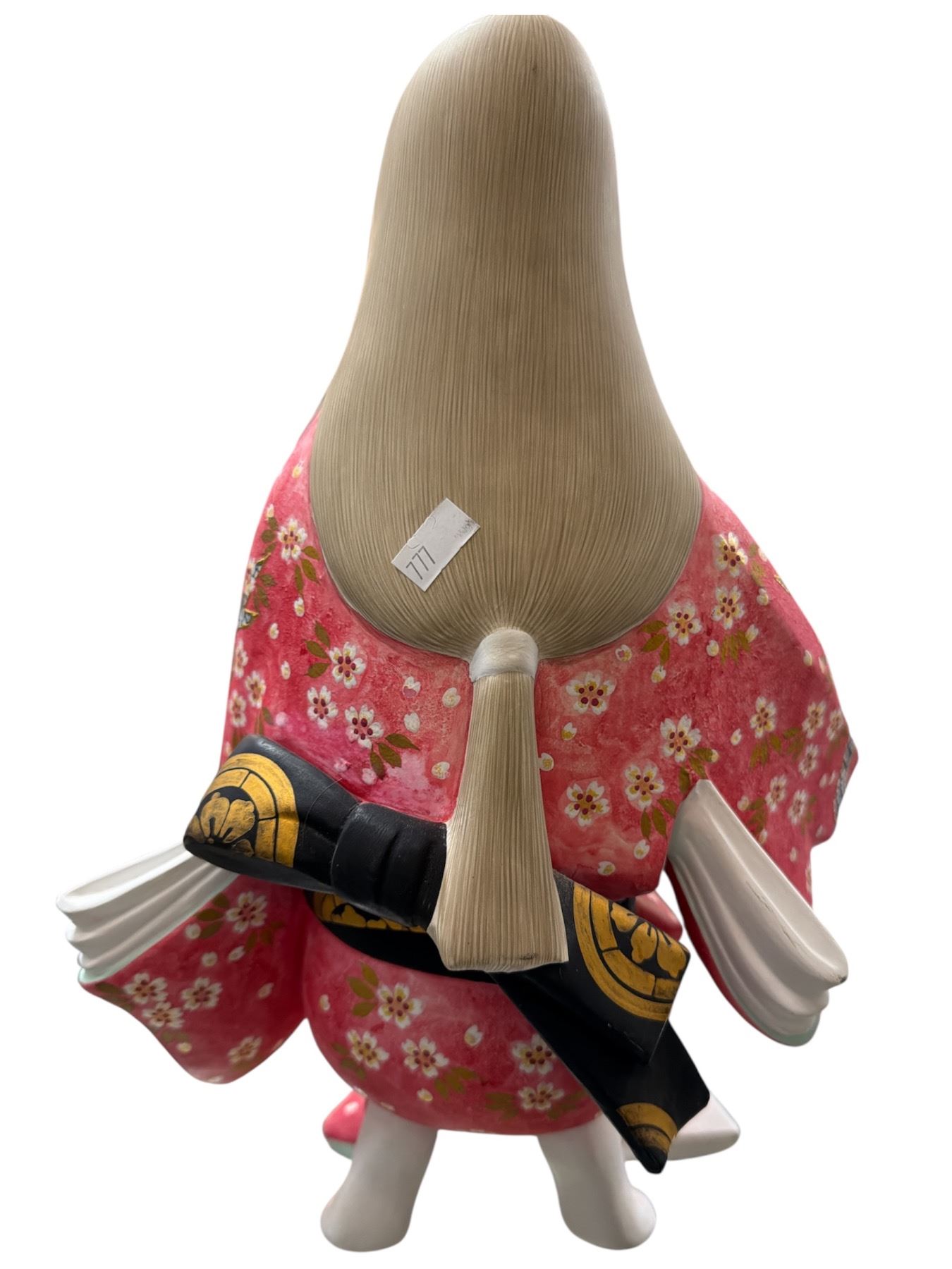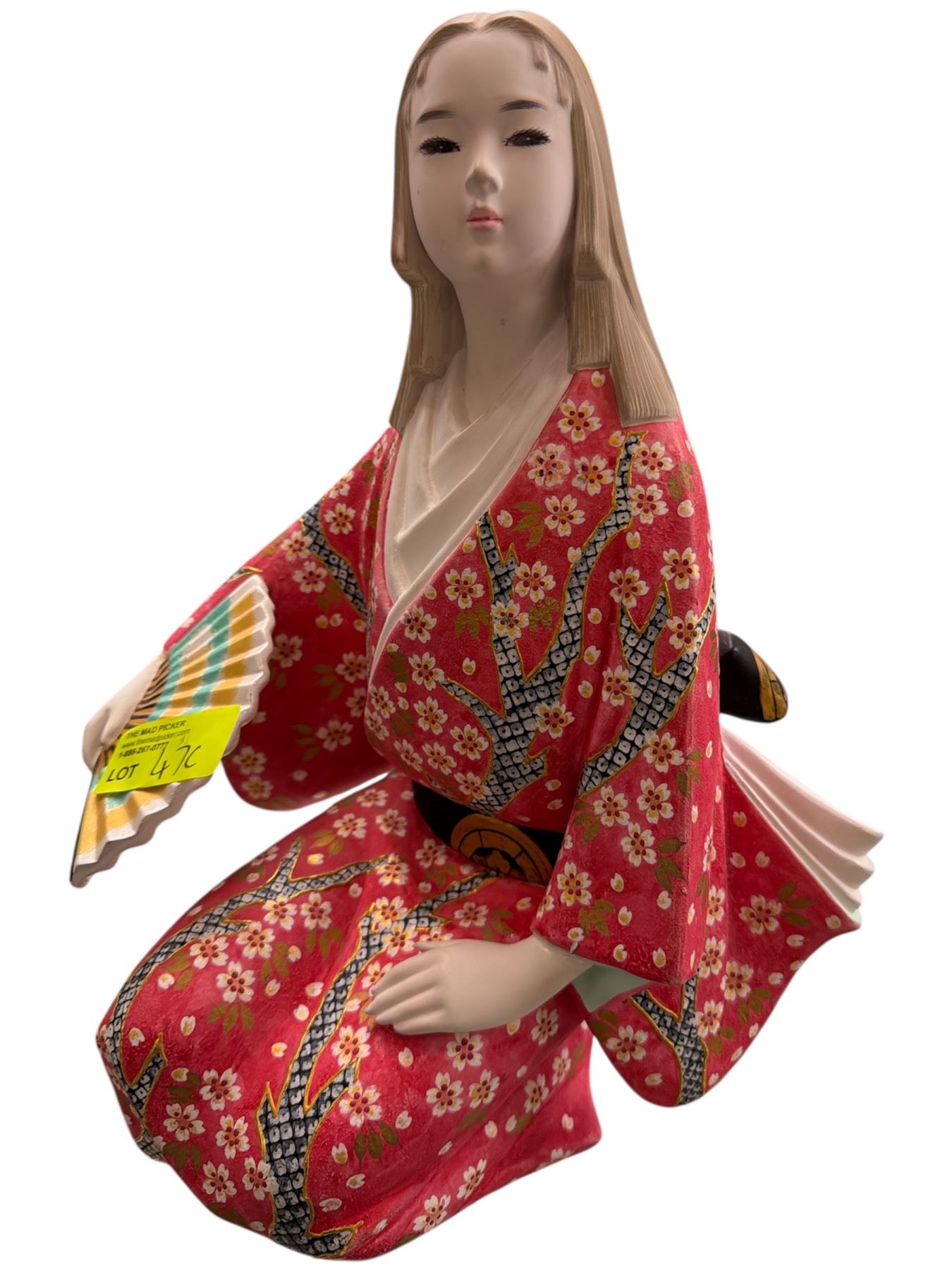 Chalkware statue depicting a figure in a traditional Japanese kimono, standing 14 inches tall. Likely mid-20th century in origin, featuring detailed hand-painted accents on the attire and facial features. Design showcases typical smooth chalkware finish with vibrant colors and intricate patterns.