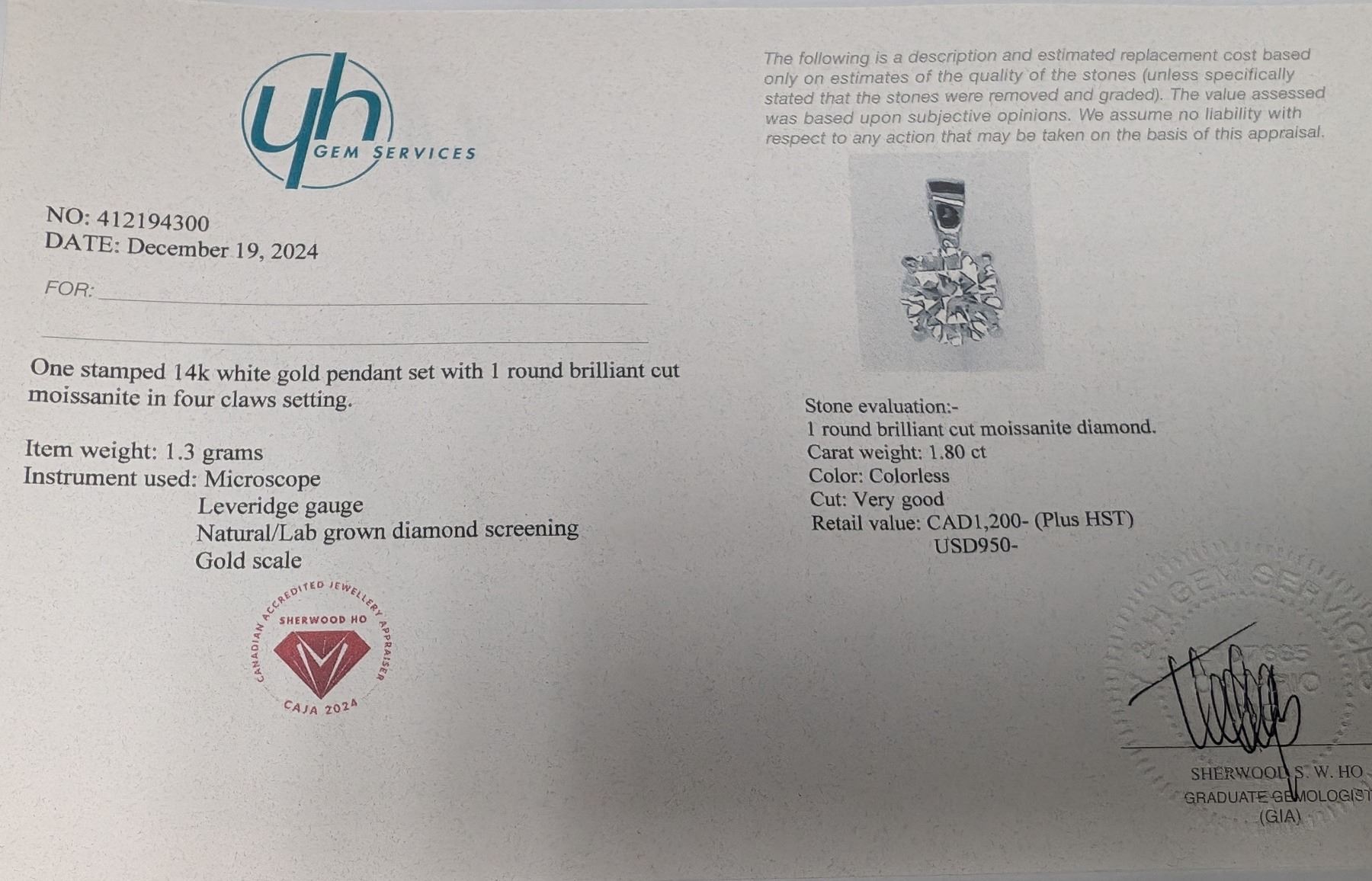 14K(1.3g), MOISSANITE (1.8ct) PENDANT, appraised/retail value $1200