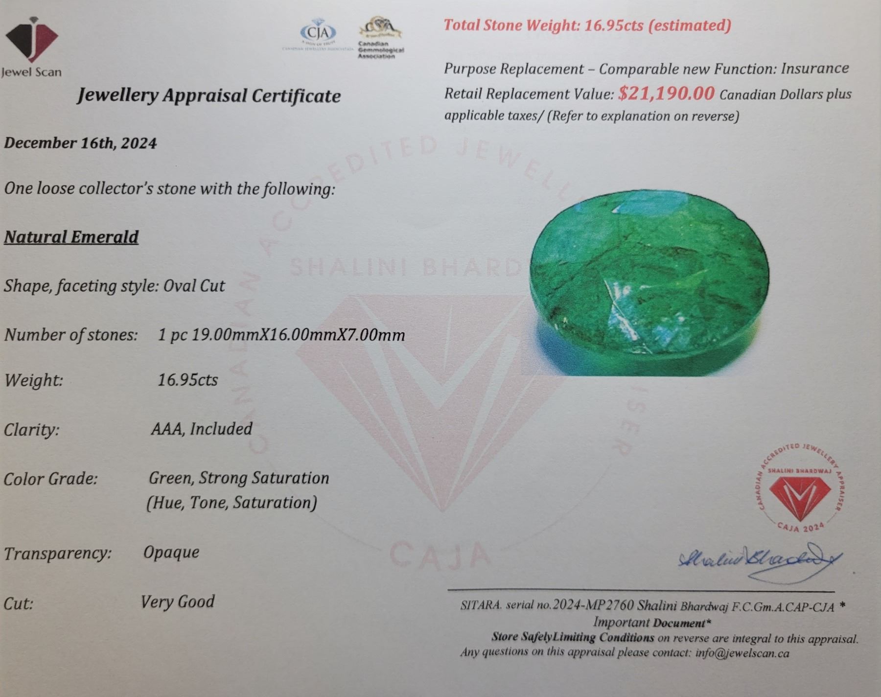 16.95 ct Certified Emerald gemstone ($21,190 Appraisal)