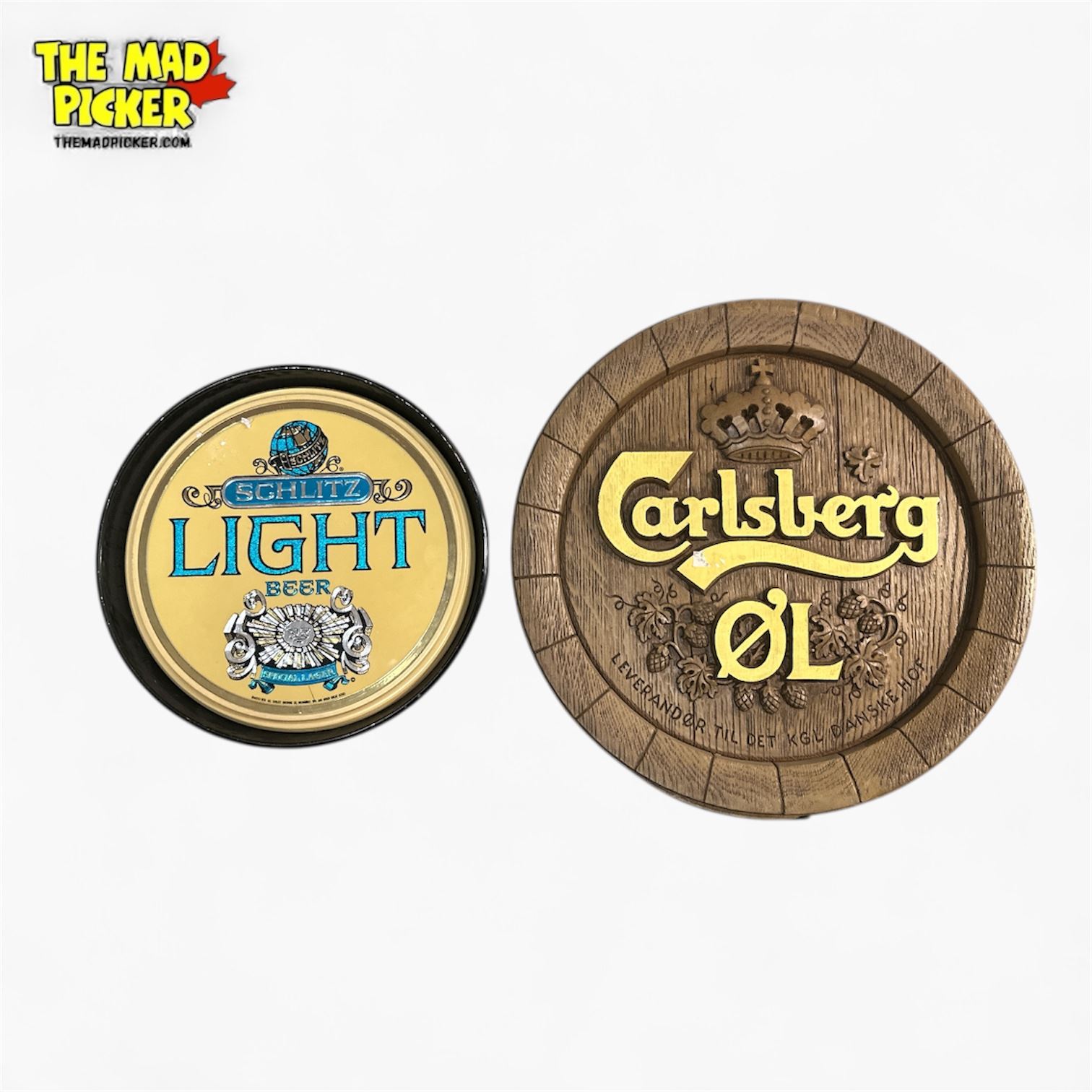 16in Carlsberg Styrofoam Sign, 12in Wm. Younger's Tartan Metal Tray, 11in Schlitz Light Beer Plastic