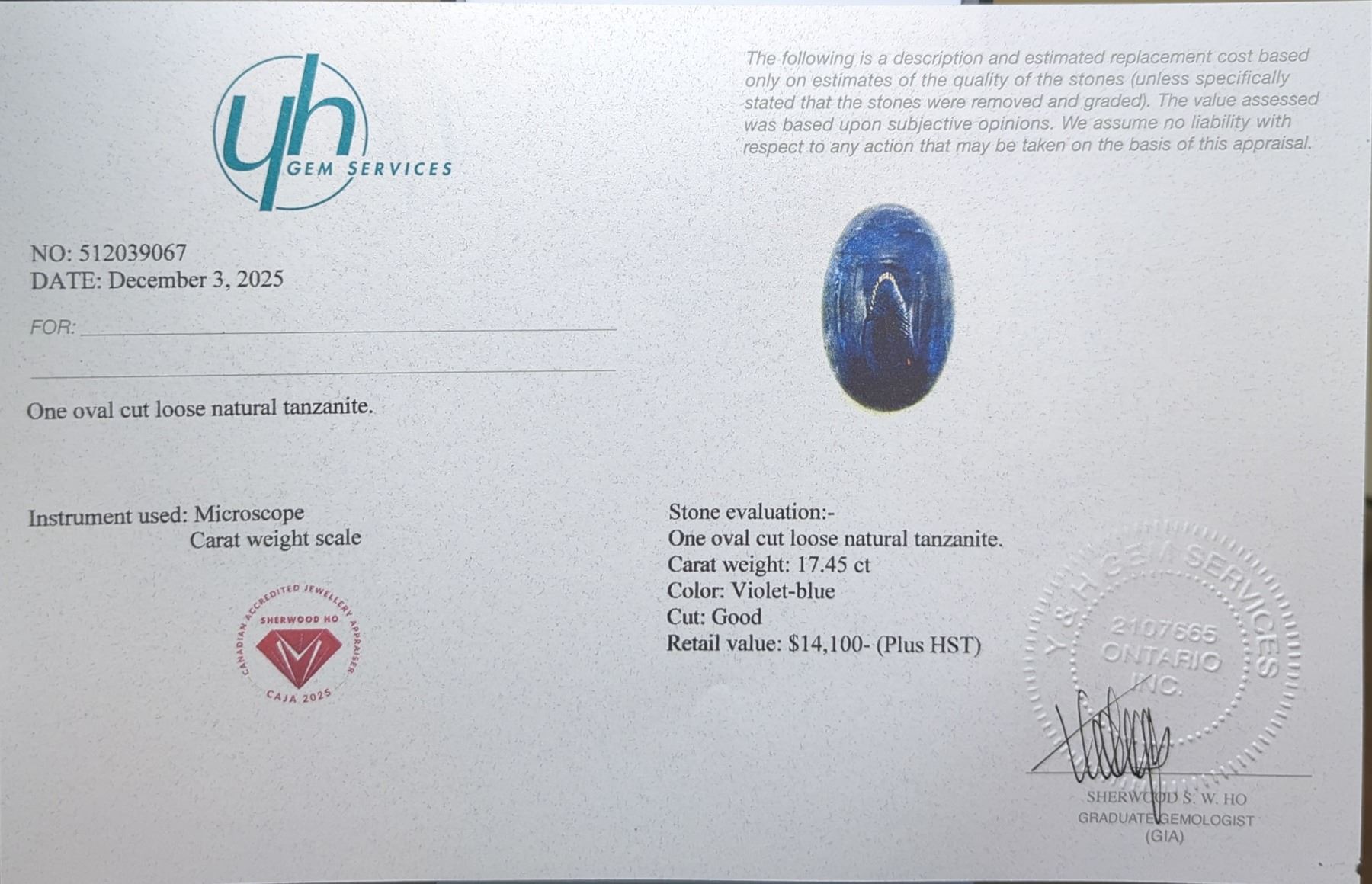 17.45 ct Certified Tanzanite gemstone ($14,100 Appraisal)