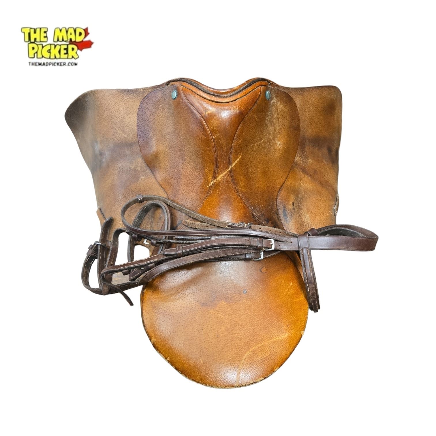 17-inch English leather saddle, includes saddle cover, metal stirrups, and matching leather halter. Fine craftsmanship with durable construction suitable for riding. Classic English style, designed for comfort and functionality.