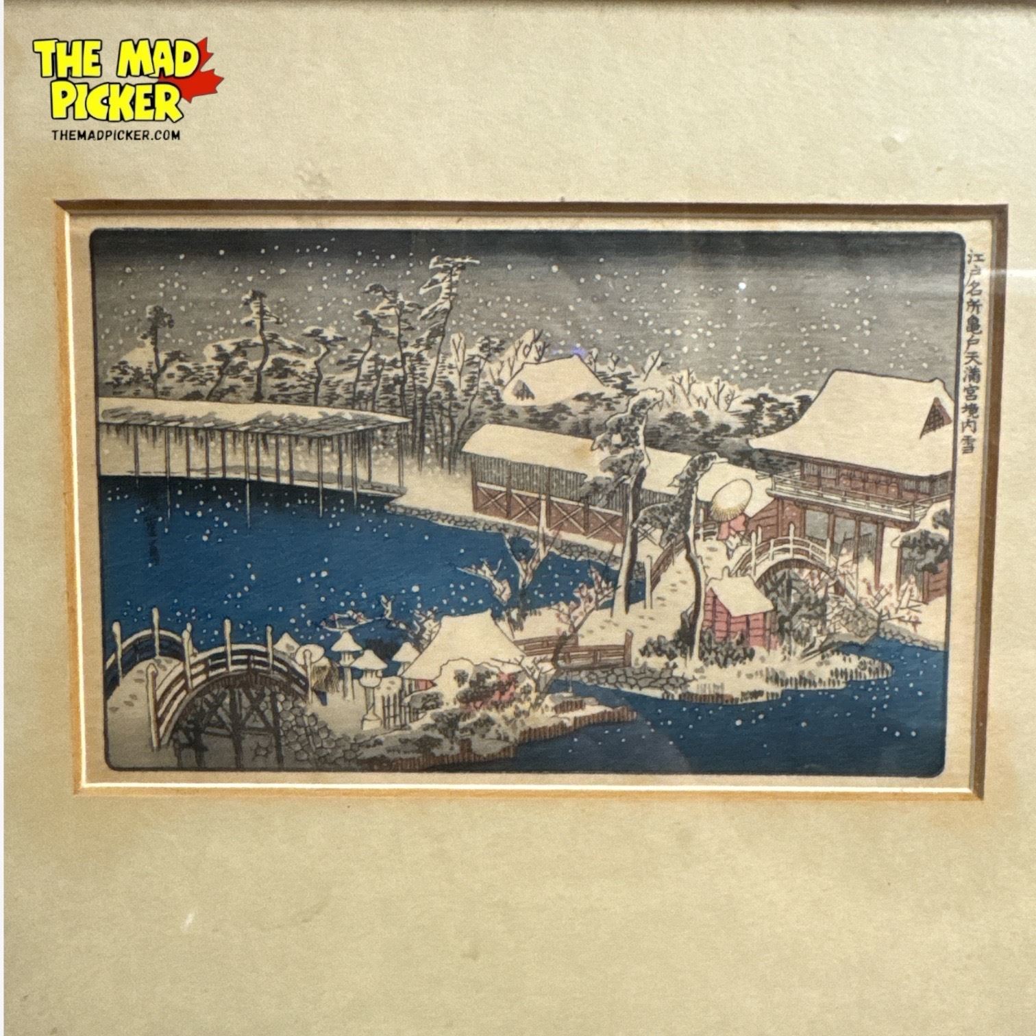 'Snow at Kameido Shrine', Japanese woodblock print from the 1797-1858 period. Scene depicts a snow-laden Kameido Shrine. Approximate dimensions are 9x7.5 inches. Traditional Ukiyo-e style art featuring intricate details and natural scenery.