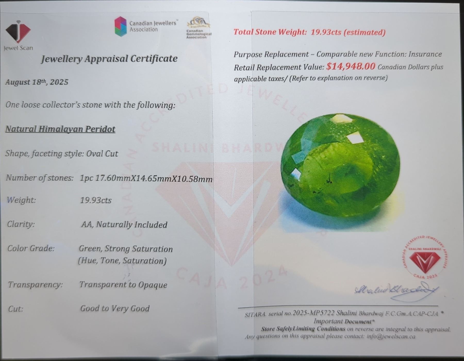 19.93 ct Certified Himalayan Peridot gemstone ($14,948 Appraisal)