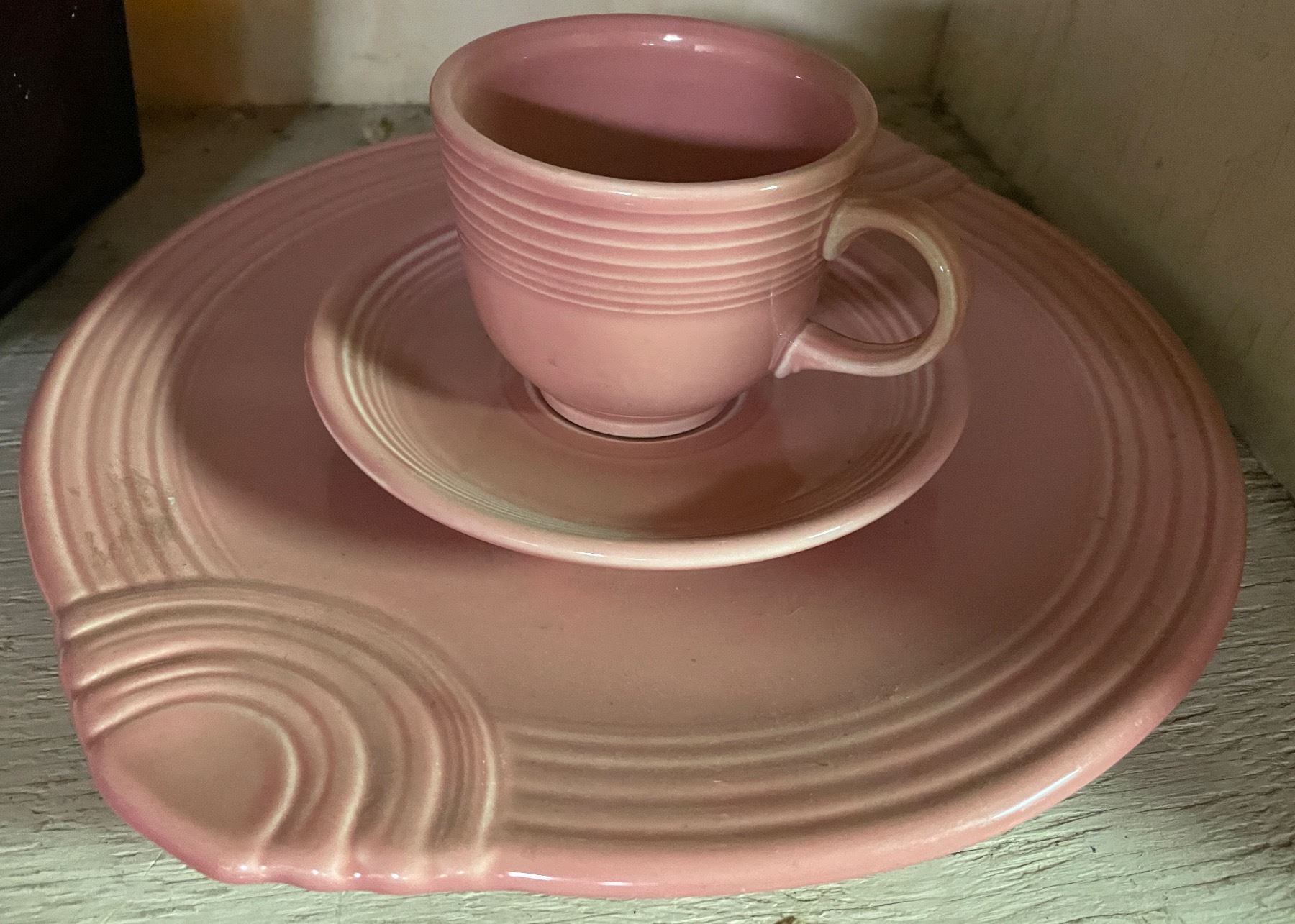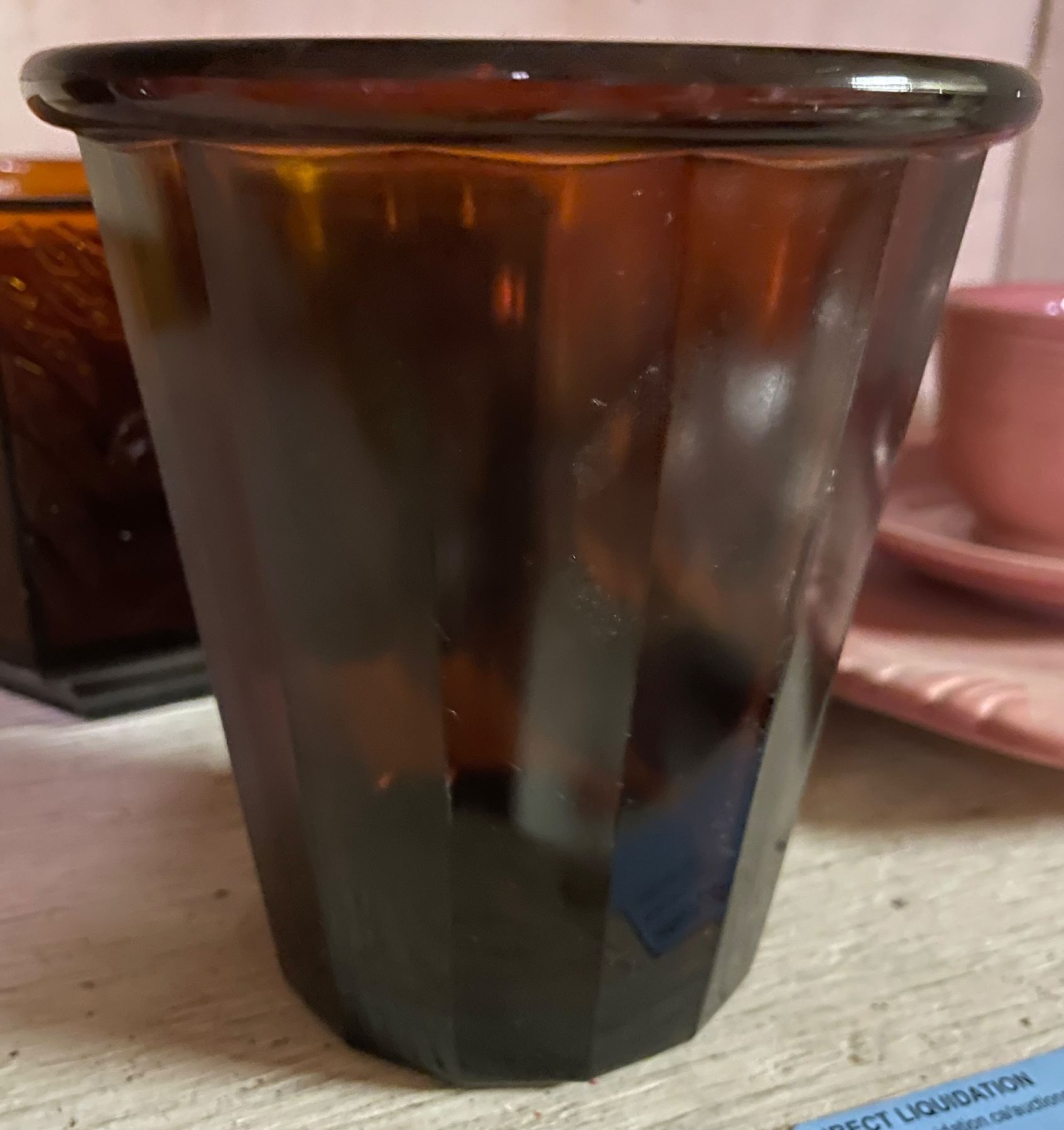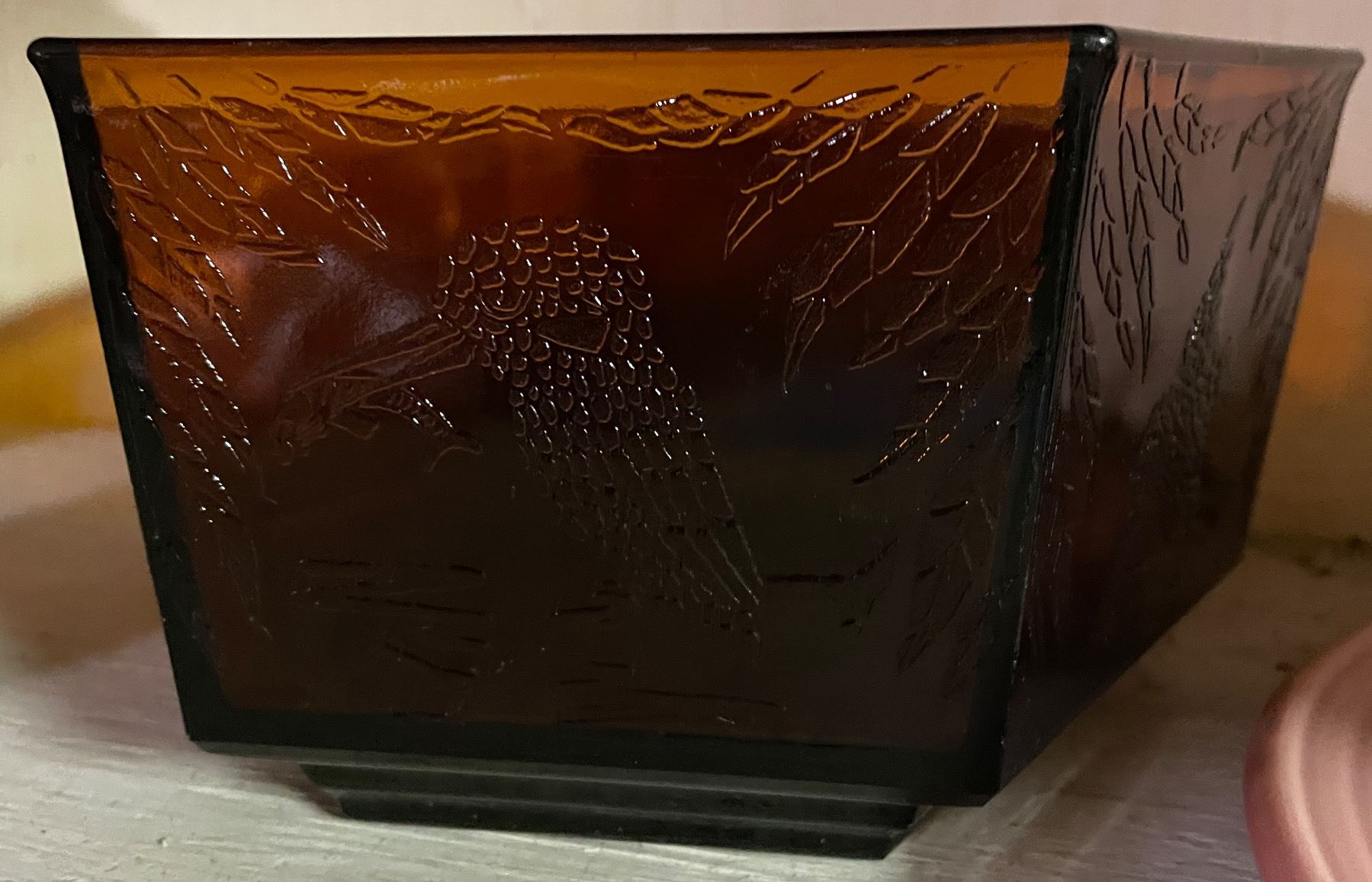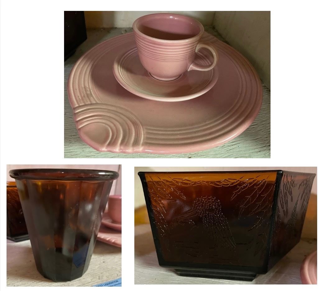1930's Sherdley Amber Glass Hexagonal Bowl, 3 Pcs 1950-60's Homer Laughlin Fiestaware Dinnerware, Amber Thick Glass