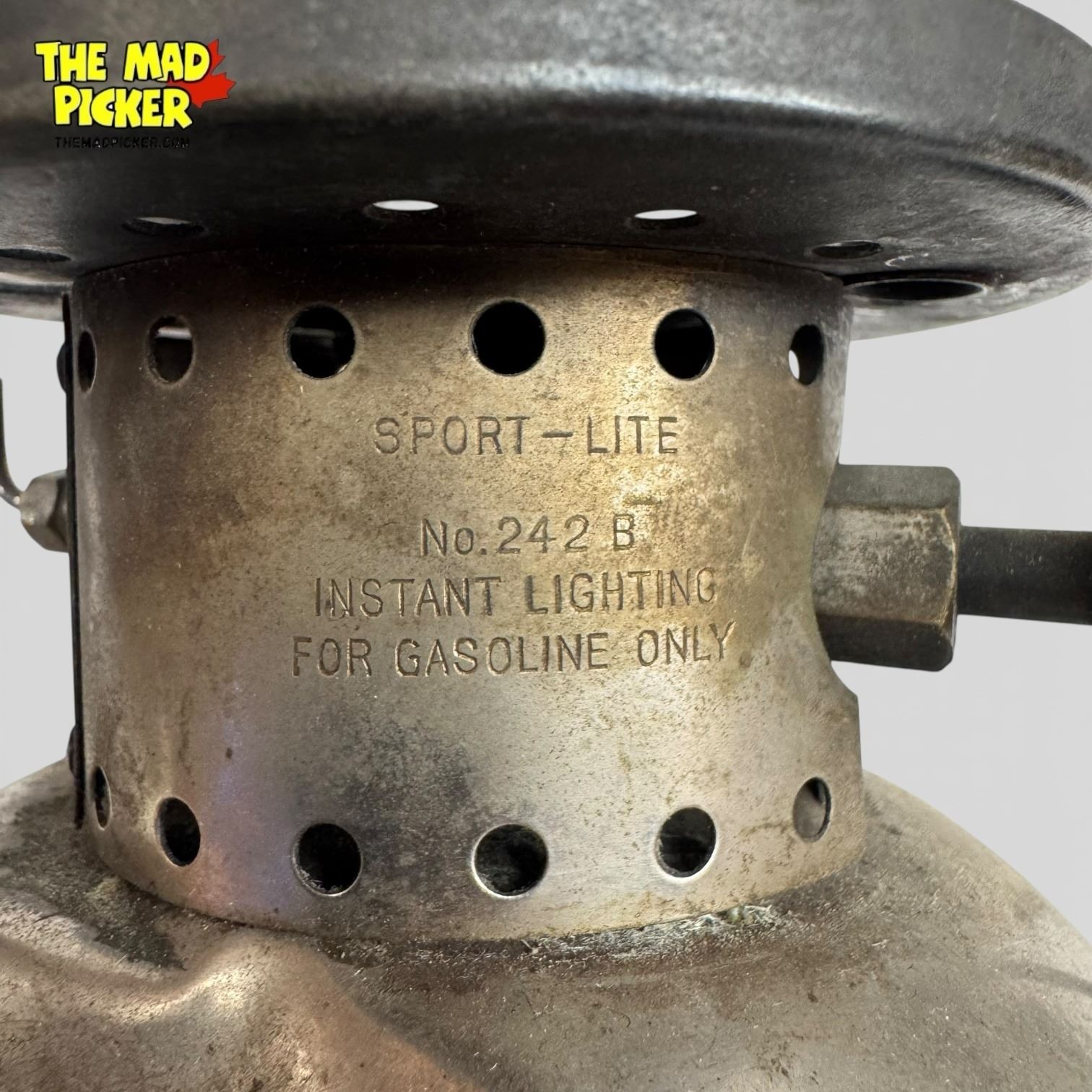 Coleman Sport-Lite lantern, Model 242B, produced in 1948. Features a single-mantle design with a green enamel fount and ventilator. Constructed from brass and steel. Designed for liquid fuel operation. Compact and lightweight, suitable for camping and outdoor use. Made in the USA.