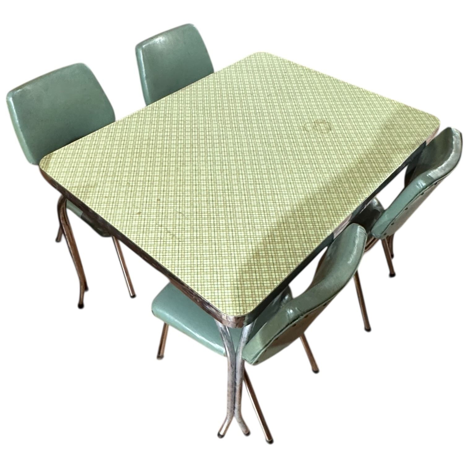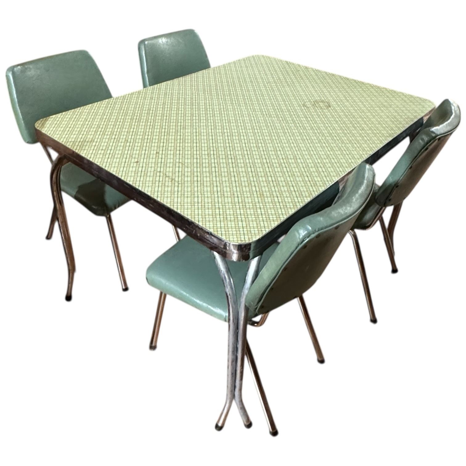 1950s dining set featuring a Formica-topped table measuring 47 x 36 x 30-Inch and four vinyl wrapped chairs. Characteristic of mid-century design with durable materials and functional style. Set combines a chrome-accented table frame with matching chairs for a cohesive vintage look. Item is as pictured.