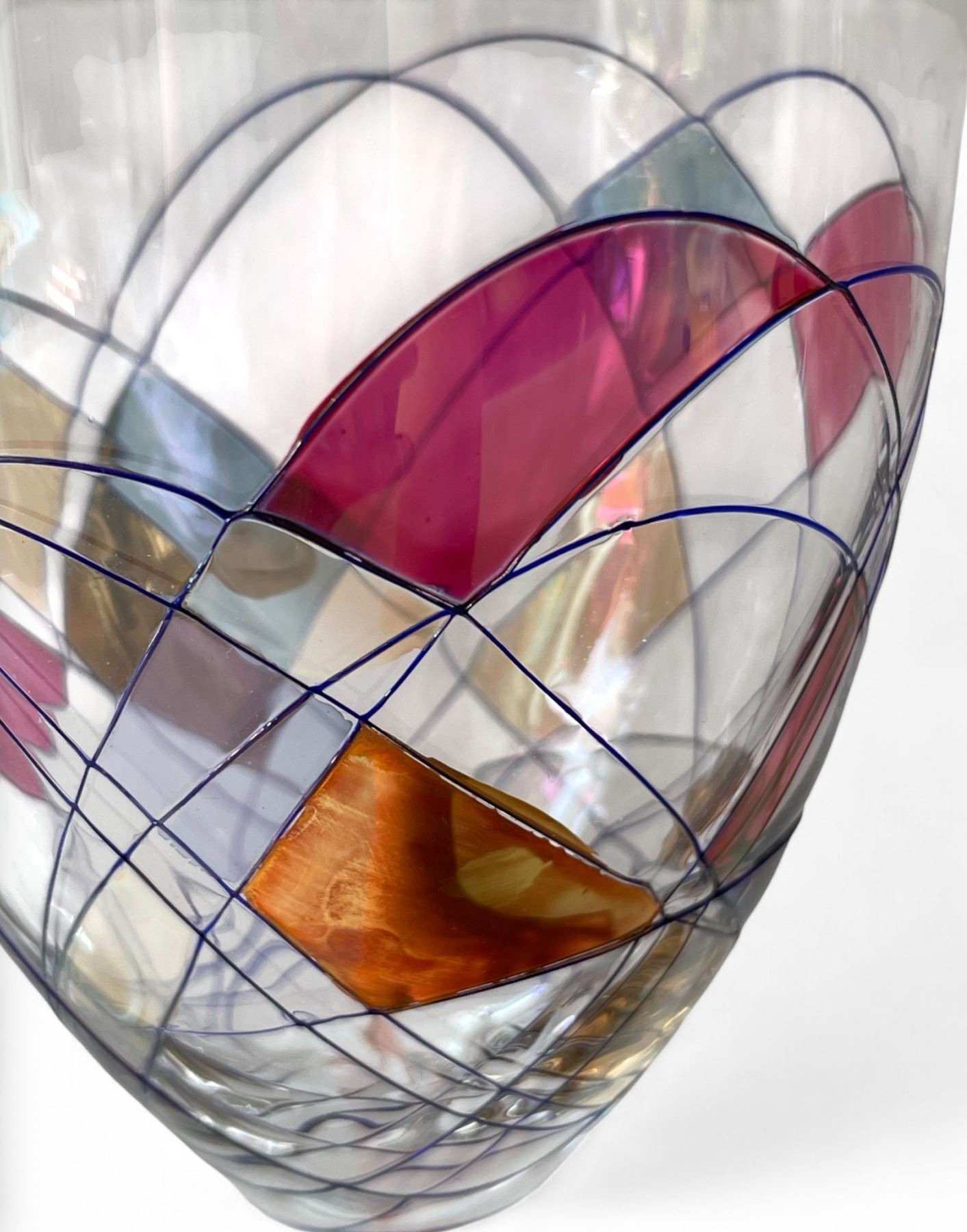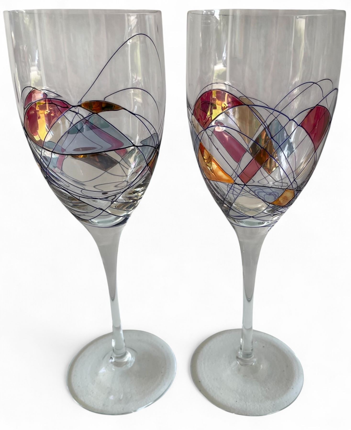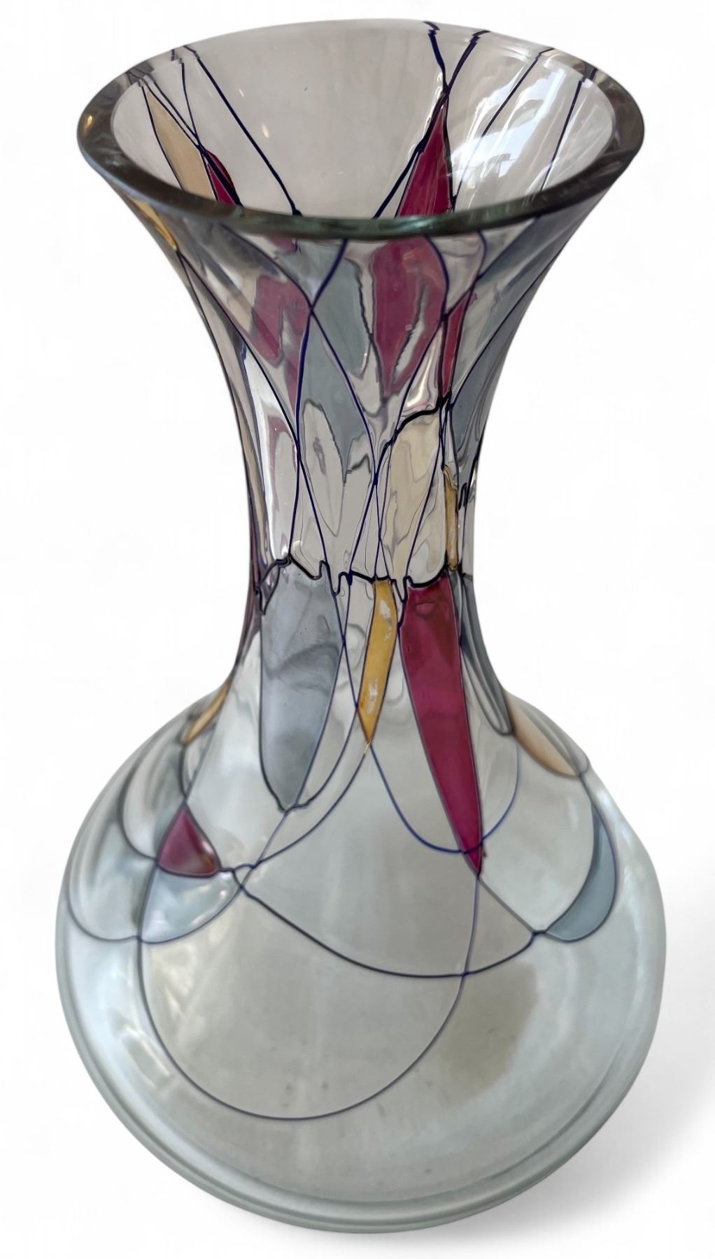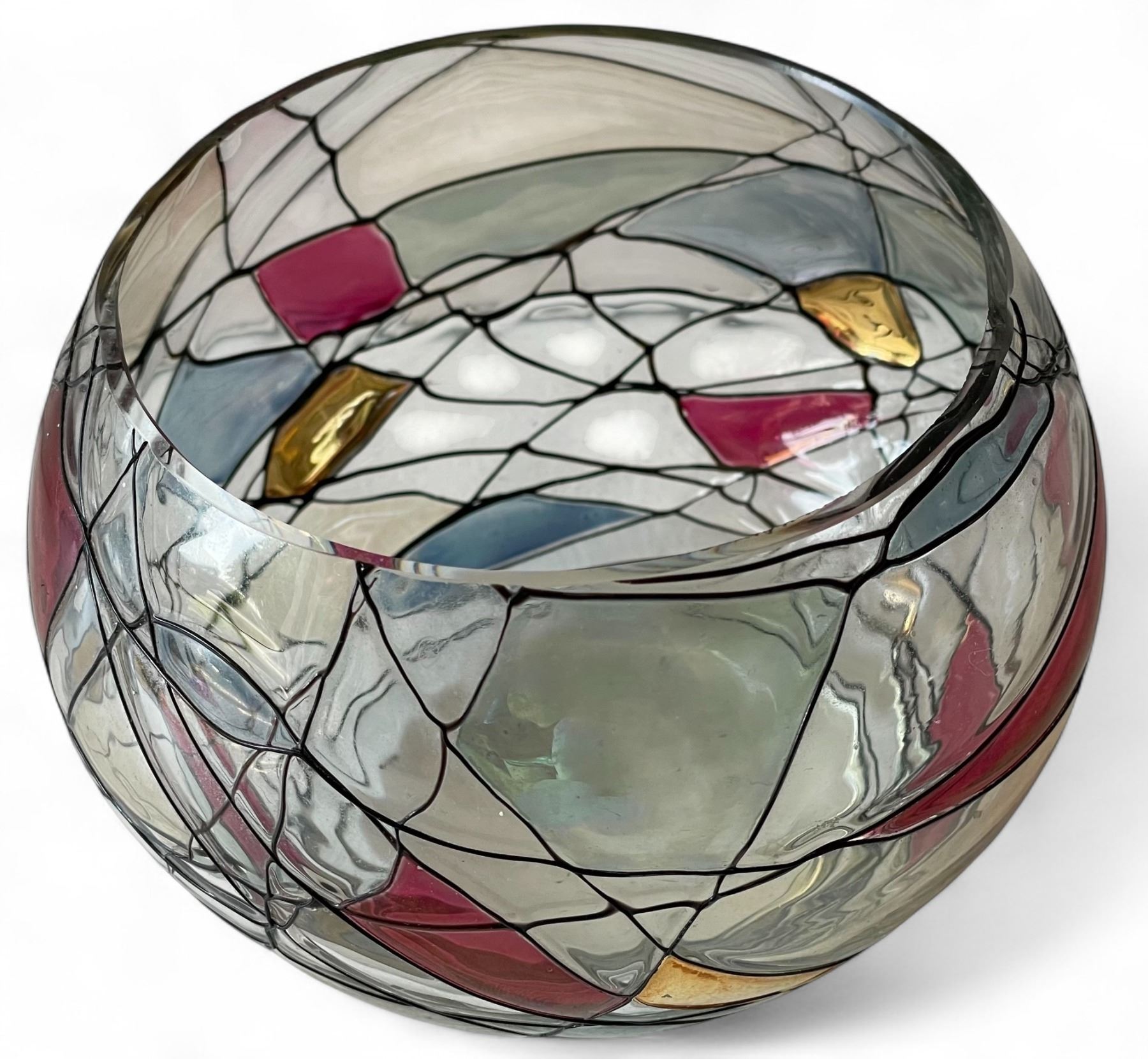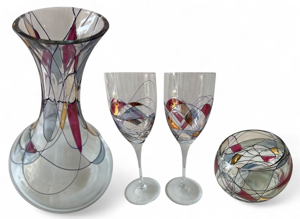 1950s Exquisite Partylite Hand-Painted Mosaic Art Glass - Flared Vase, Pair of Wine Goblets & Bowl