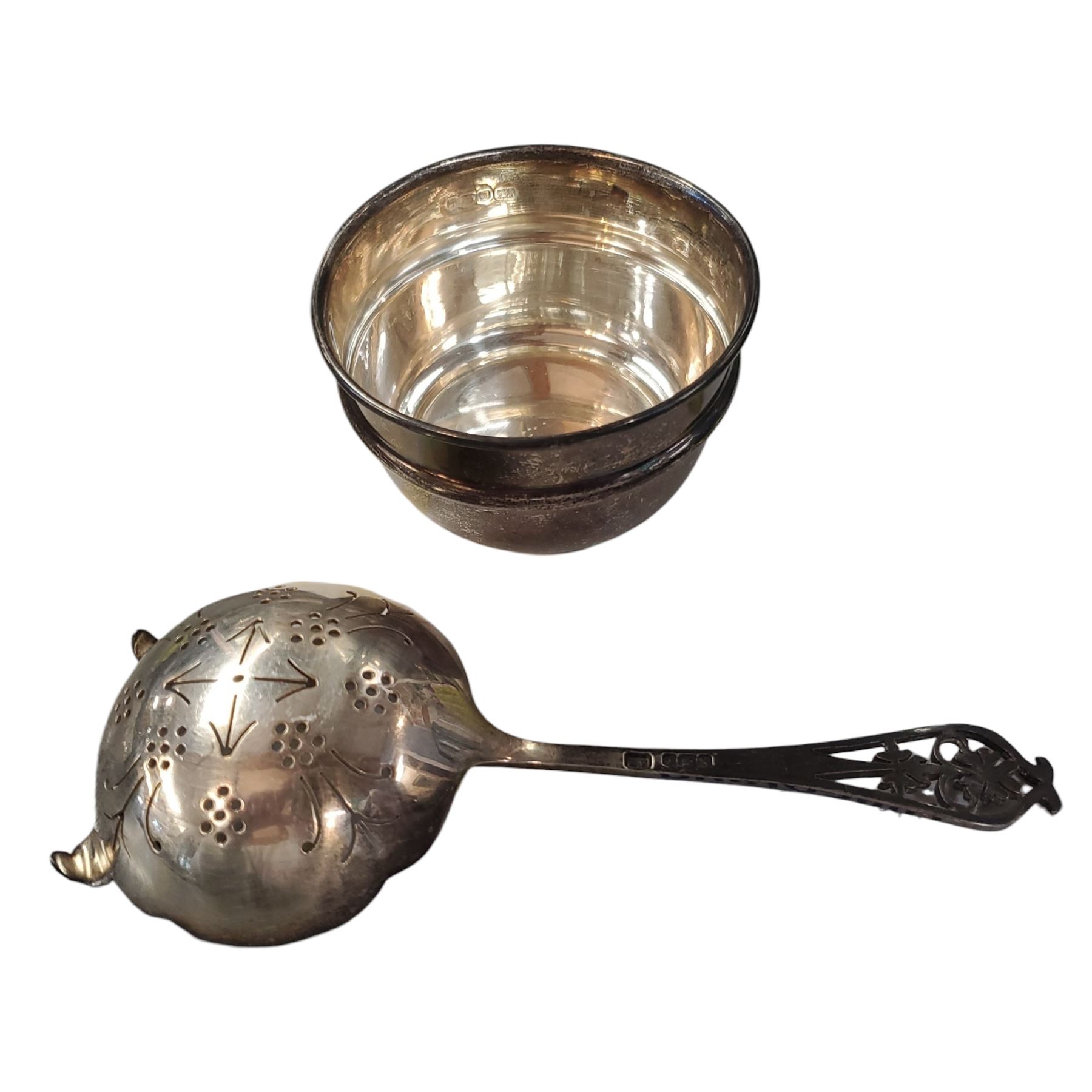 1950s Sterling Silver 6" Tea Strainer with Drip Bowl * Fully Hallmarked * Total weight: 82 grams