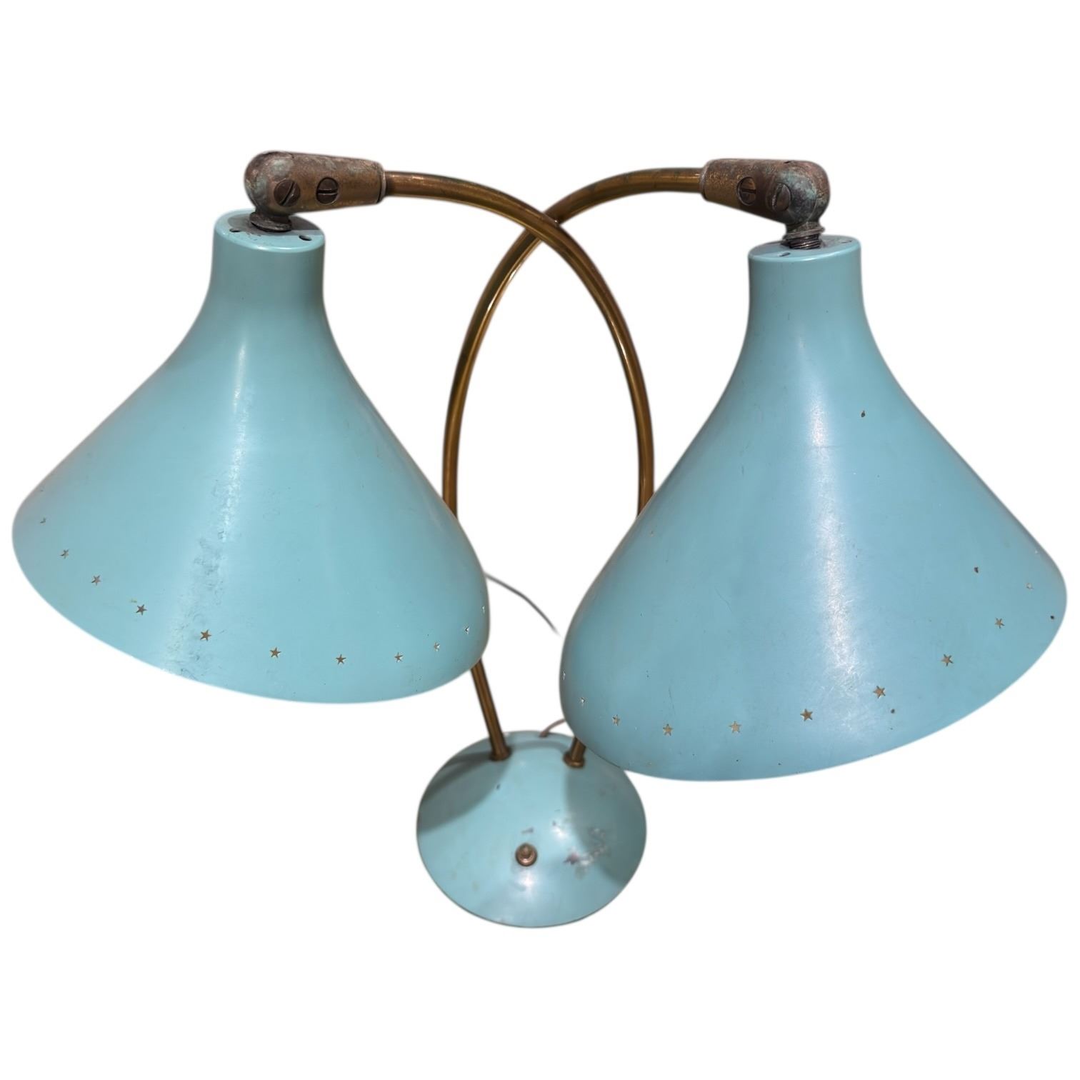 1950s Turquoise Double Shade Metal Table Lamp with Pierced Edge Shades (plug has been cut off)