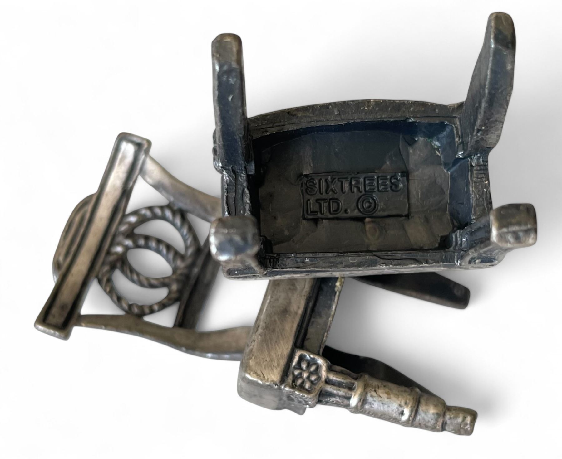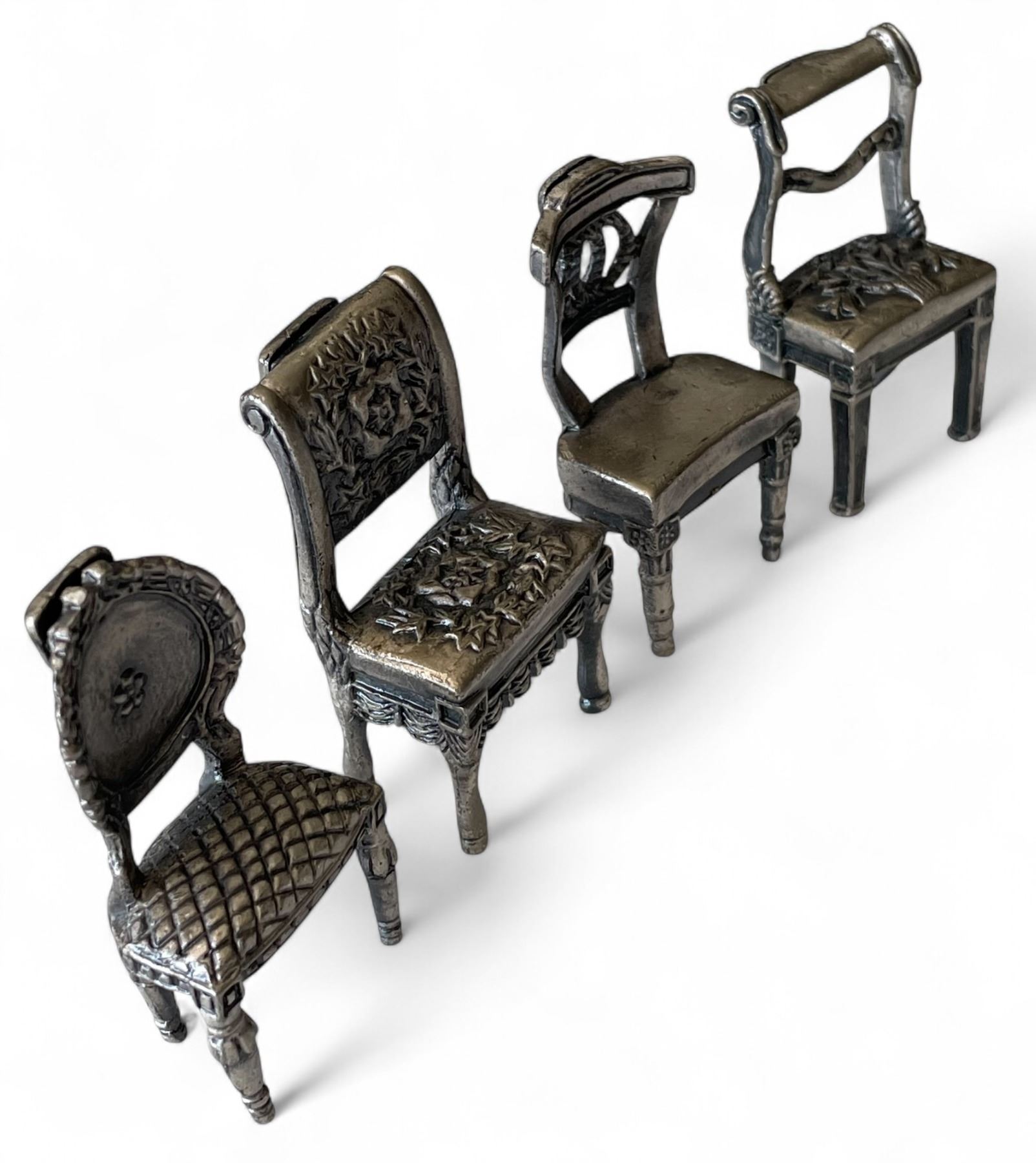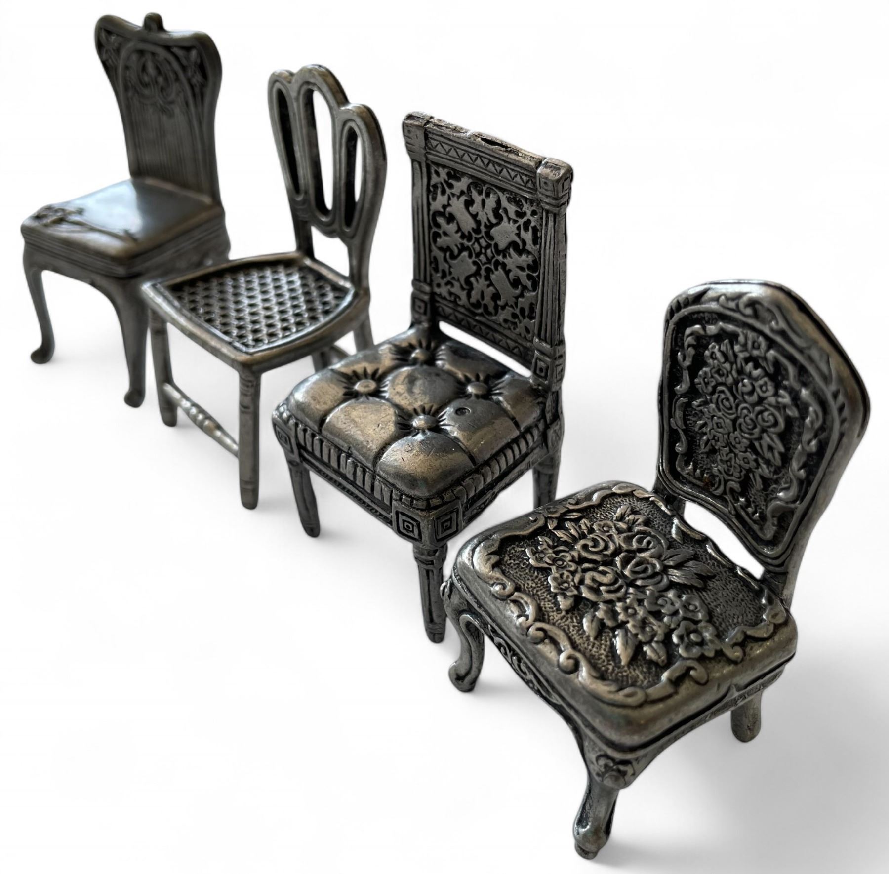 1960-70s Dress Up Dolls (2) and Group of Vintage Miniature Pewter Dollhouse Furniture Chairs by Sixtrees
