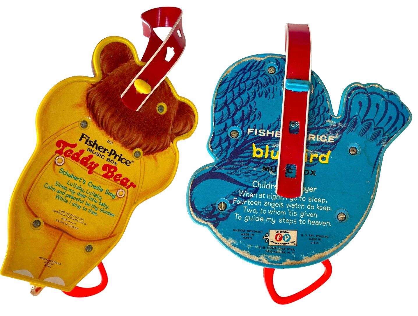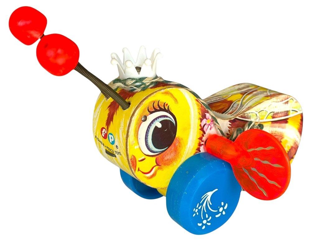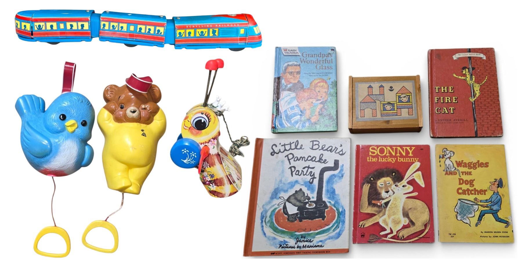 1960s-70s Vintage Toys: Schylling 12" Tin Train, Fisher‑Price Queen Buzzy Bee Pull Toy, 2 Pull‑String Music Boxes, and 5 Story Books