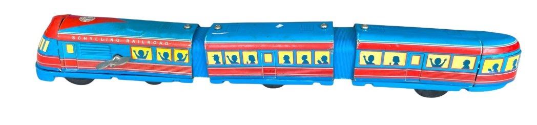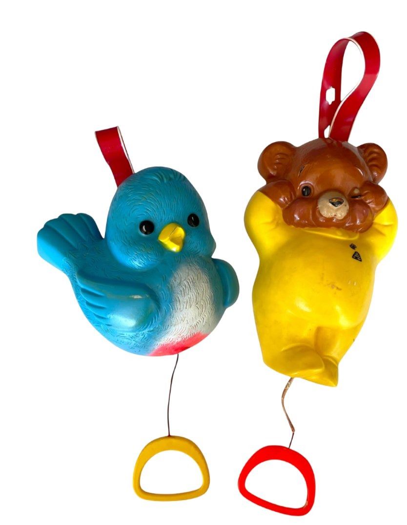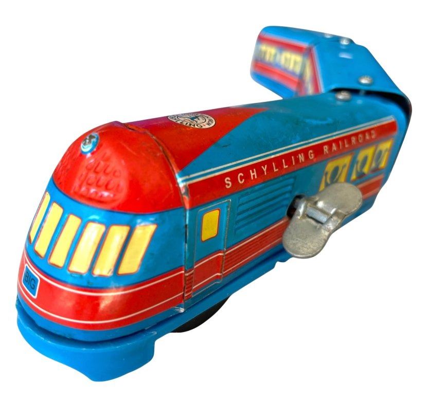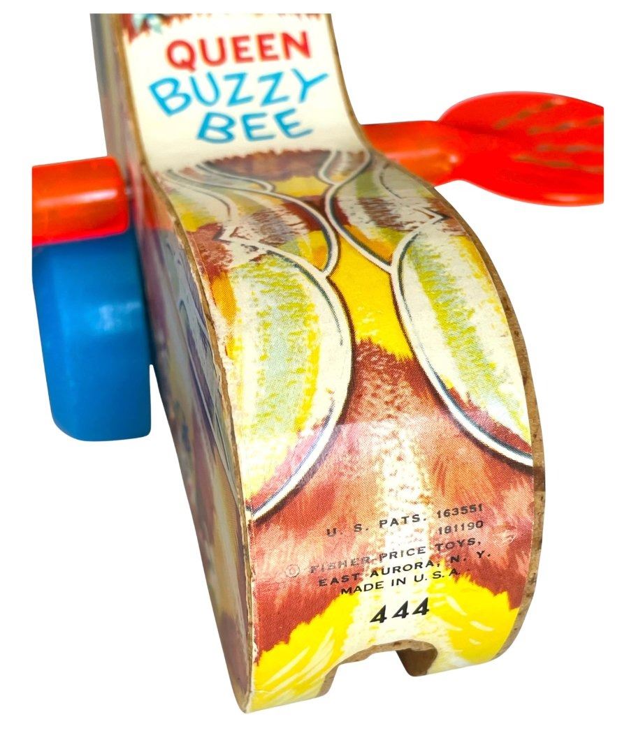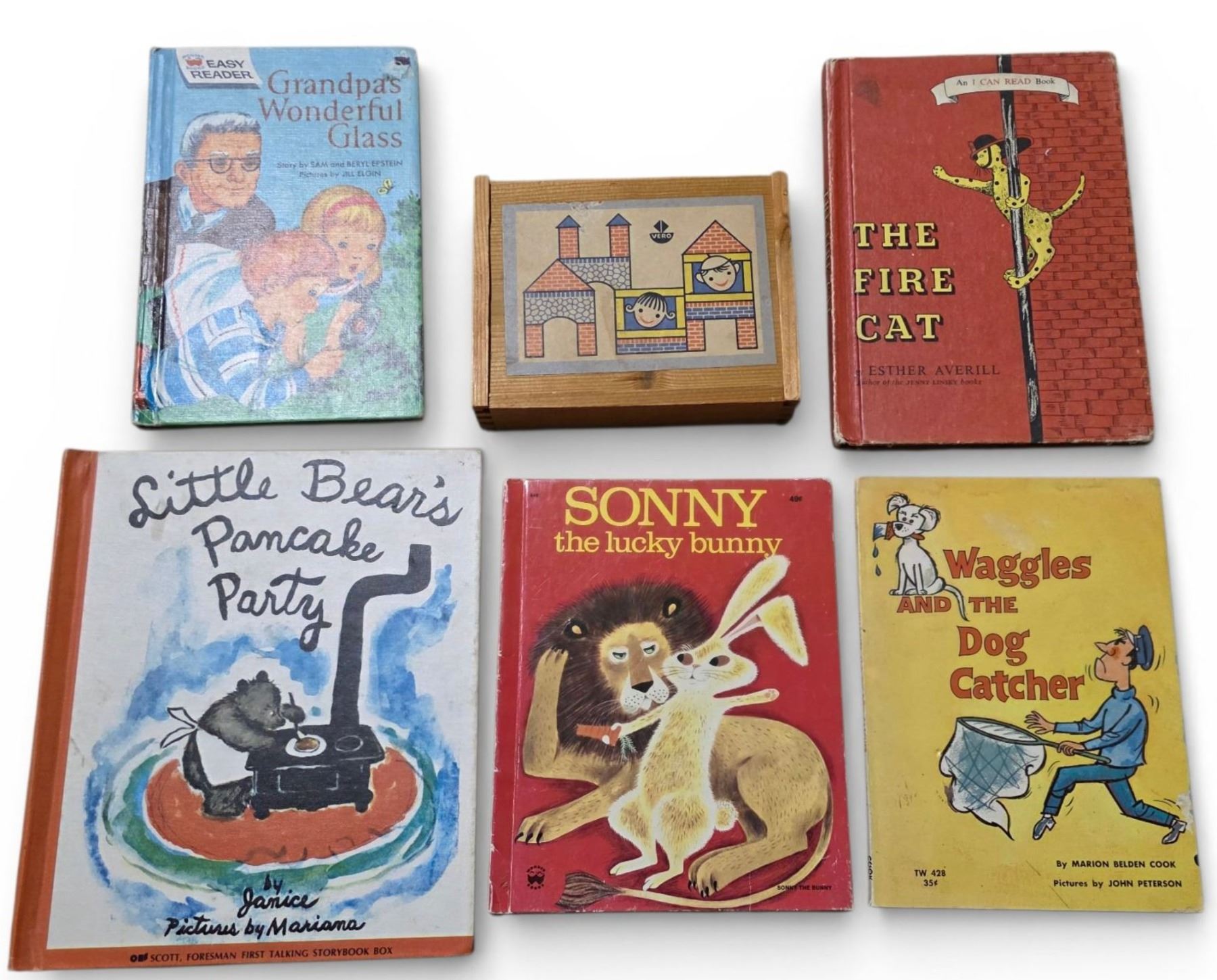 1960s-70s Vintage Toys: Schylling 12" Tin Train, Fisher‑Price Queen Buzzy Bee Pull Toy, 2 Pull‑String Music Boxes, and 5 Story Books