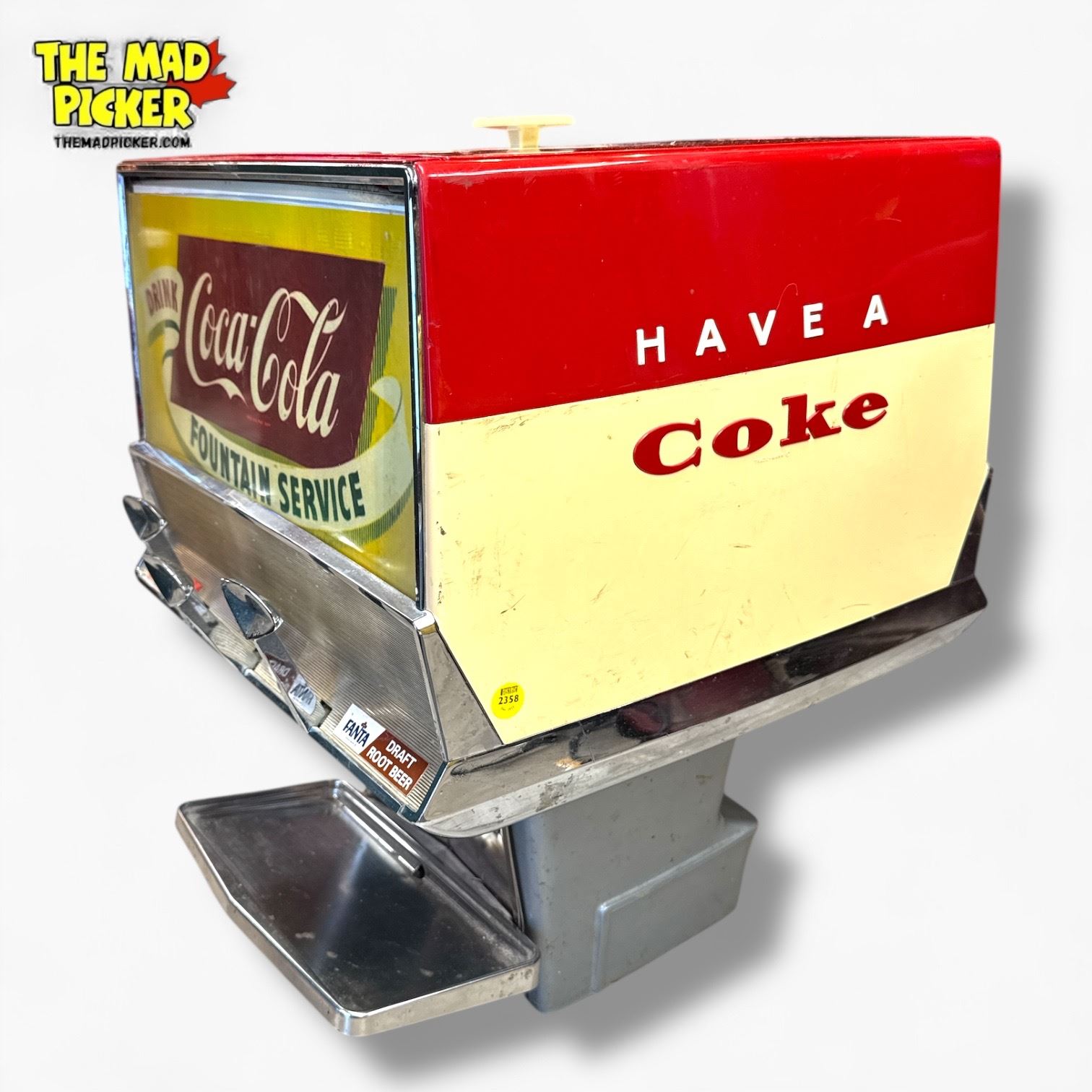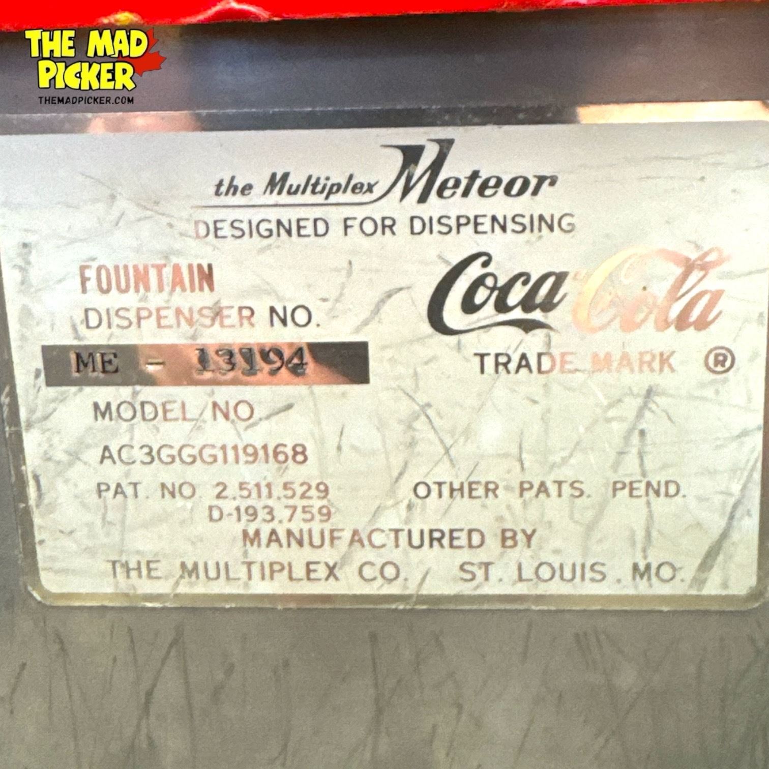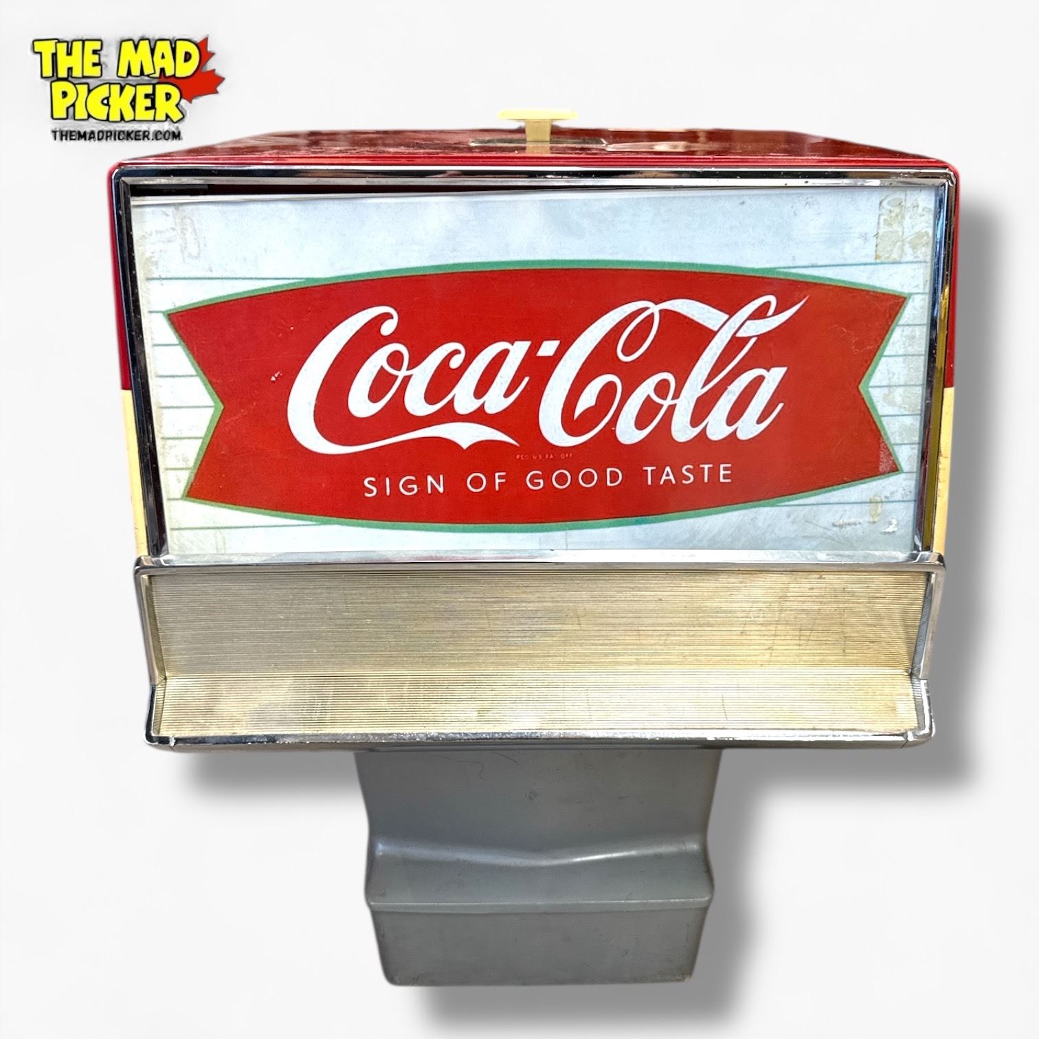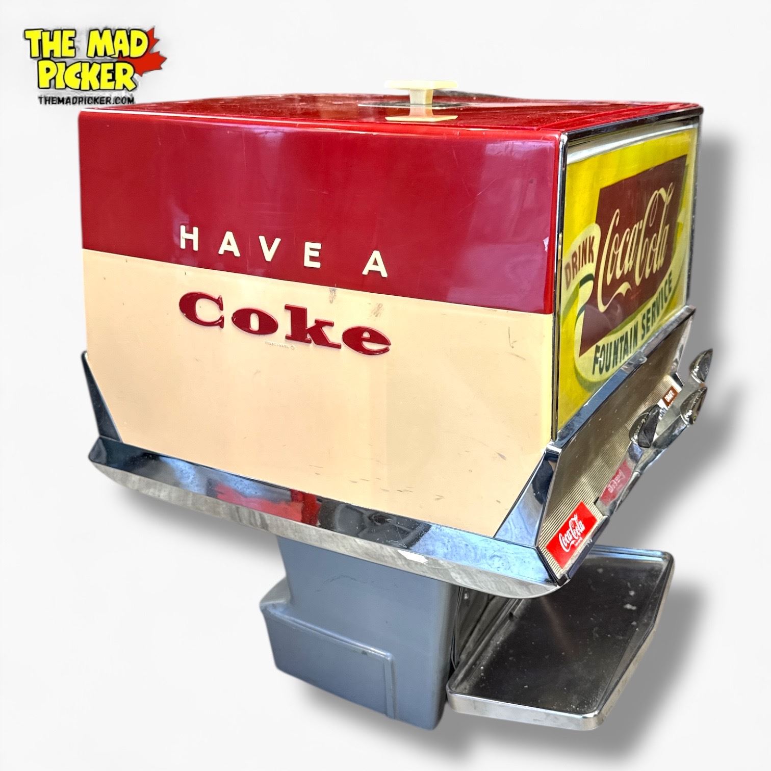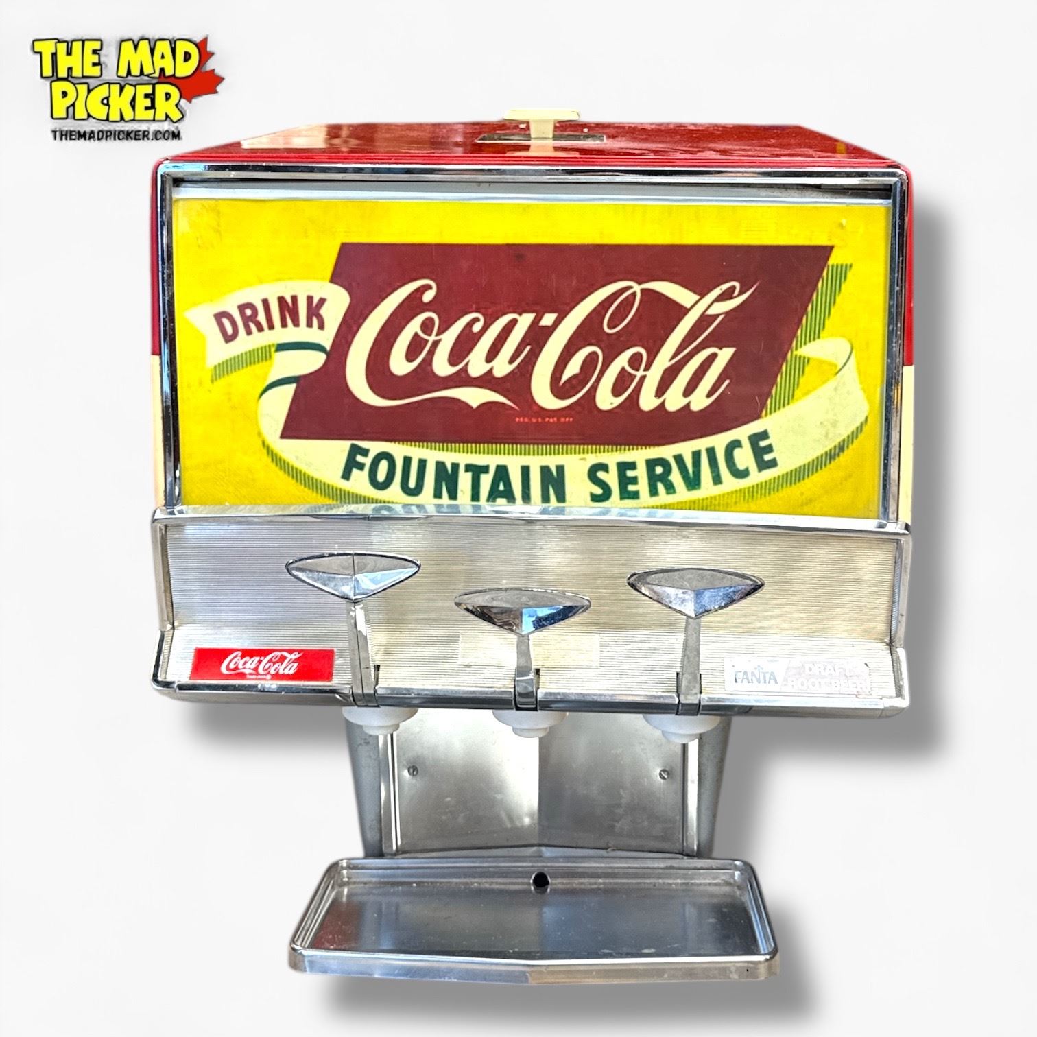 A clean 1960s Coca‑Cola three‑flavor countertop syrup dispenser by Multiplex Meteor, with bright chrome and classic vintage appeal—an eye‑catching piece ready for display