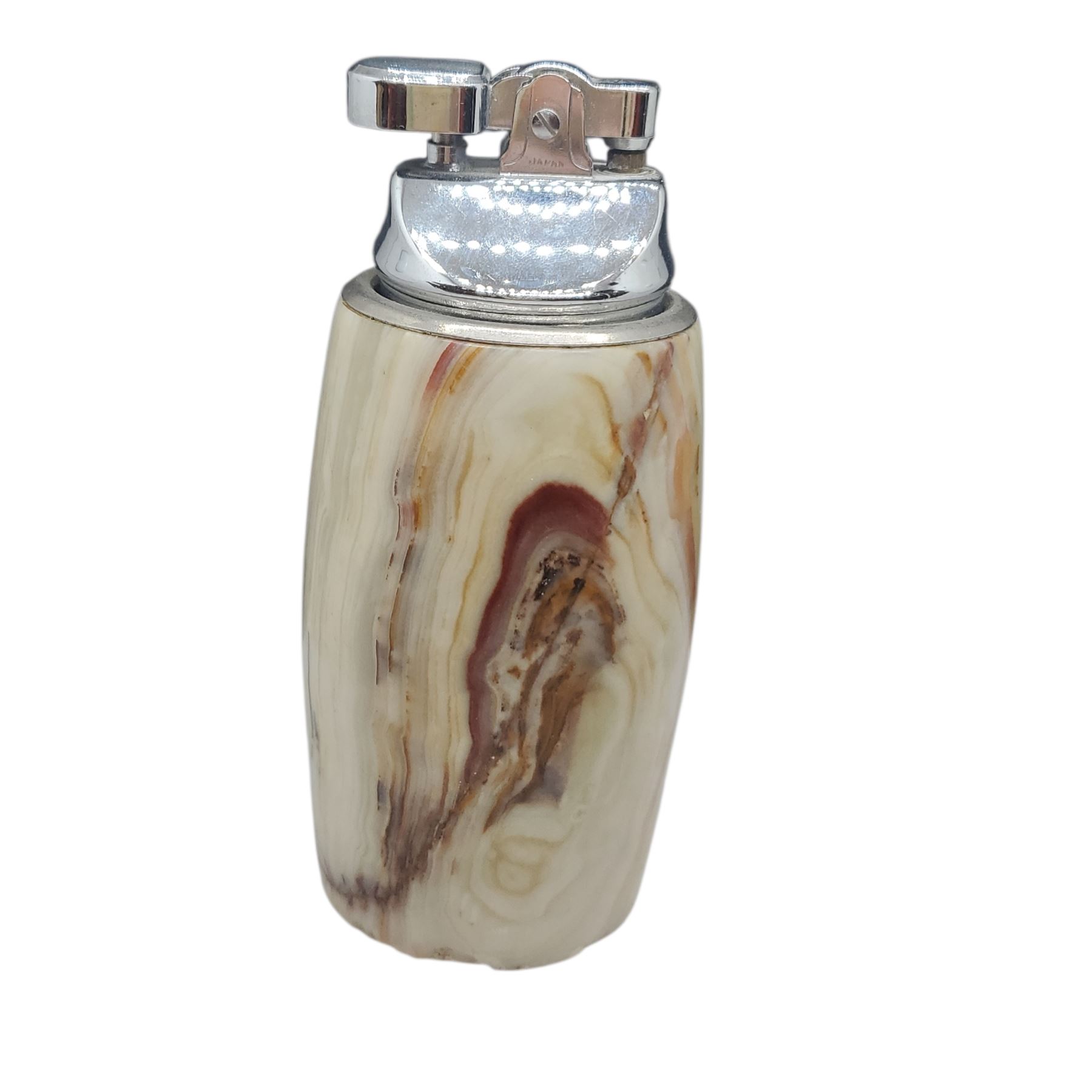 Vintage 1960s Italian table lighter, part of a handcrafted mid-century onyx smoking set. Features a polished natural onyx stone base with distinctive banded patterns and a chrome Penguin lift-arm lighter mechanism. These lighters were often attributed to designers like Romano Bianchi and sold with matching ashtray and cigarette box.