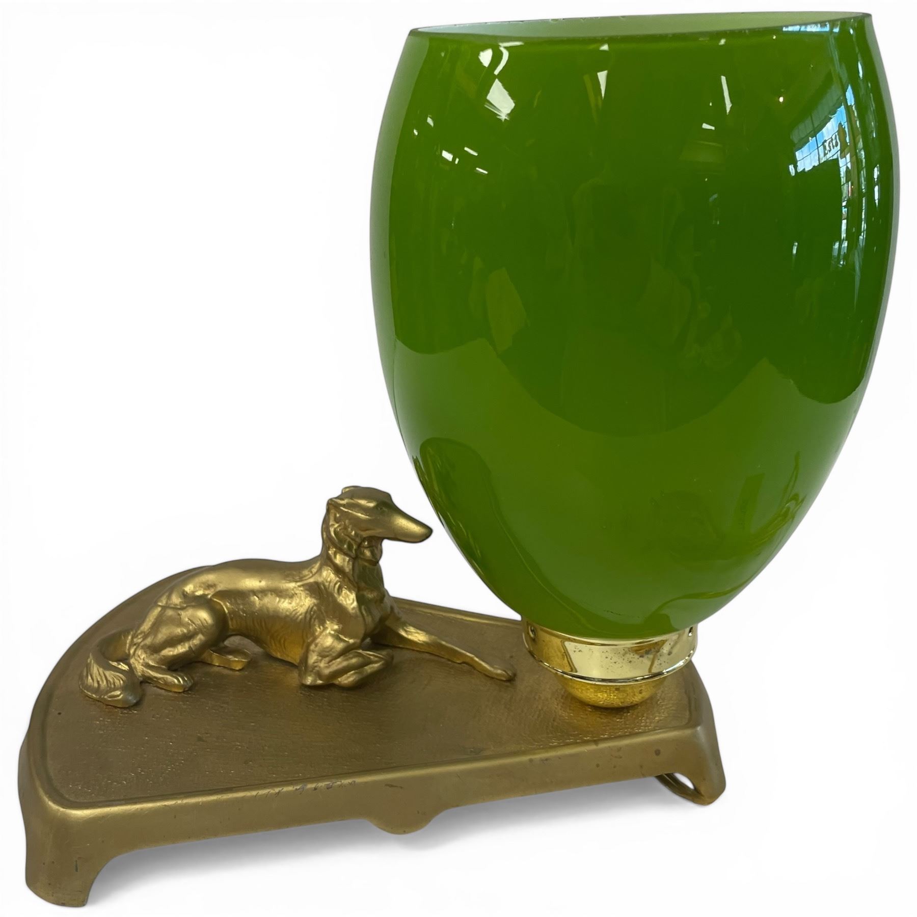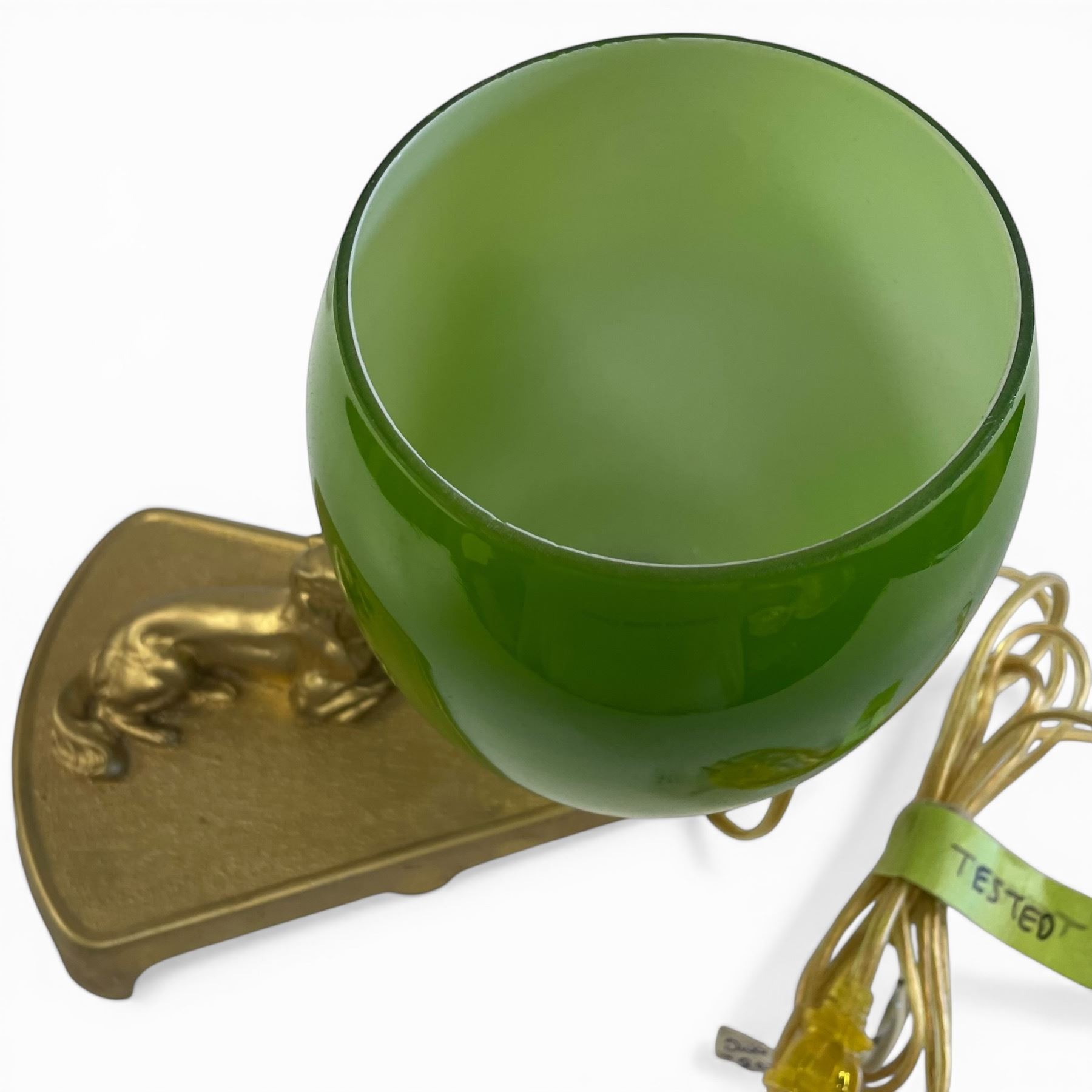 1960s Murano Glass Lamp, Brass Base with Dog Figurine and Green Glass Shade with Opaline Interior. Bottom of glass has damage but not noticeable when shade is in place.