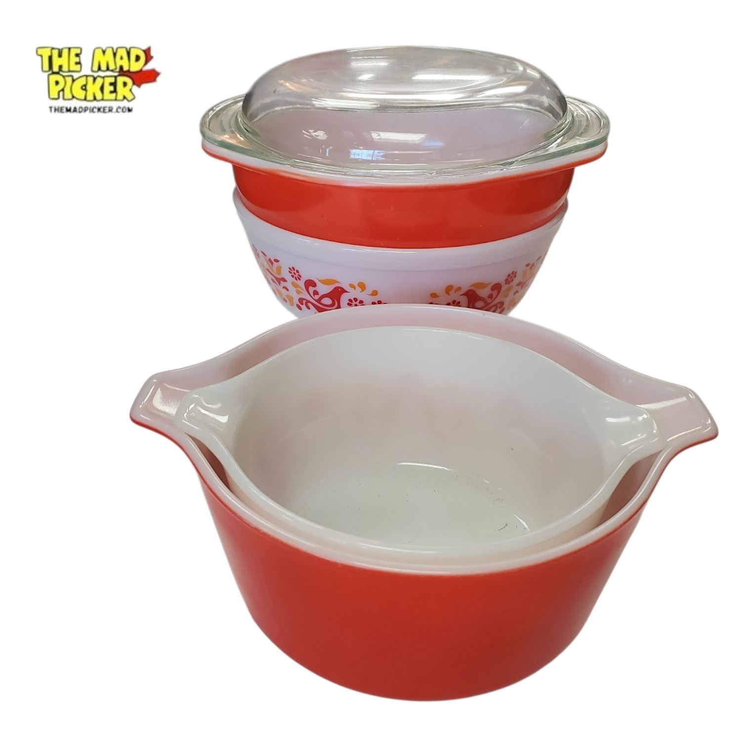 1960s Pyrex Friendship Nesting Bowls Set of 4 with 1 Lid . Features iconic red and orange bird pattern. Includes one lid. Bowls are made of opal glass; the Friendship pattern was part of Pyrex's promotional collections. Popular for its vibrant design and durability, produced by Corning Glass Works in the USA.