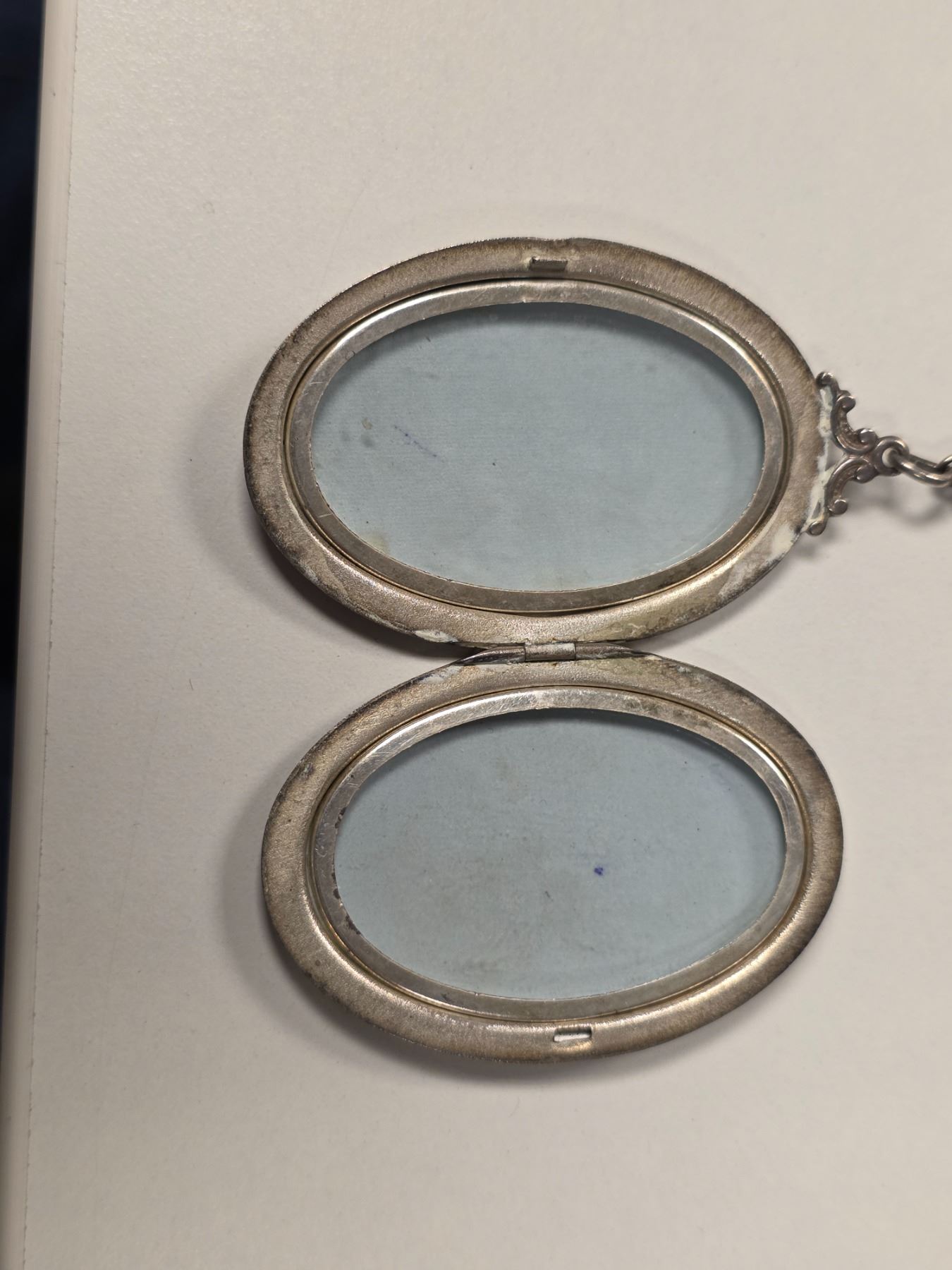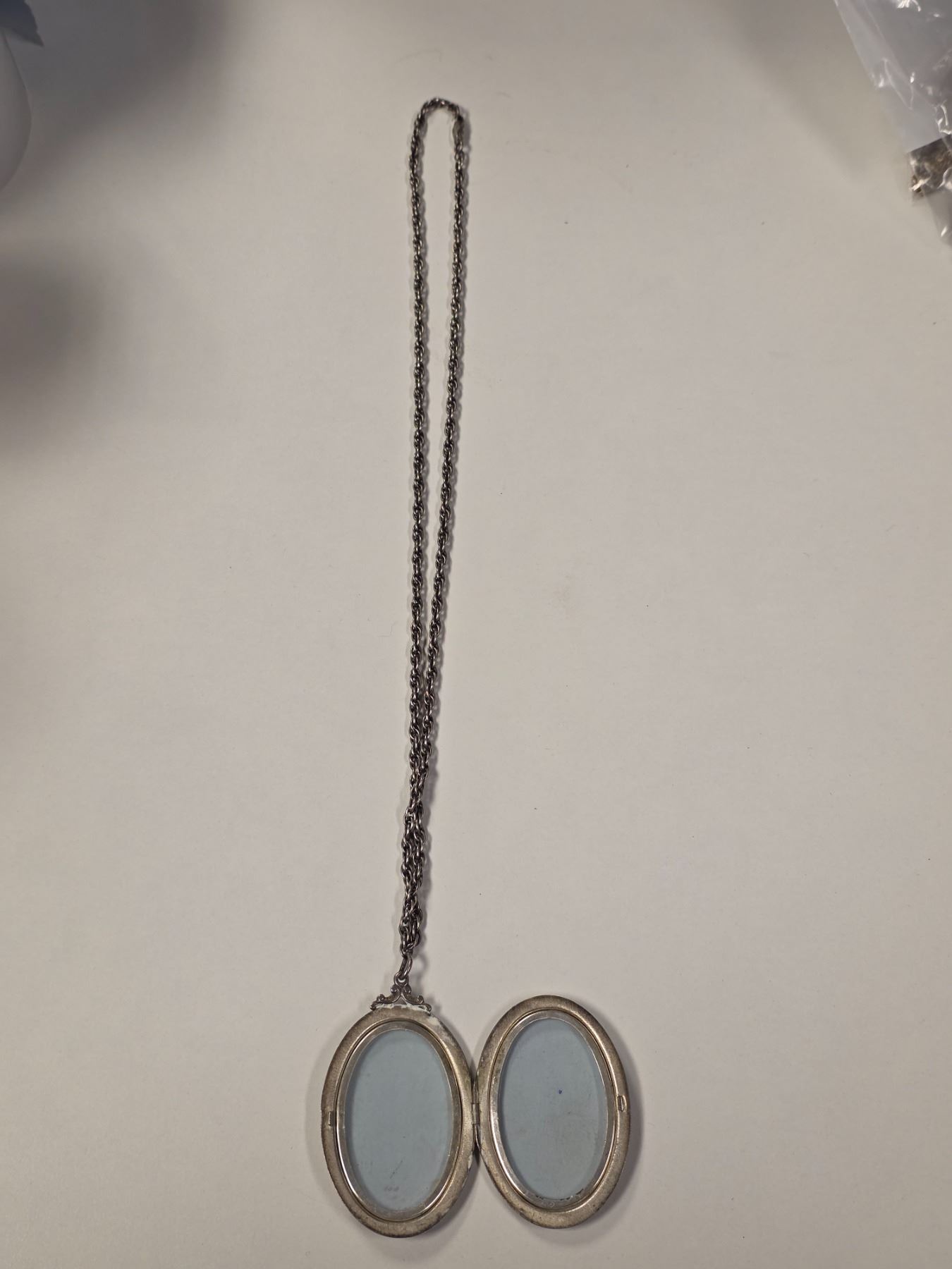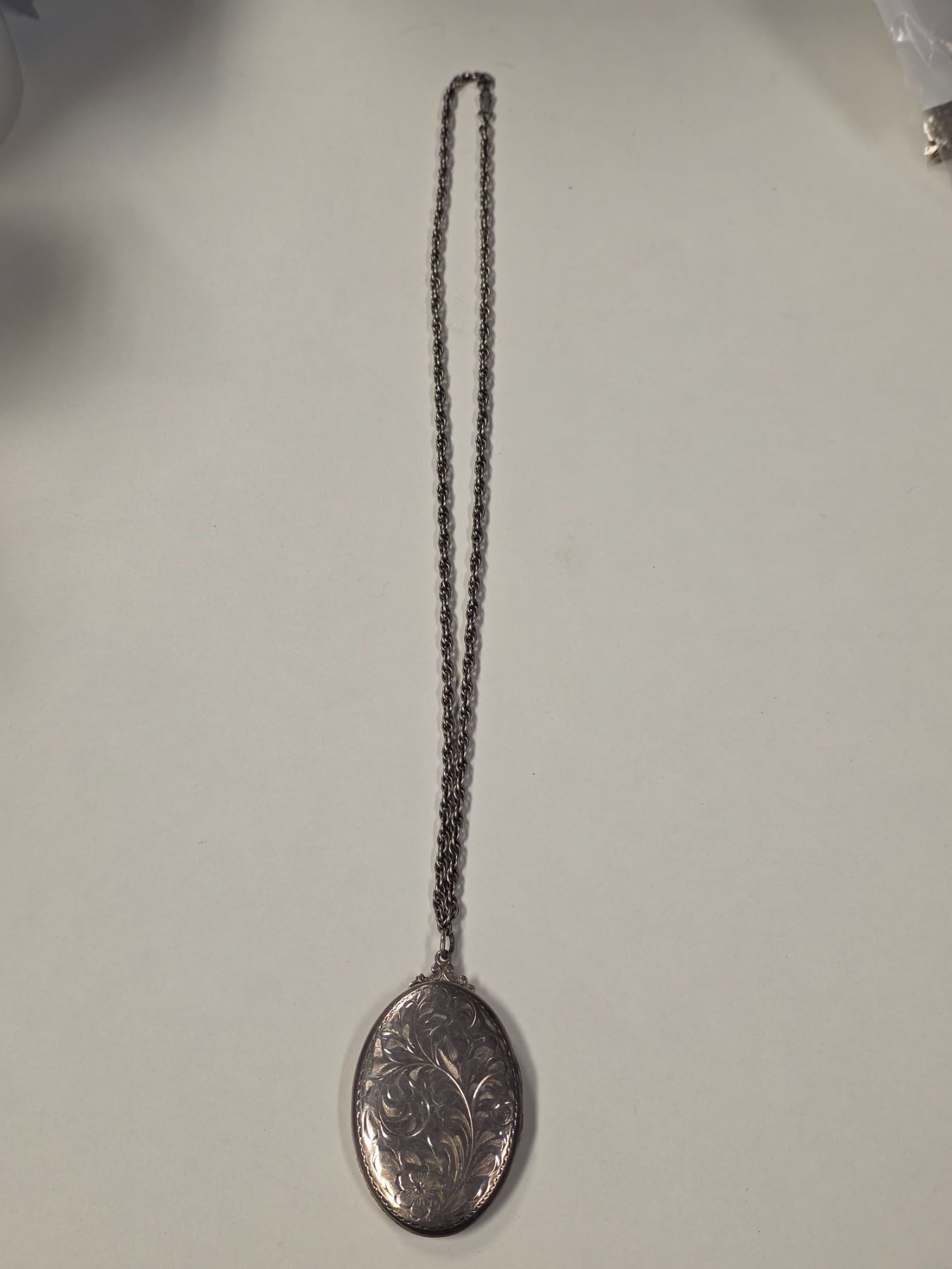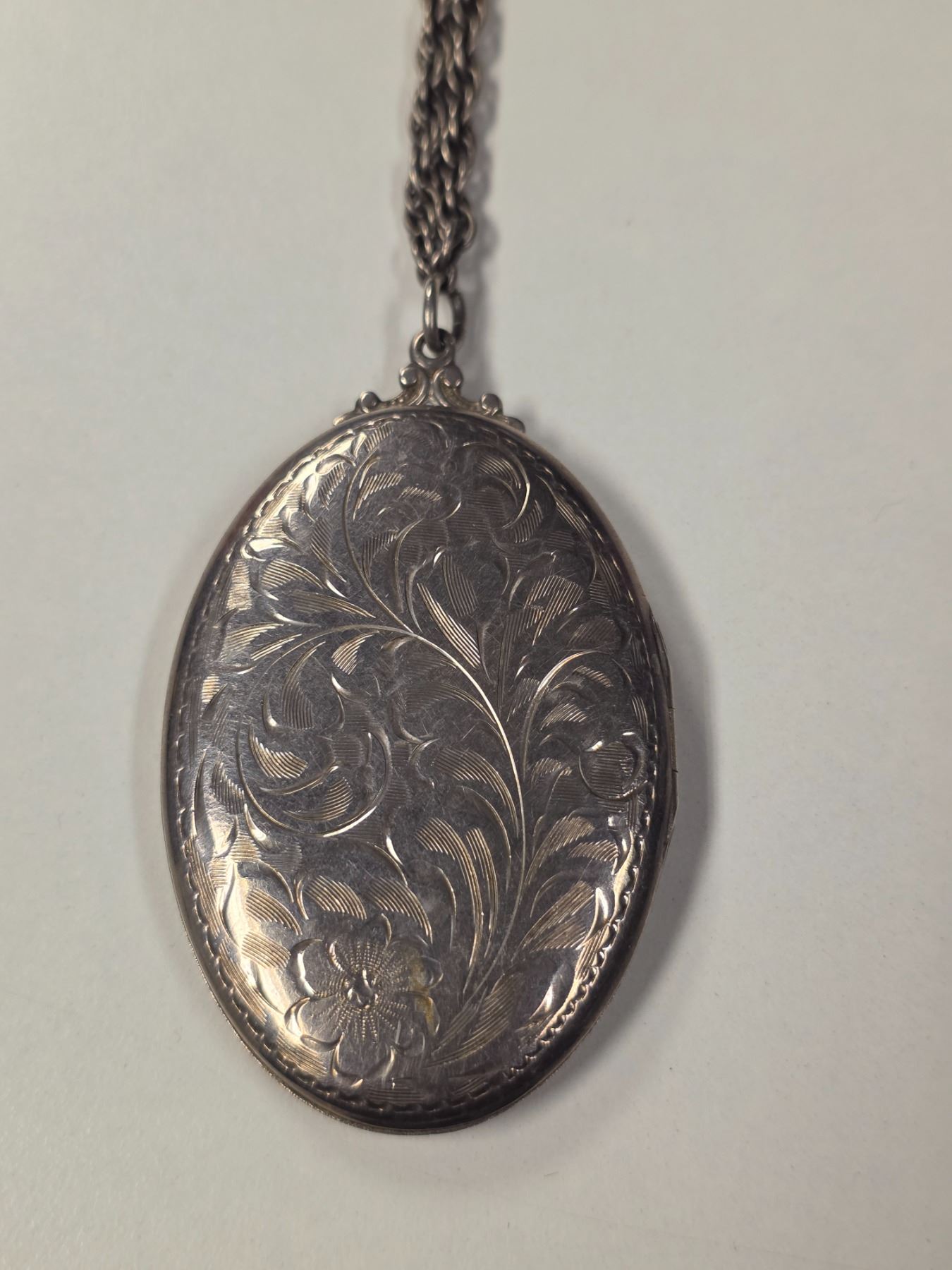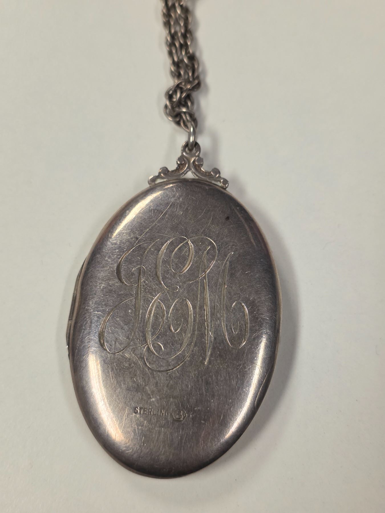 1960s Sterling Silver Large Oval Locket on 22" Sterling Chain - Total weight: 40 grams - Locket measures 39.5 x 57mm - Initials "J.E.M" engraved on the back