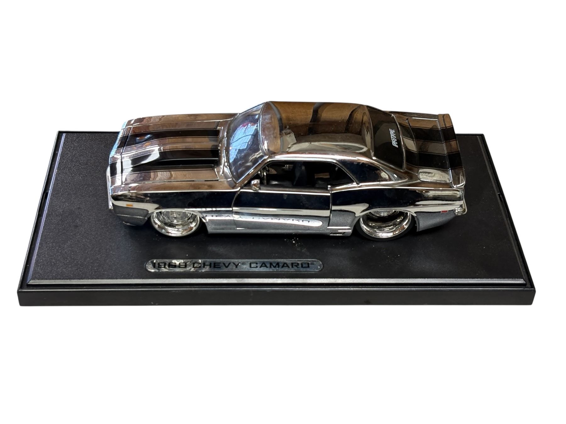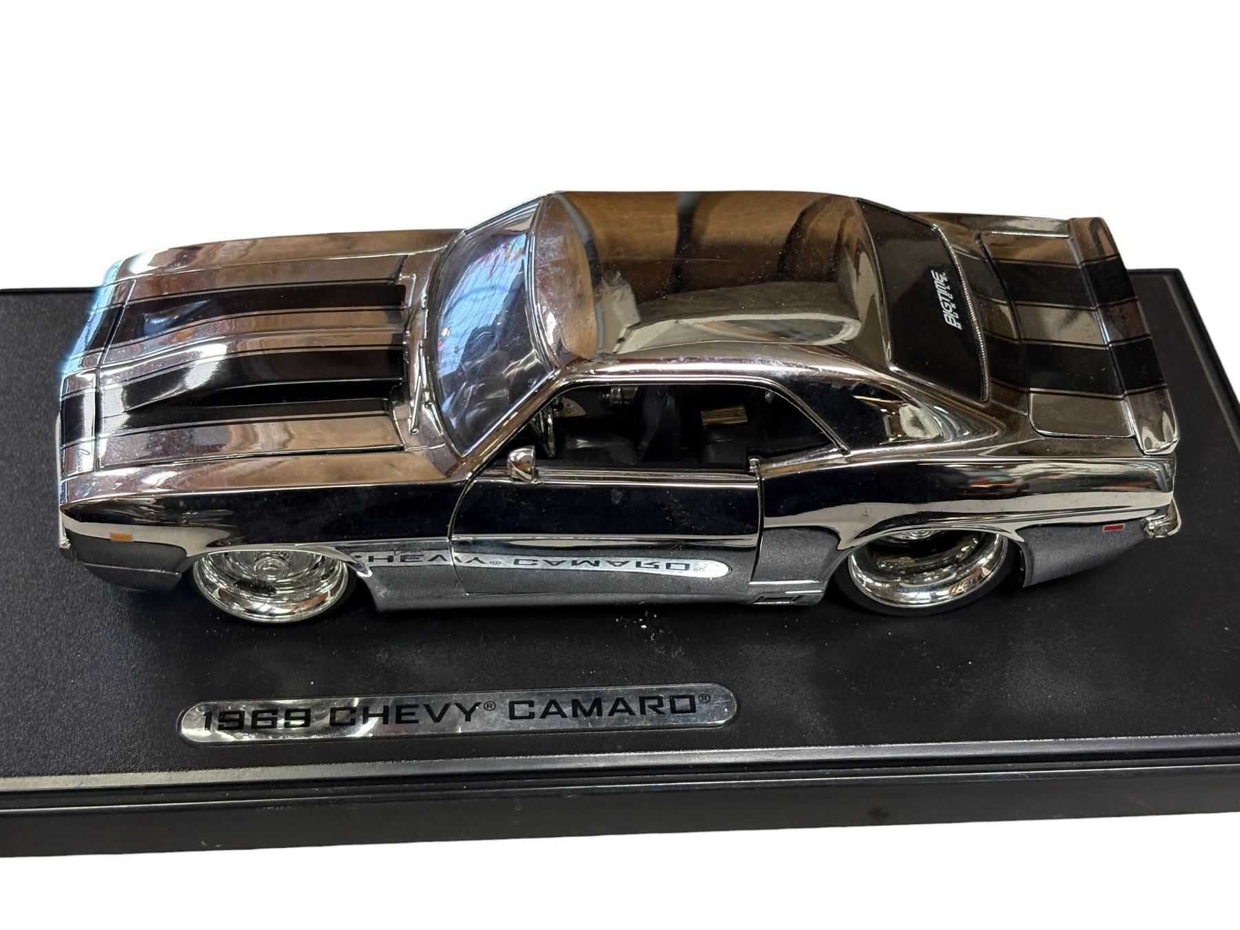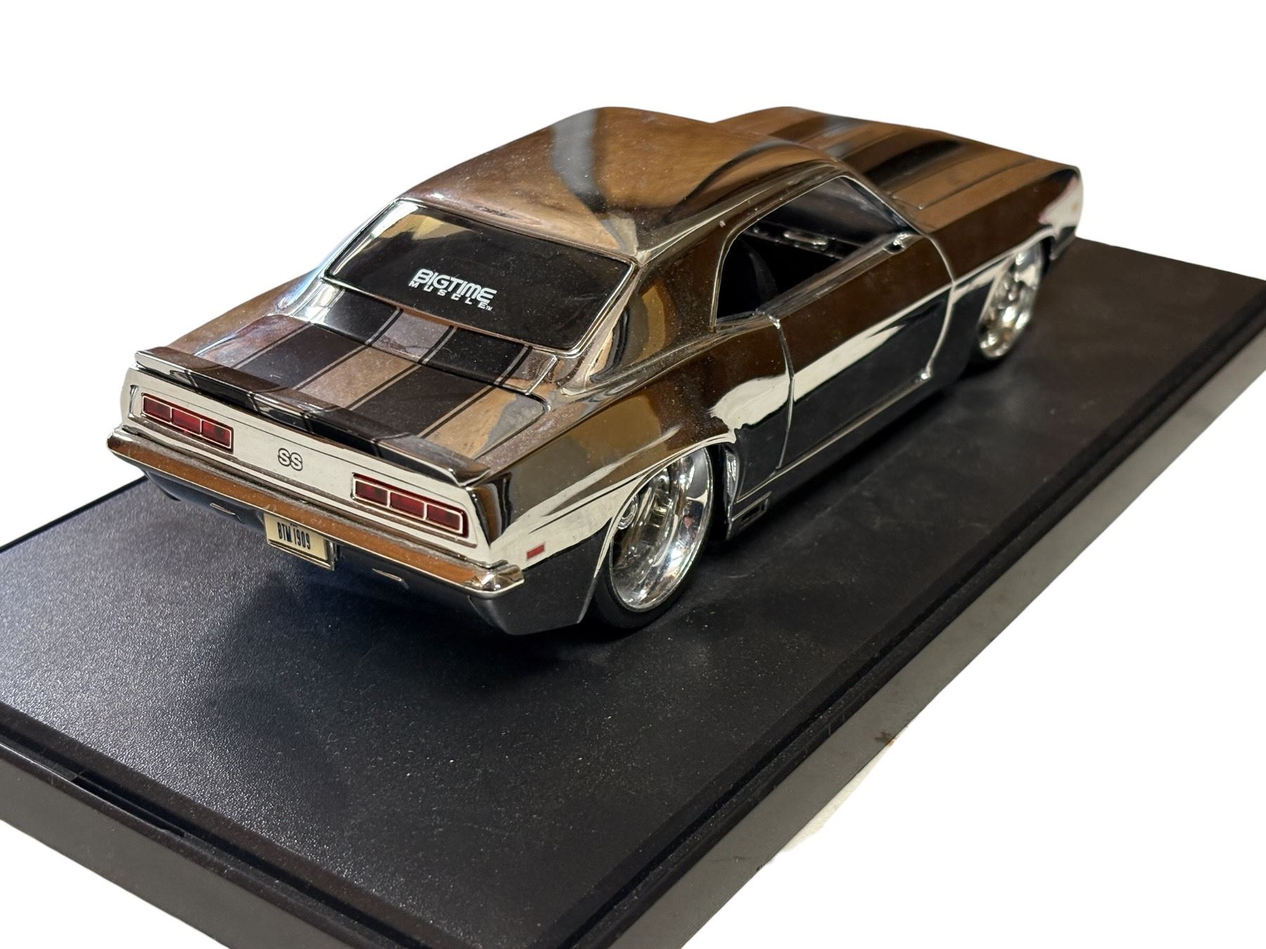 1:24 scale diecast model of a 1969 Chevy Camaro by Jada Toys under the Bigtime Muscle series. Features include detailed interior and exterior, realistic wheels, and opening doors. Manufactured for the modern collector, this model showcases the iconic styling of the classic 1969 Camaro.