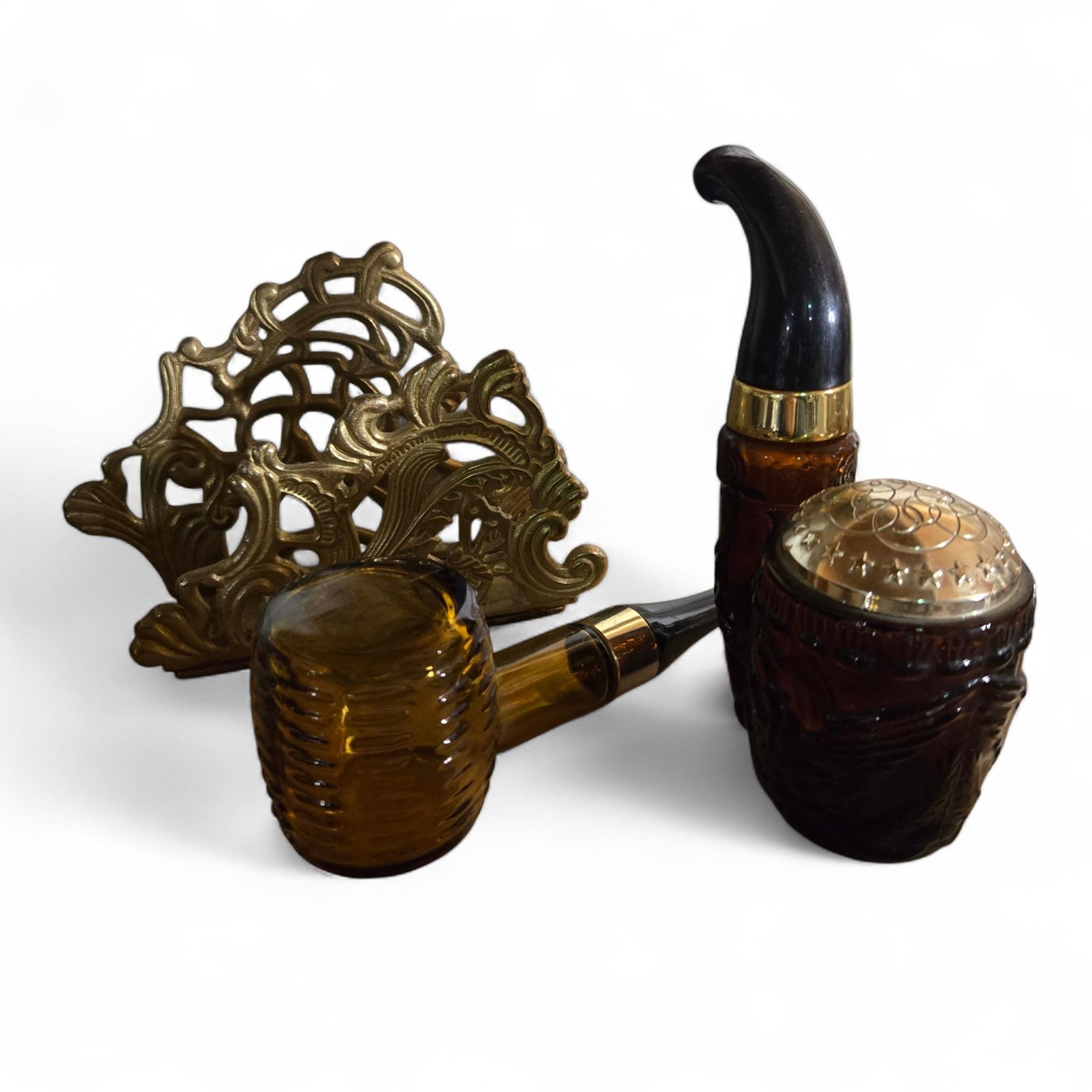 1970s Avon American Eagle Pipe, Corn Cob Pipe, Brass Crumb Catcher and Scraper Set, Scissors, Nakpin Holder, and More
