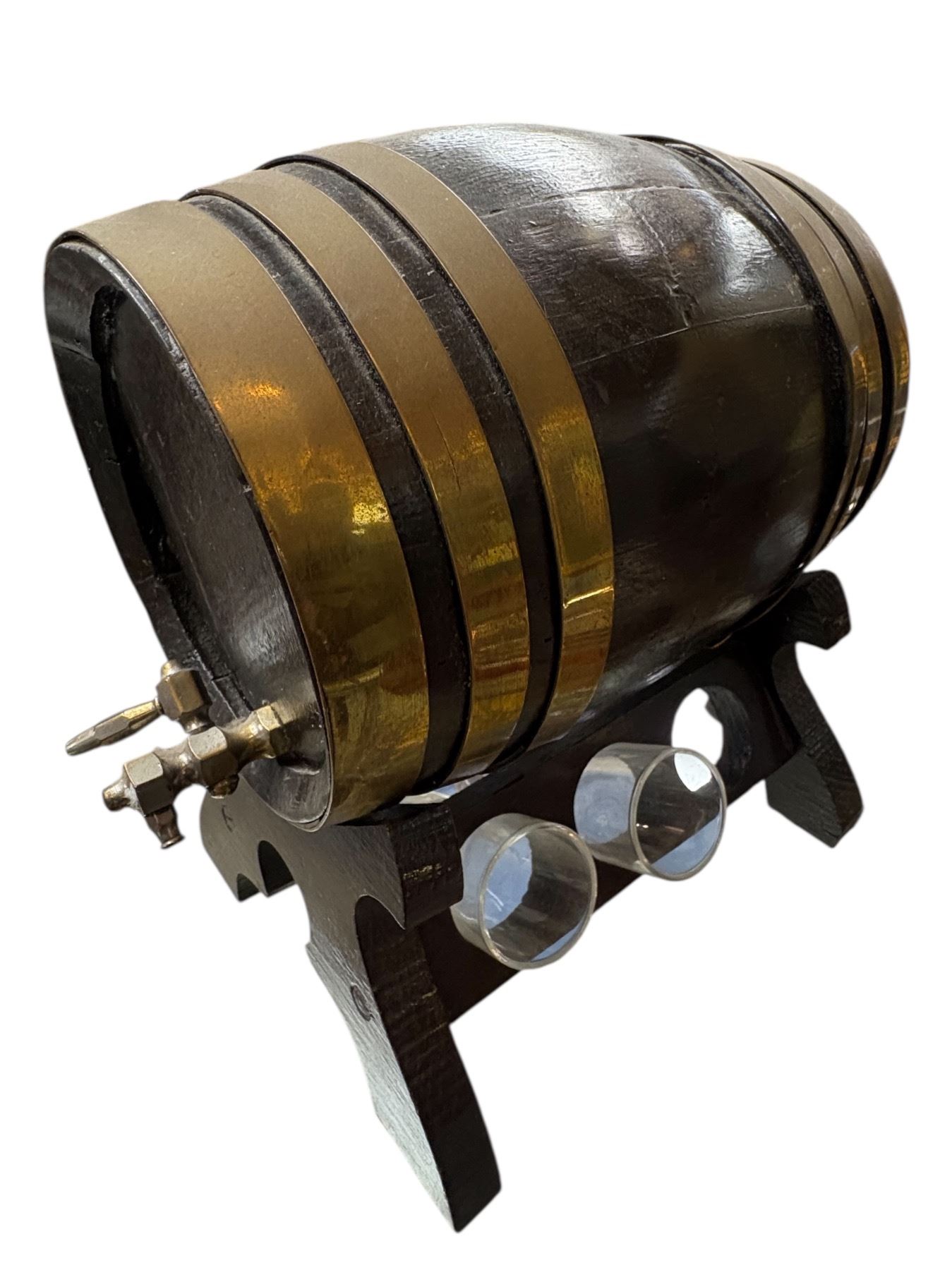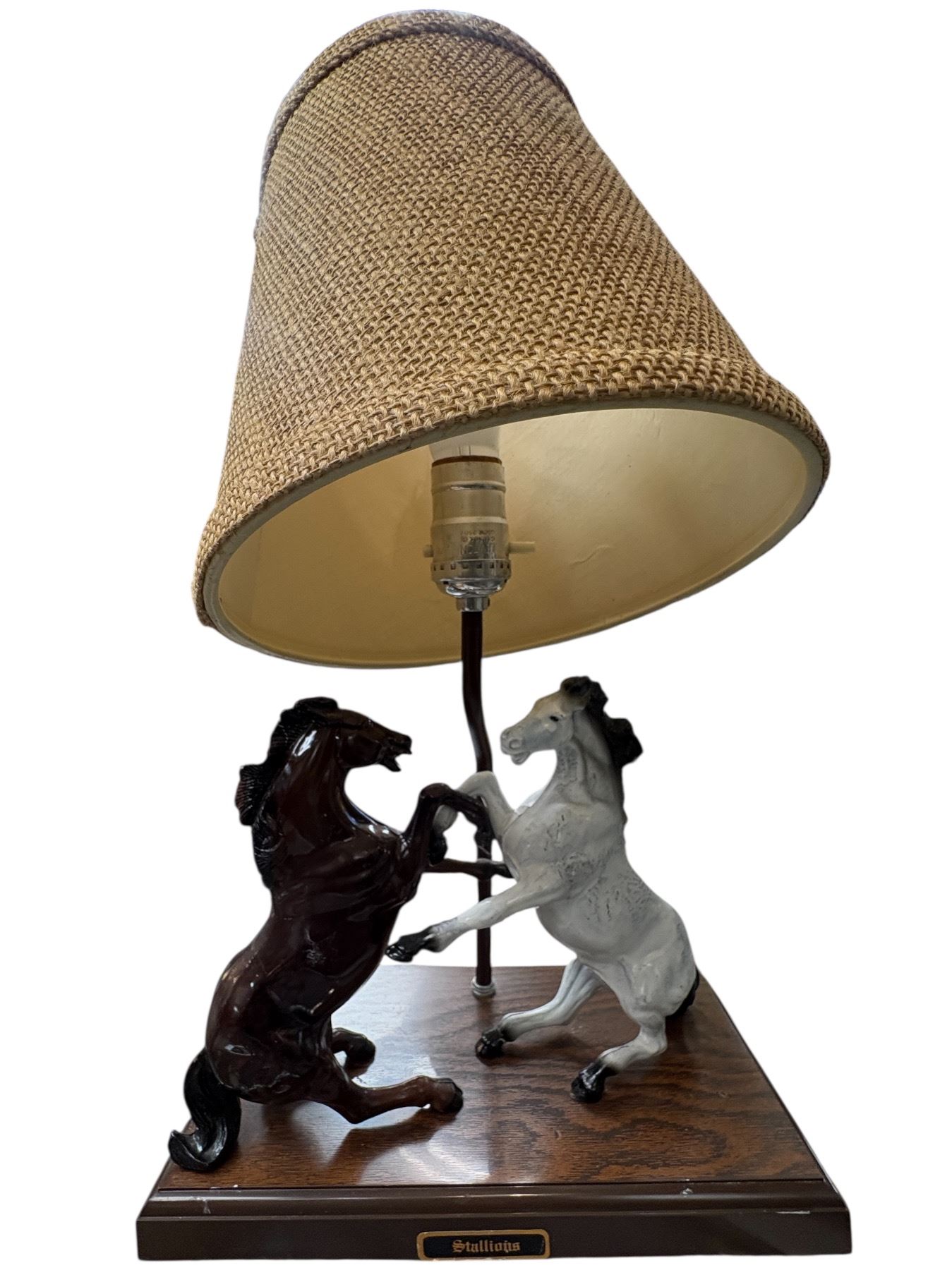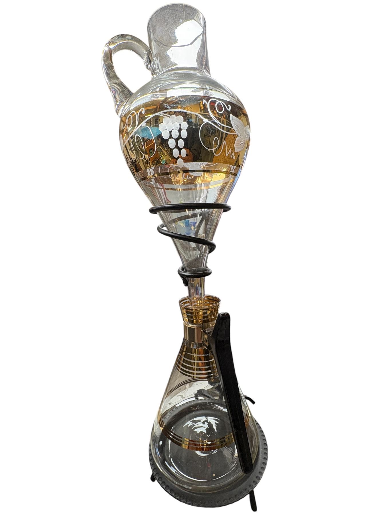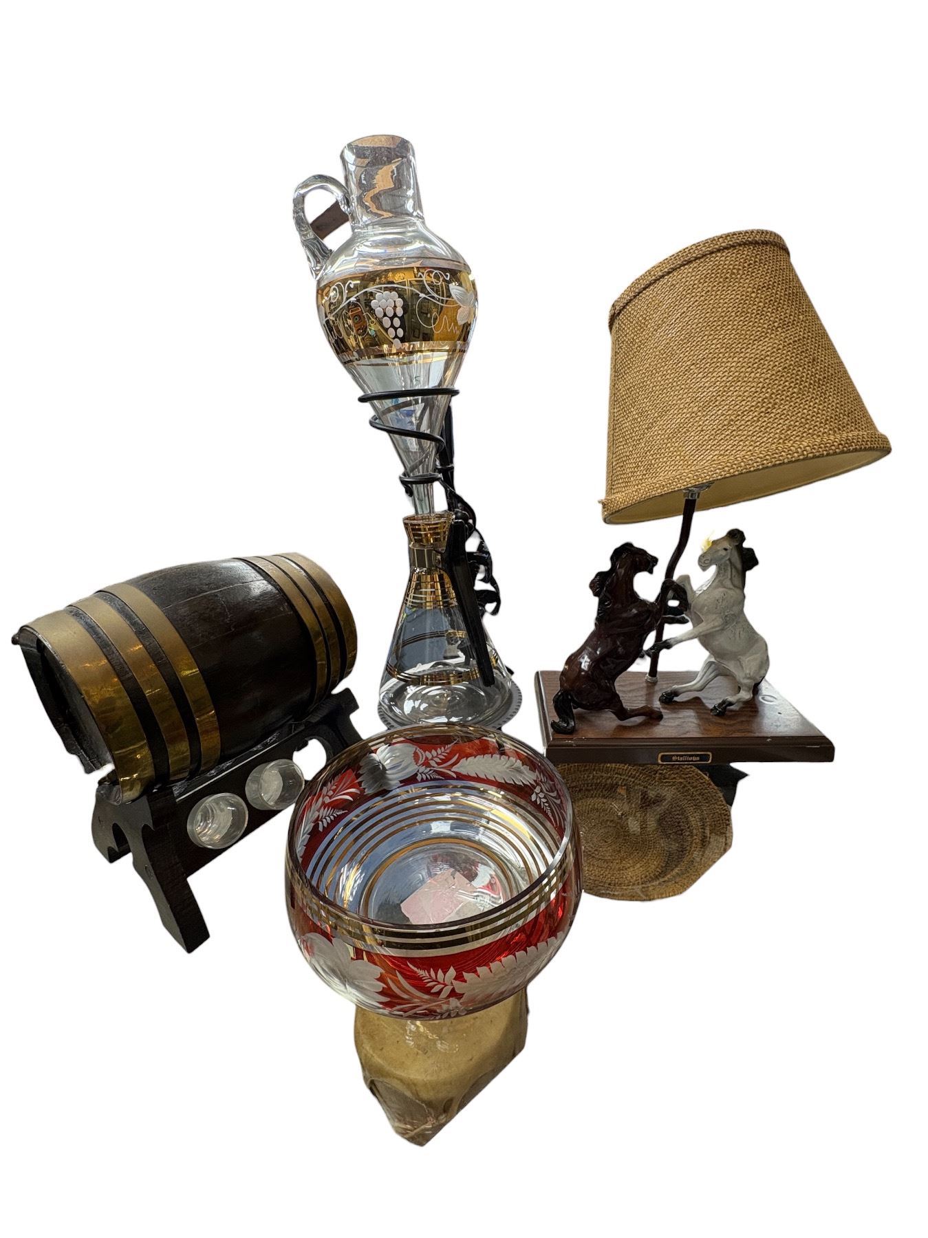 Collection includes a 1970s 21-inch tall wine stand, a barrel, a Bohemia ruby crystal bowl, and a lamp featuring horse figures in rearing and fighting poses. Bohemia crystal known for its high-quality craftsmanship. Distinctive vintage pieces reflecting the art and decor style of the 1970s.