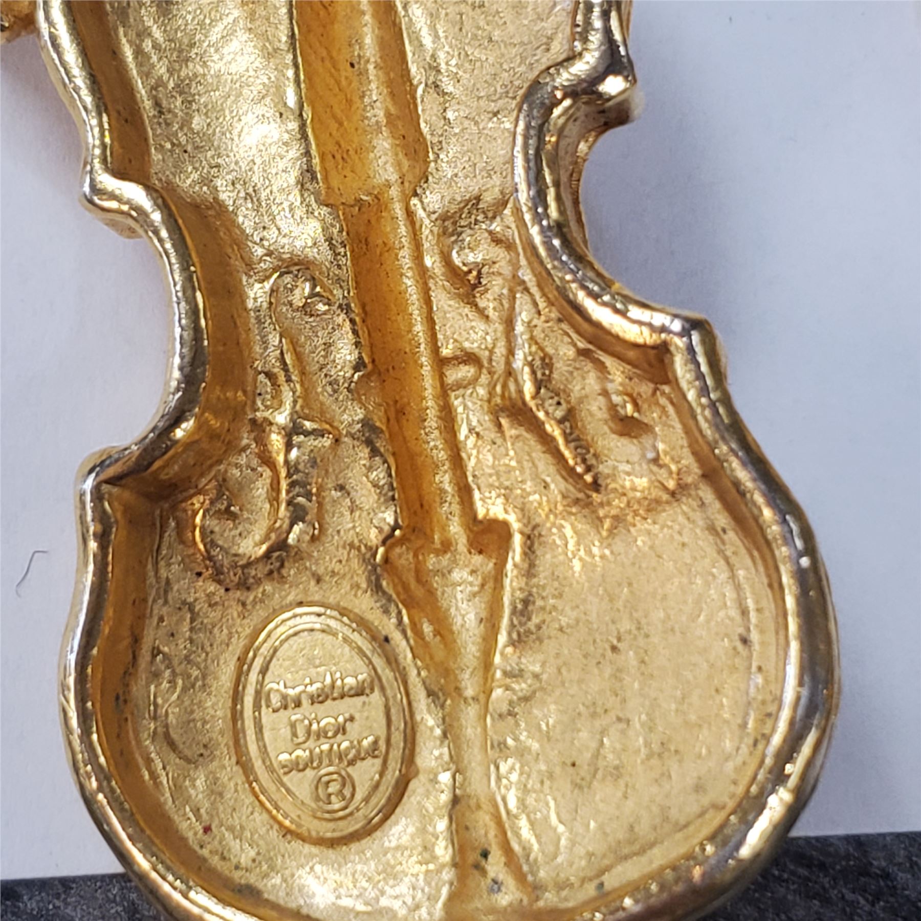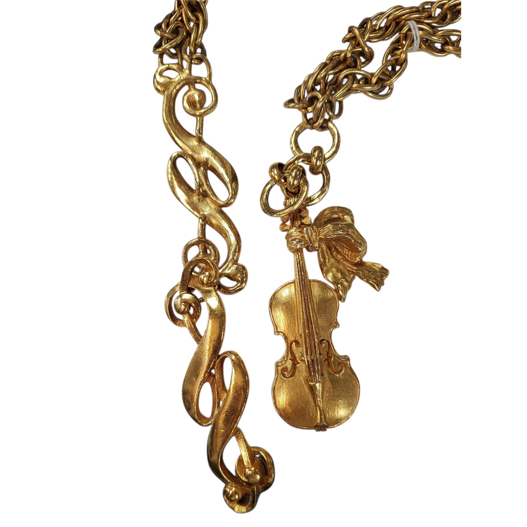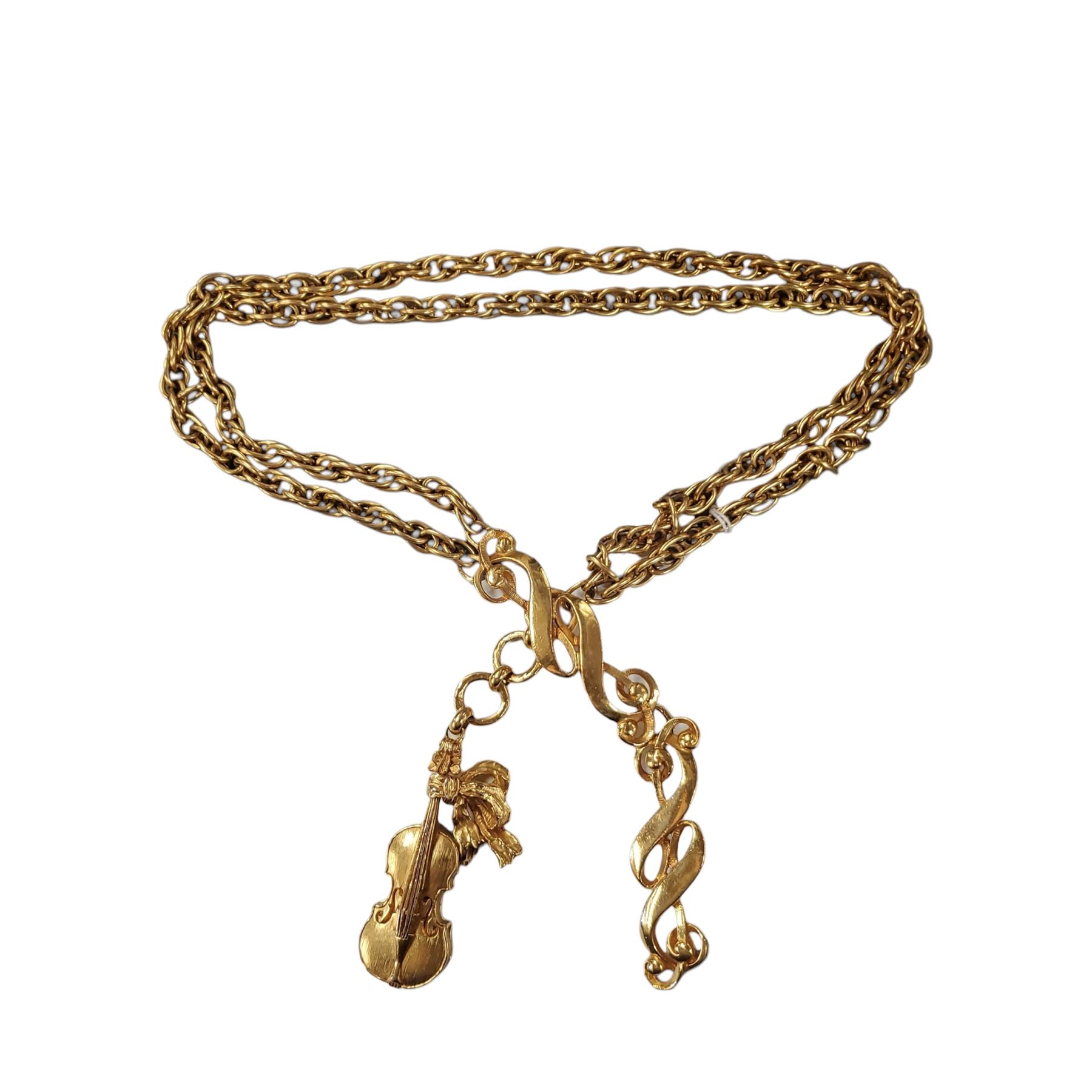 1970s Christian Dior Gold-Tone Sautoir Necklace * Large Links with a Violin Charm * Can be worn as a 26" Belt * Stamped "Christian Dior Boutique on the Violin"