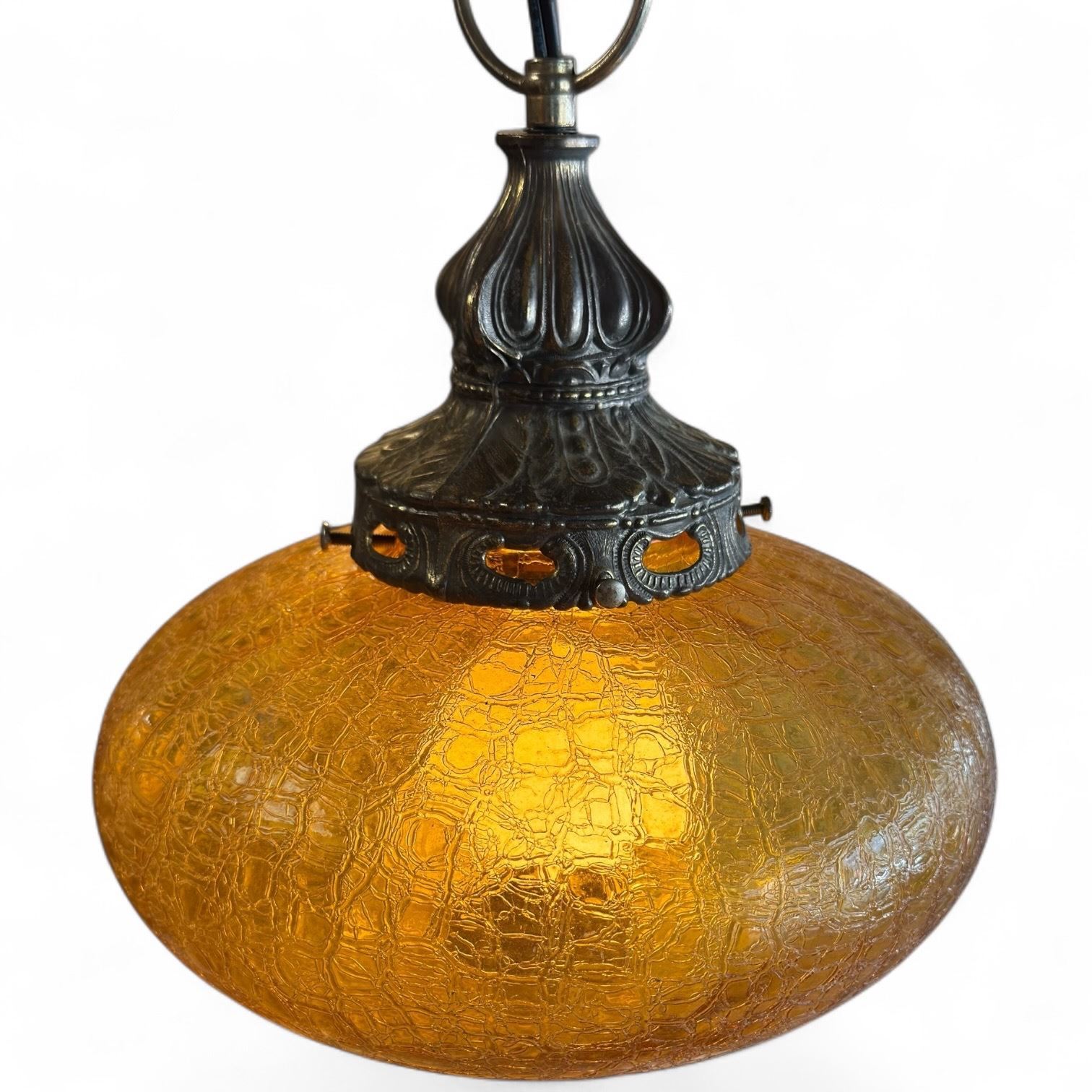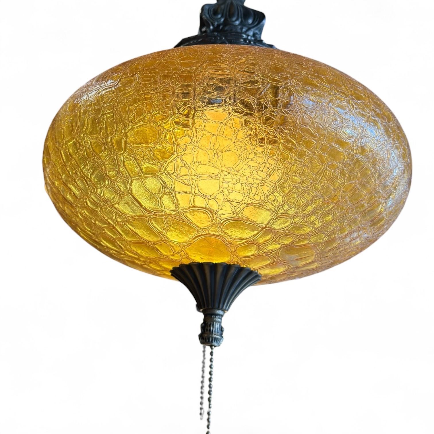 1970s Swag Lamp with Amber Glass Crackle Shade - Tested and Working