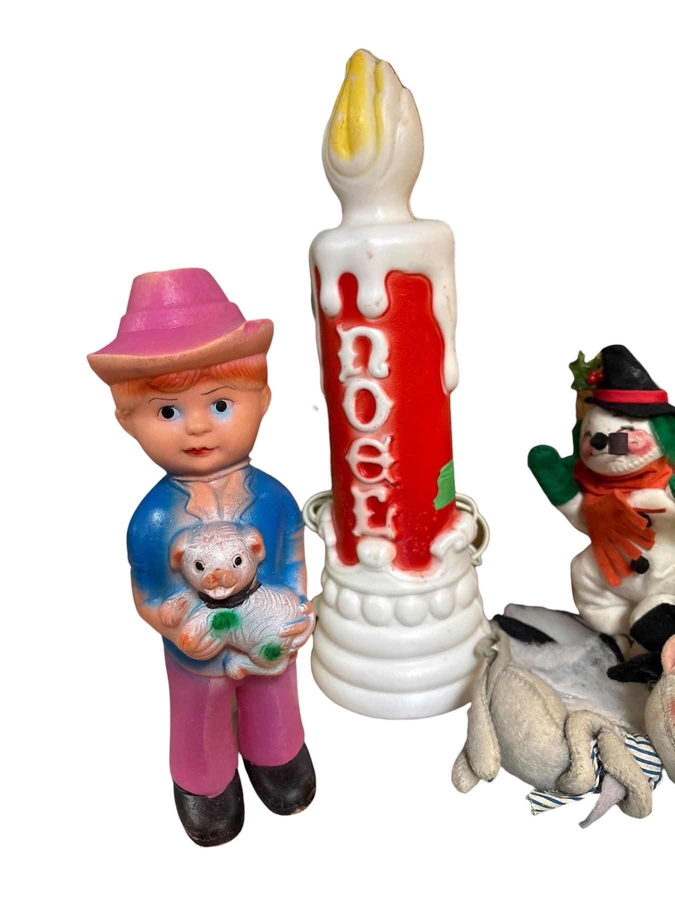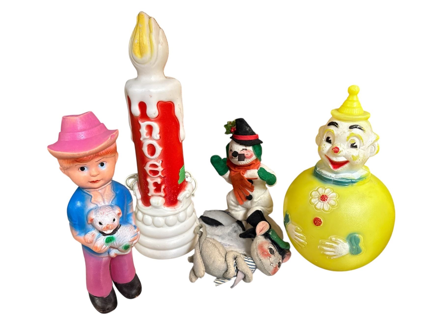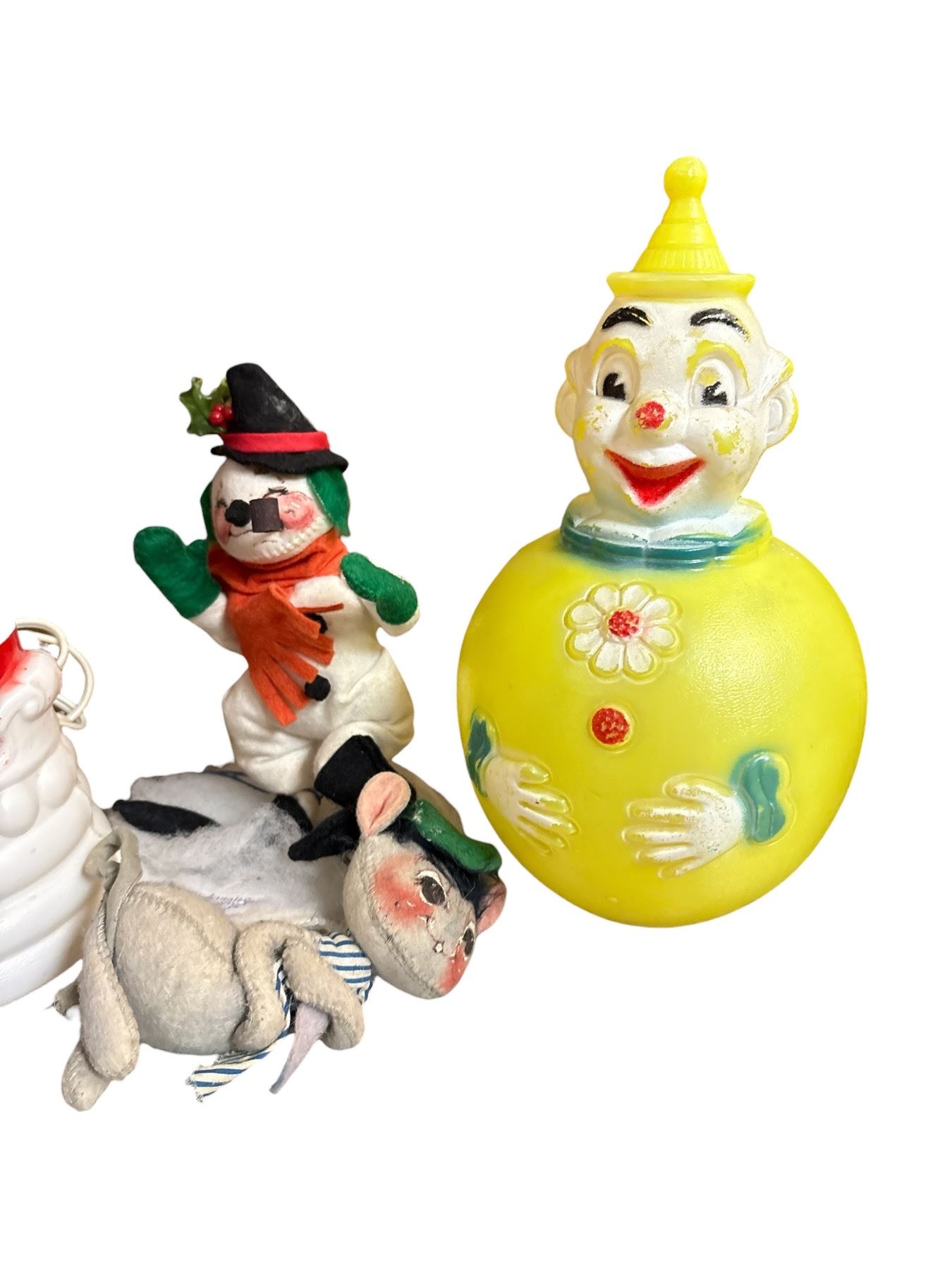 Includes a 1977 Sanitoy Musical Chime Clown Roly Poly toy featuring classic roly-poly design and chime sounds. Bundle also contains vintage Christmas decorations, The clown toy is made of plastic with bright colors typical of late 1970s design. Item is as pictured.