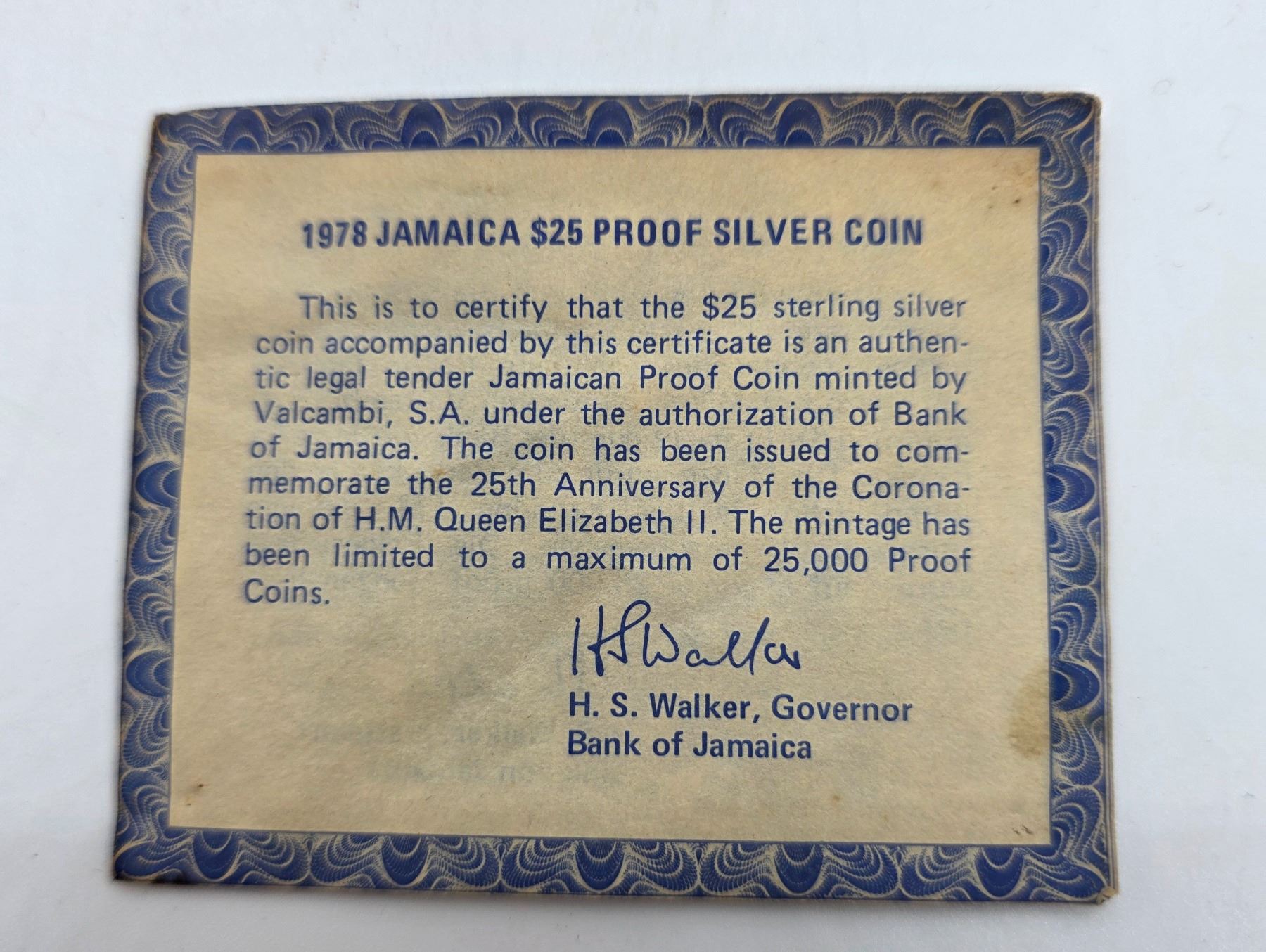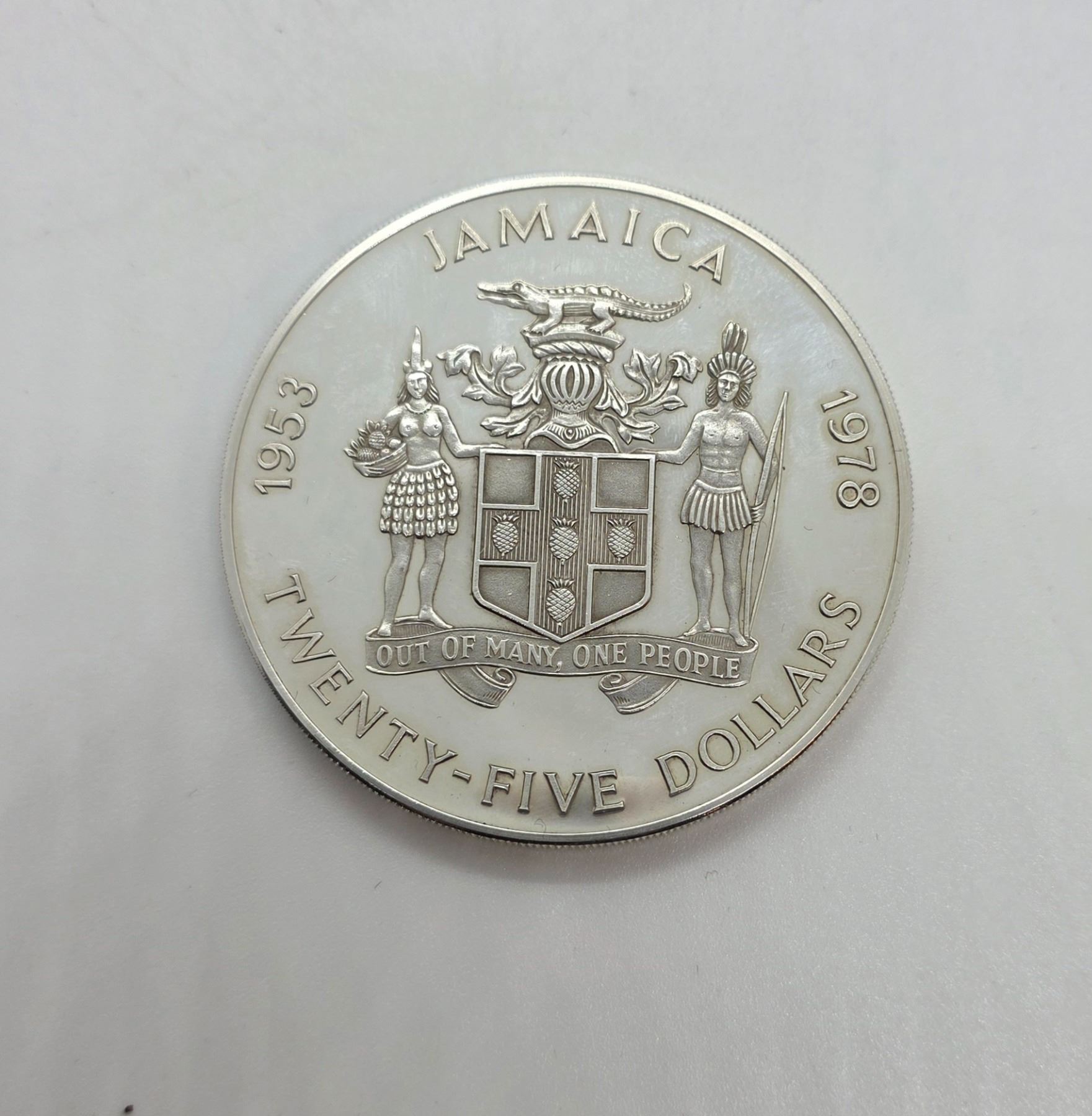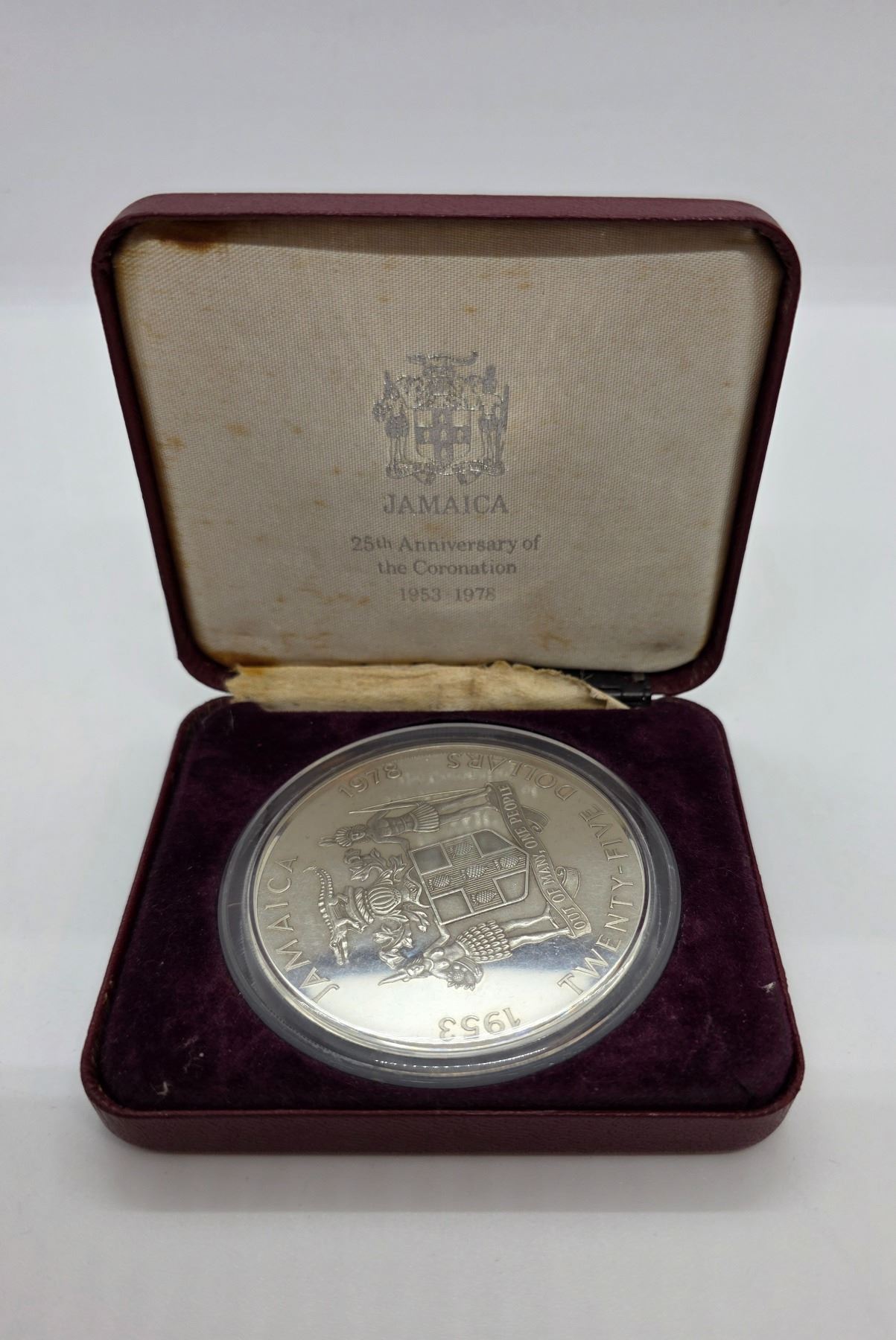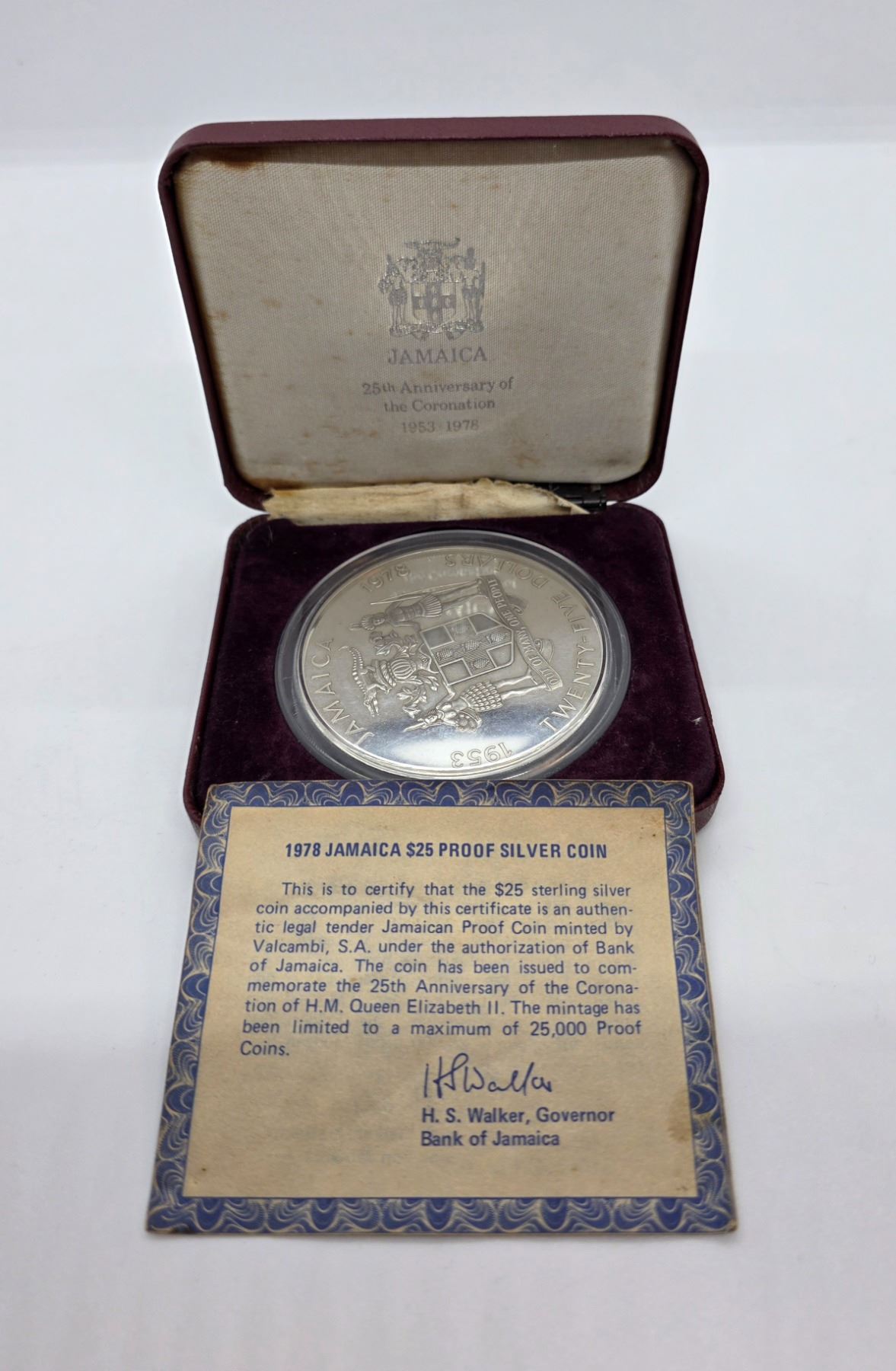 1978 Sterling Silver Jamaica $25 Proof Silver Coin - Weight: 136.08 grams - In original case with COA - Valcambi Mint - 25th Anniversary of the Coronation of Queen Elizabeth II