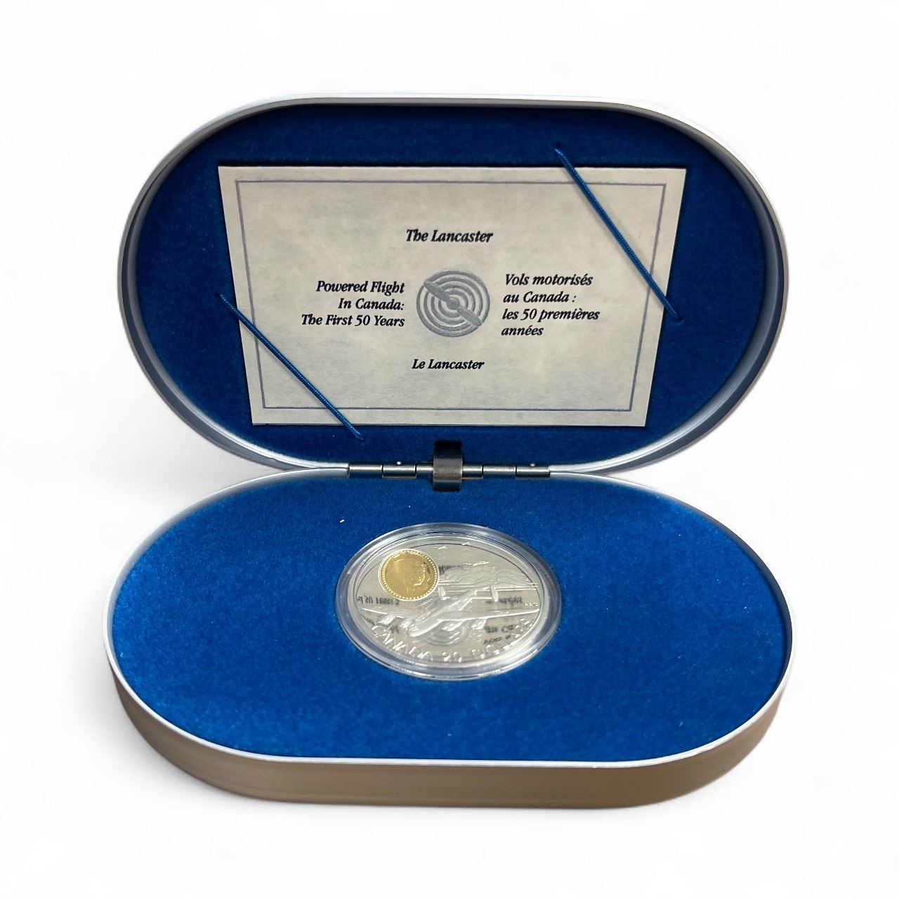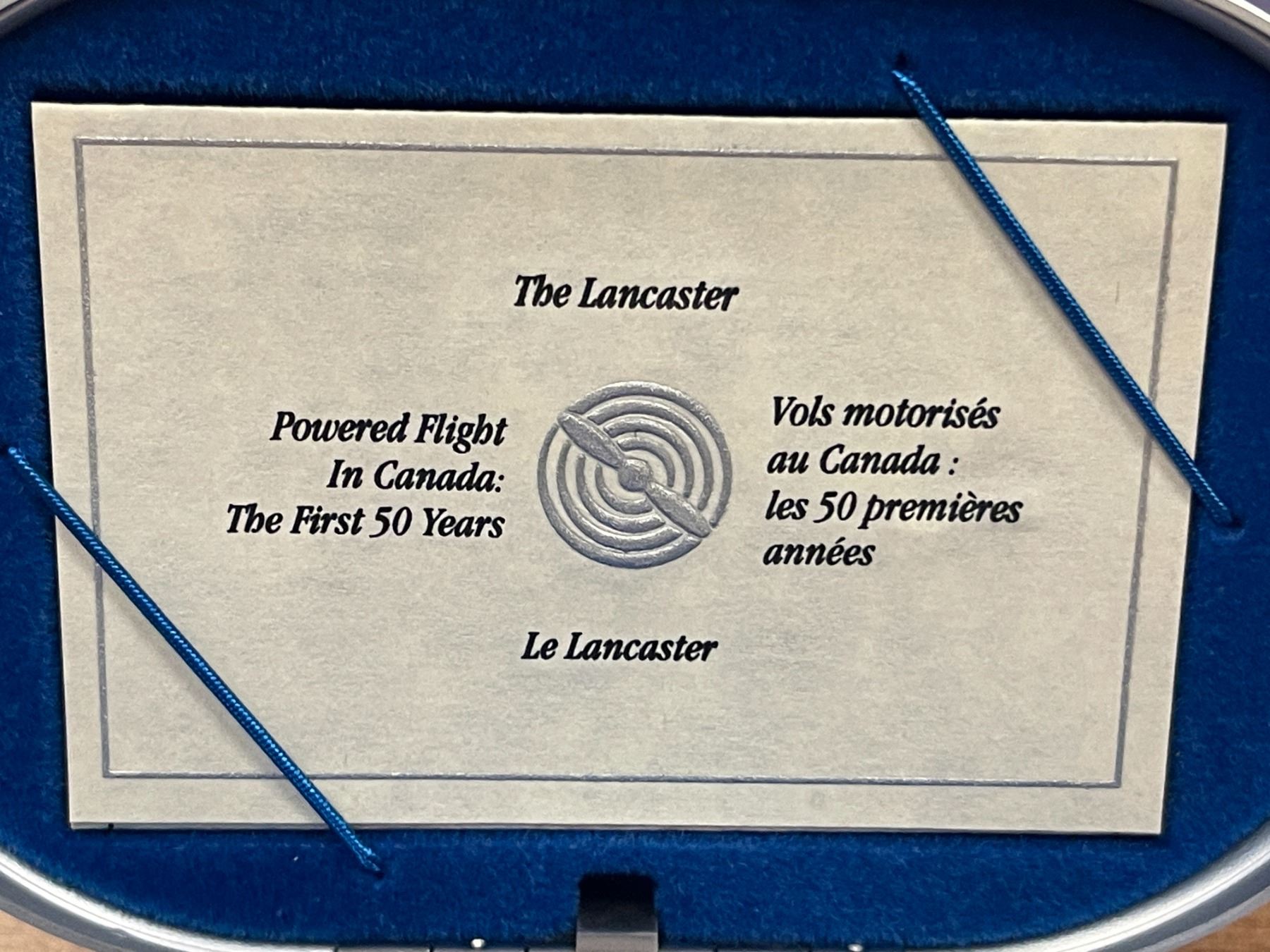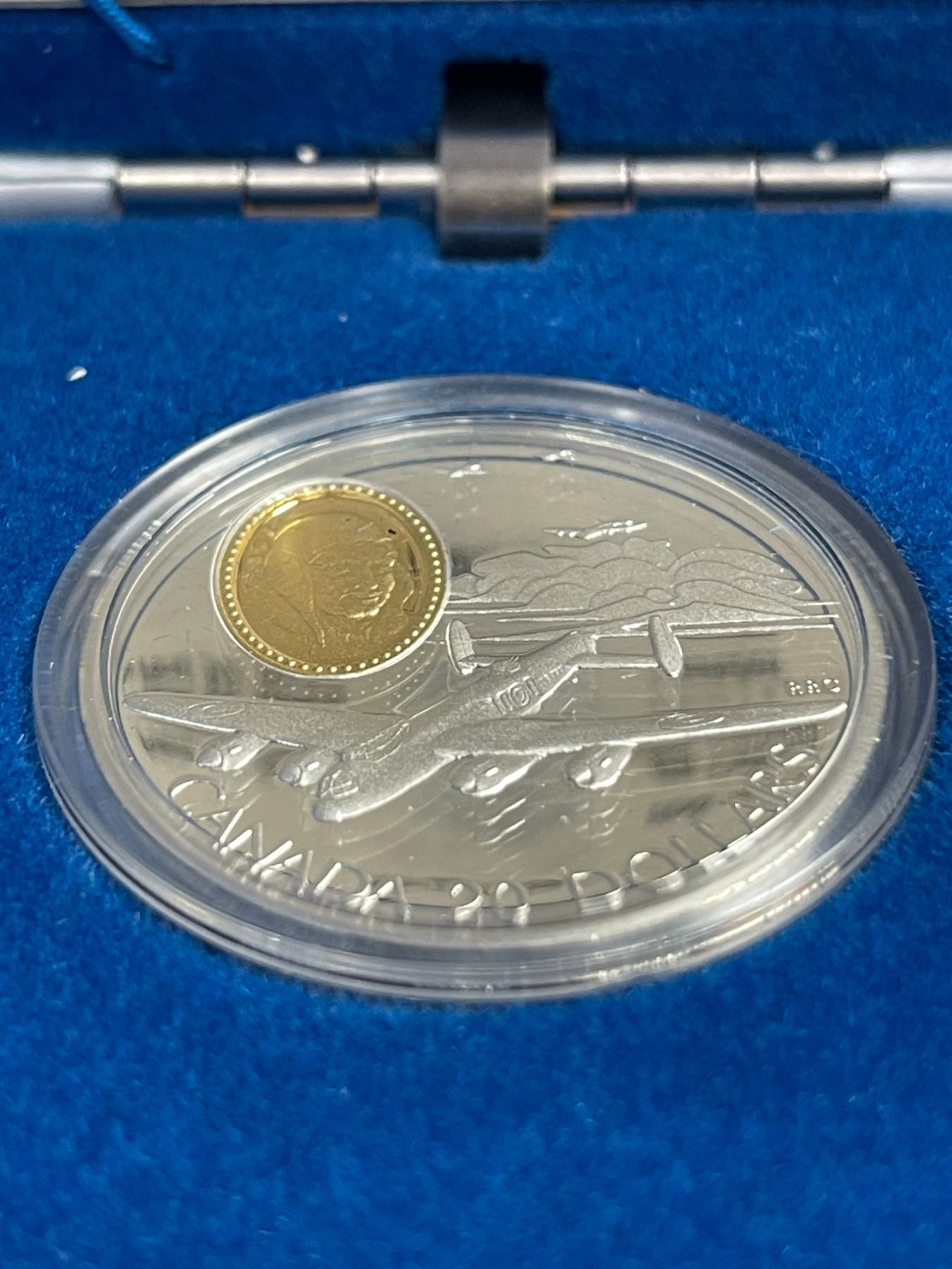 1990 .925 Silver Canadian "The Lancaster" 31.103 grams.. $20 Coin with 24k Gold Covered Cameo - From the "Powered Flight in Canada - First 50 Years Series. In original box and display case with certificate.