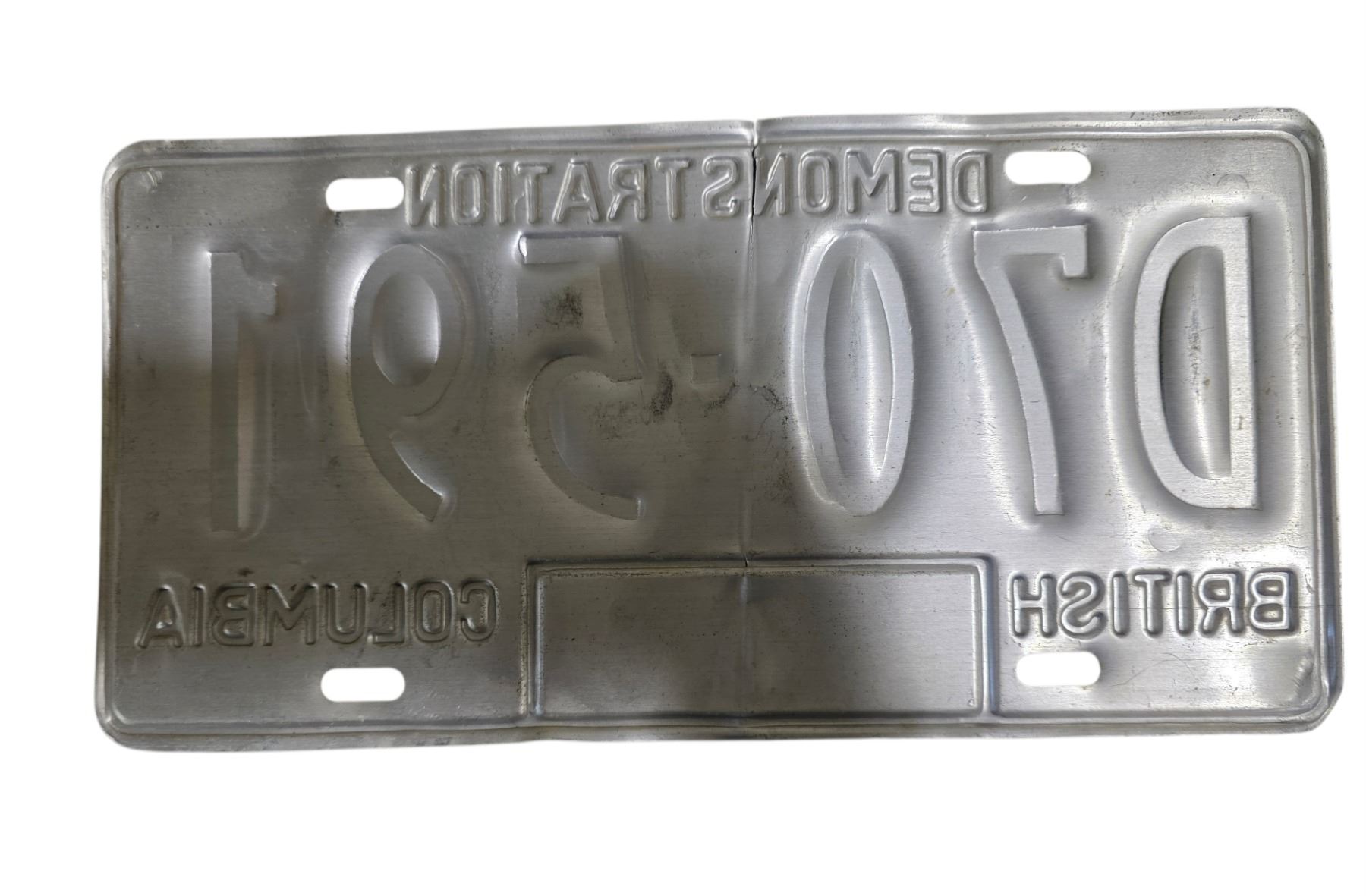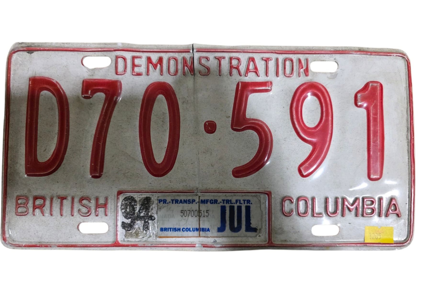 1994 BC Demonstration Licence Plate D70-591 (has been bent in the center)
