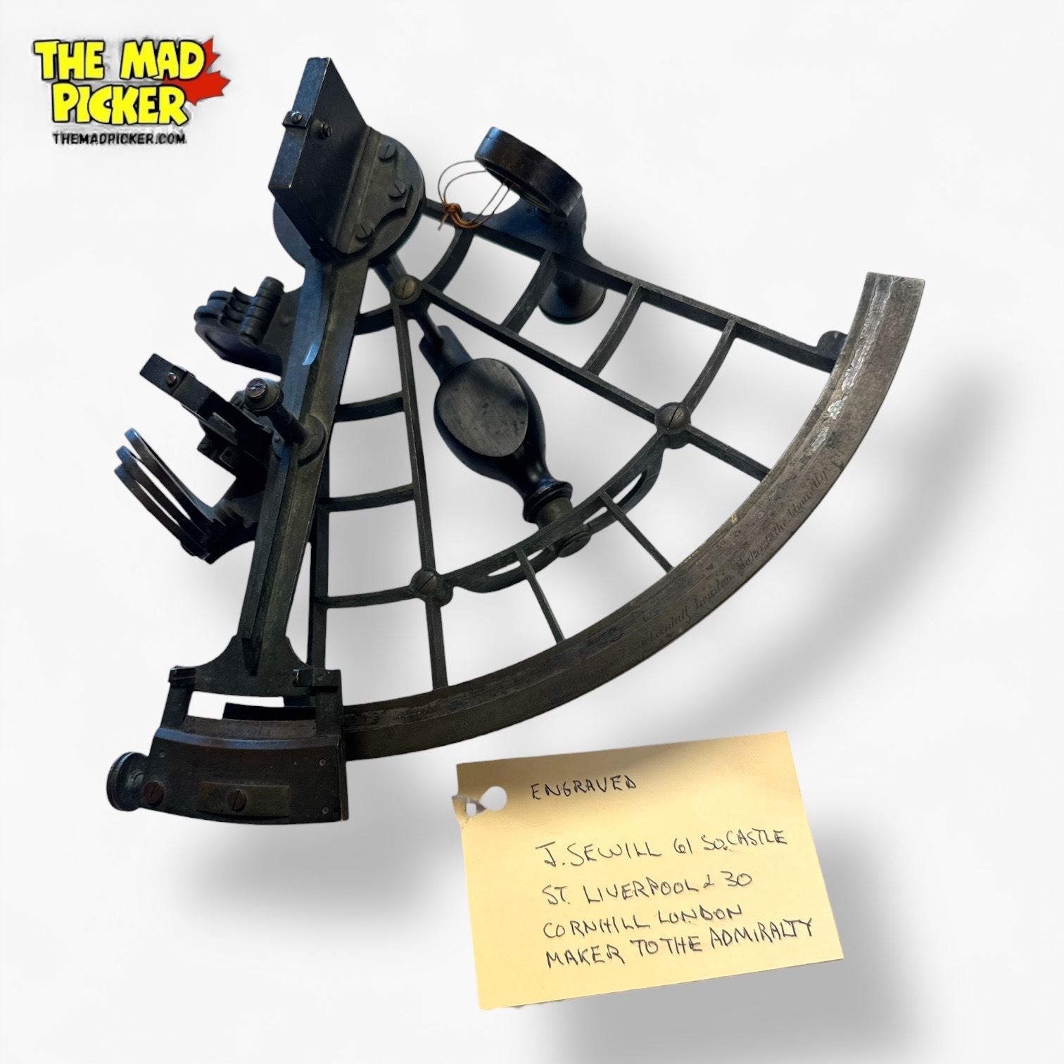 19th-century maritime sextant engraved with 'J. Sewill Maker to the Admiralty'. Features brass frame and wood limb with precision craftsmanship typical of J. Sewill, a renowned maritime instrument maker in Liverpool. Likely used for navigation, reflecting historical nautical technology.